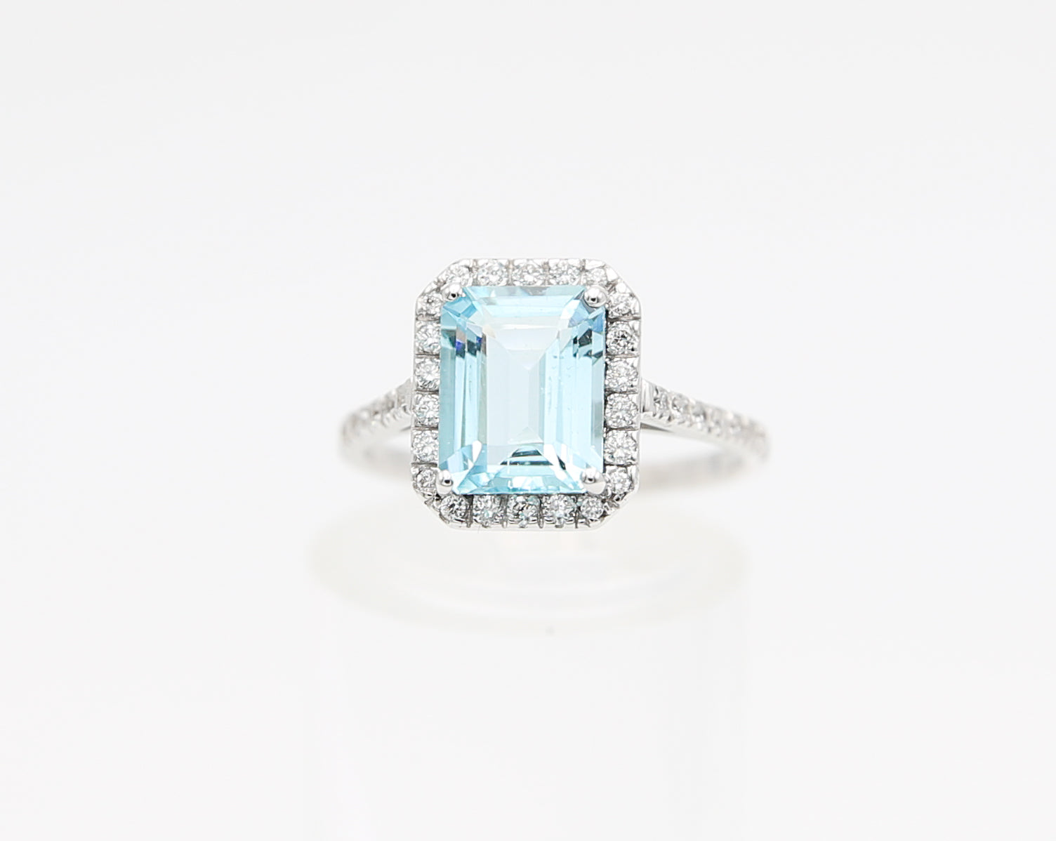 Gold ring with a central aquamarine surrounded by a frame of twenty-two diamonds, which elegantly continue along the shank.