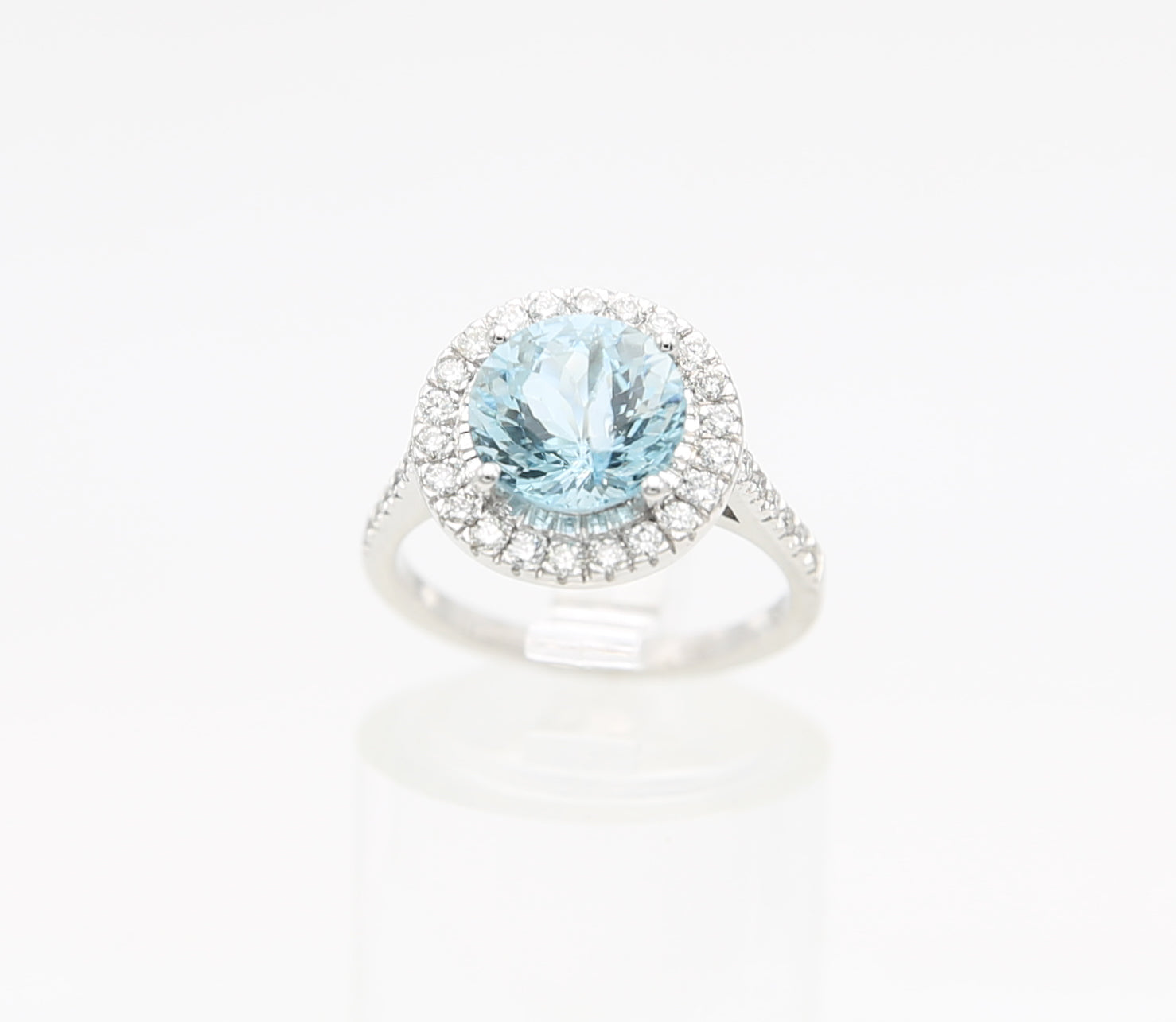 18kt white gold ring with a central aquamarine of intense charm, surrounded by thirty-two brilliant diamonds.