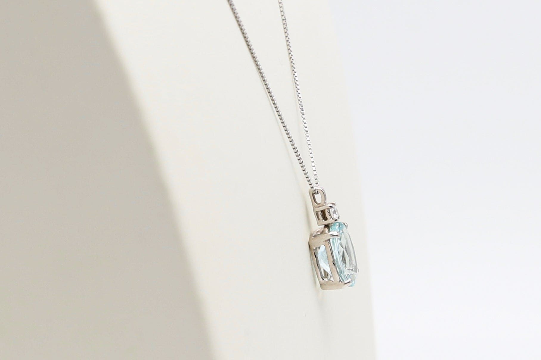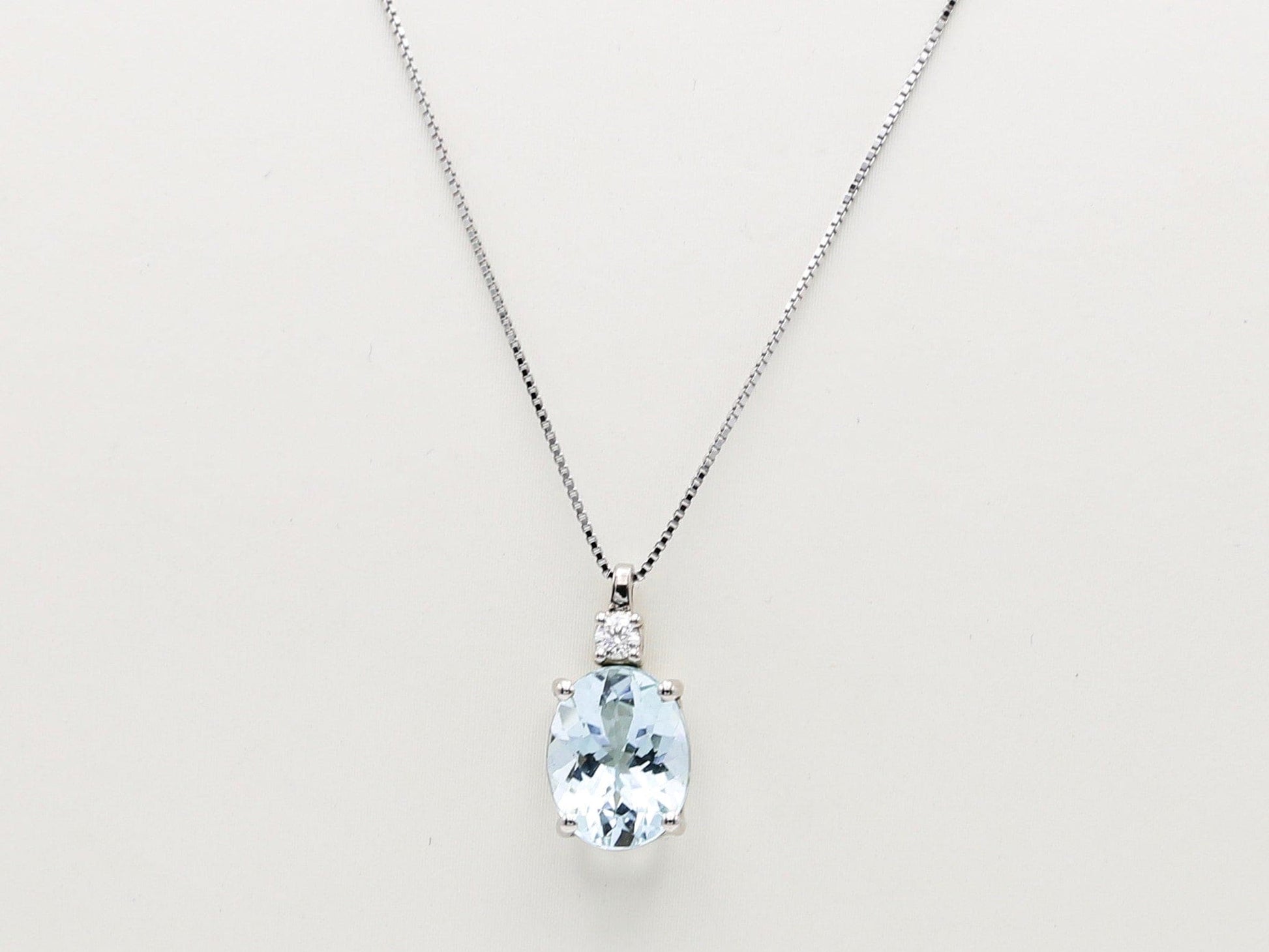 18kt white gold Venetian mesh chain passing through the pendant made with aquamarine and diamond set above the stone.