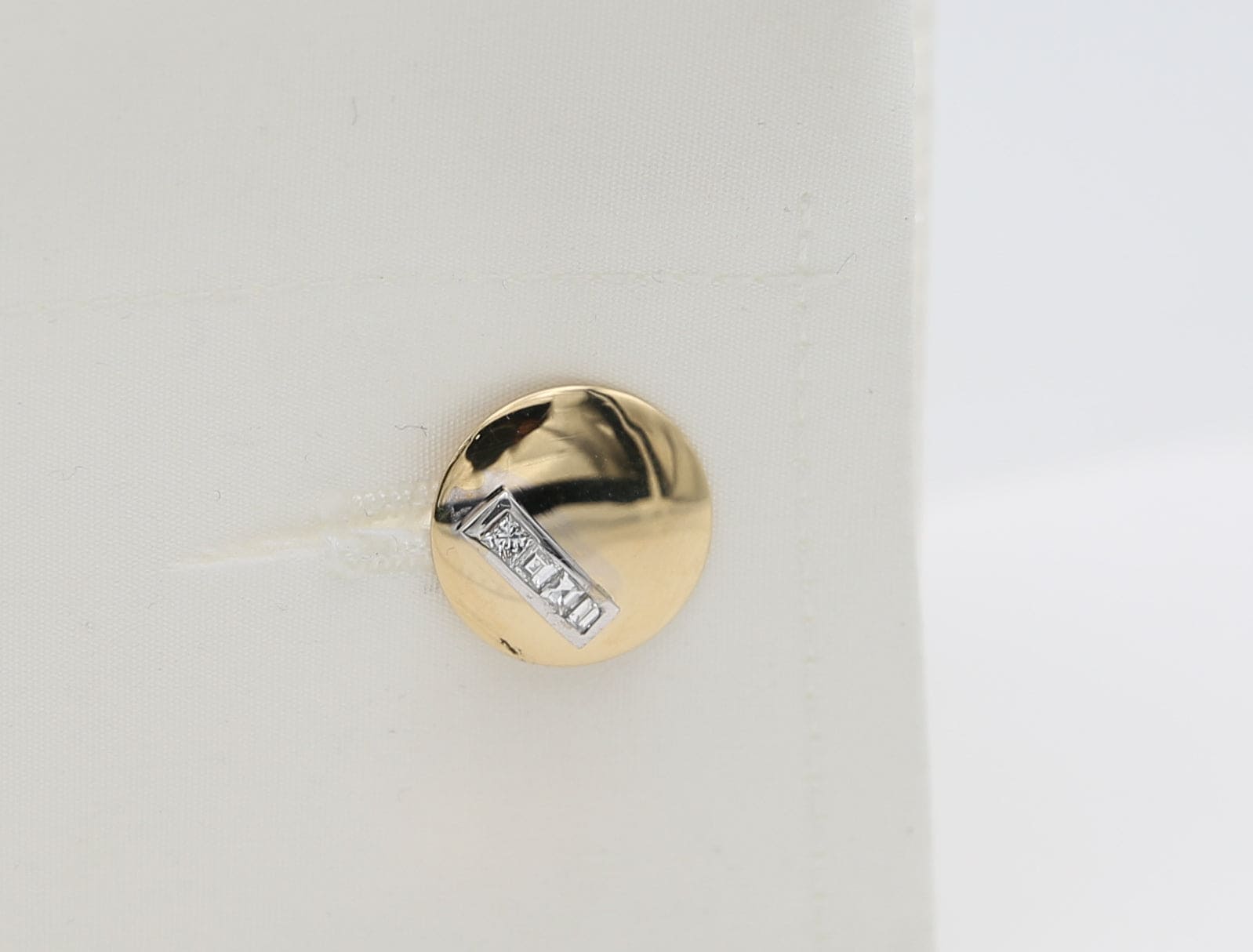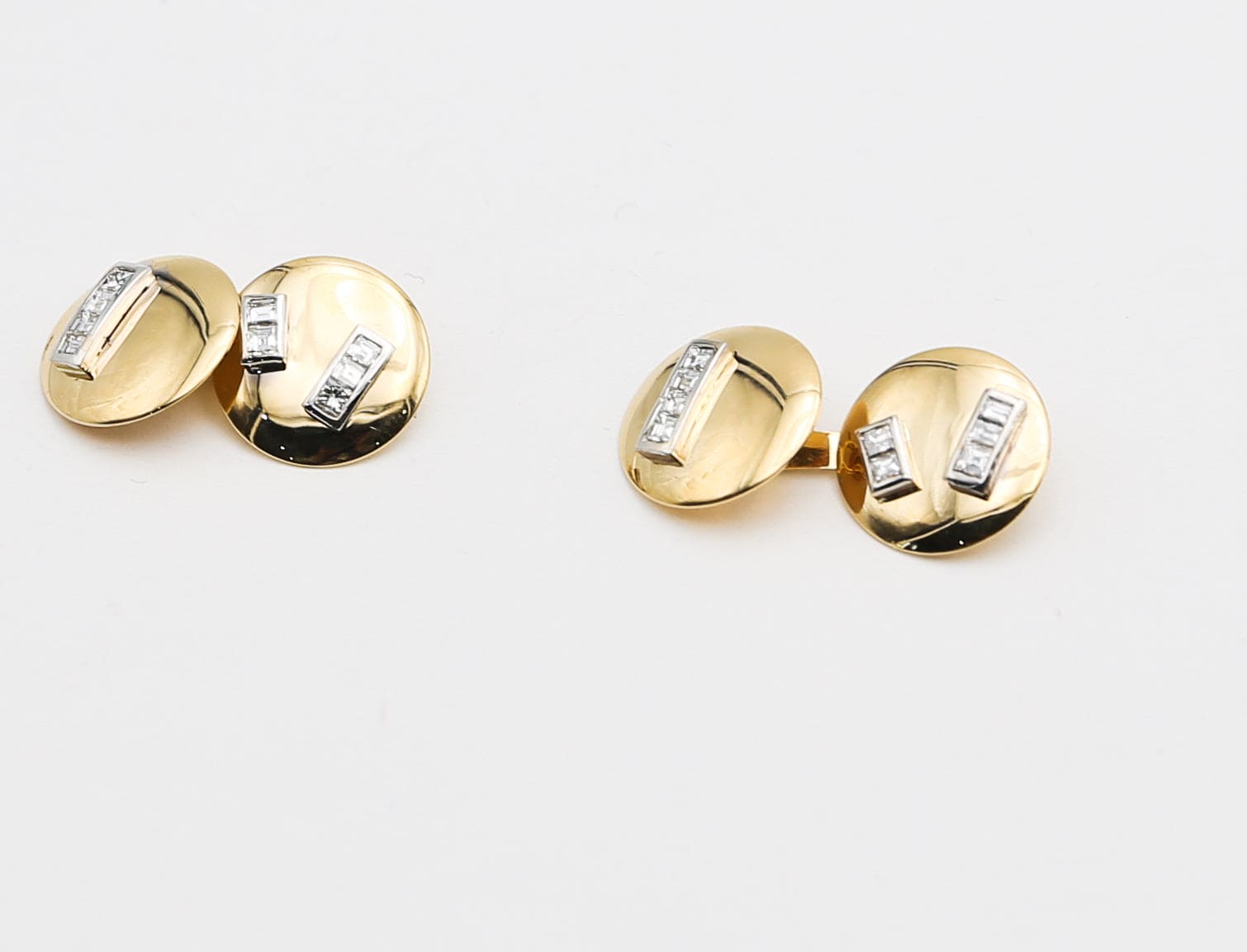Double cufflinks in polished 18kt yellow gold, with an elegant round design decorated with diamonds on each side.