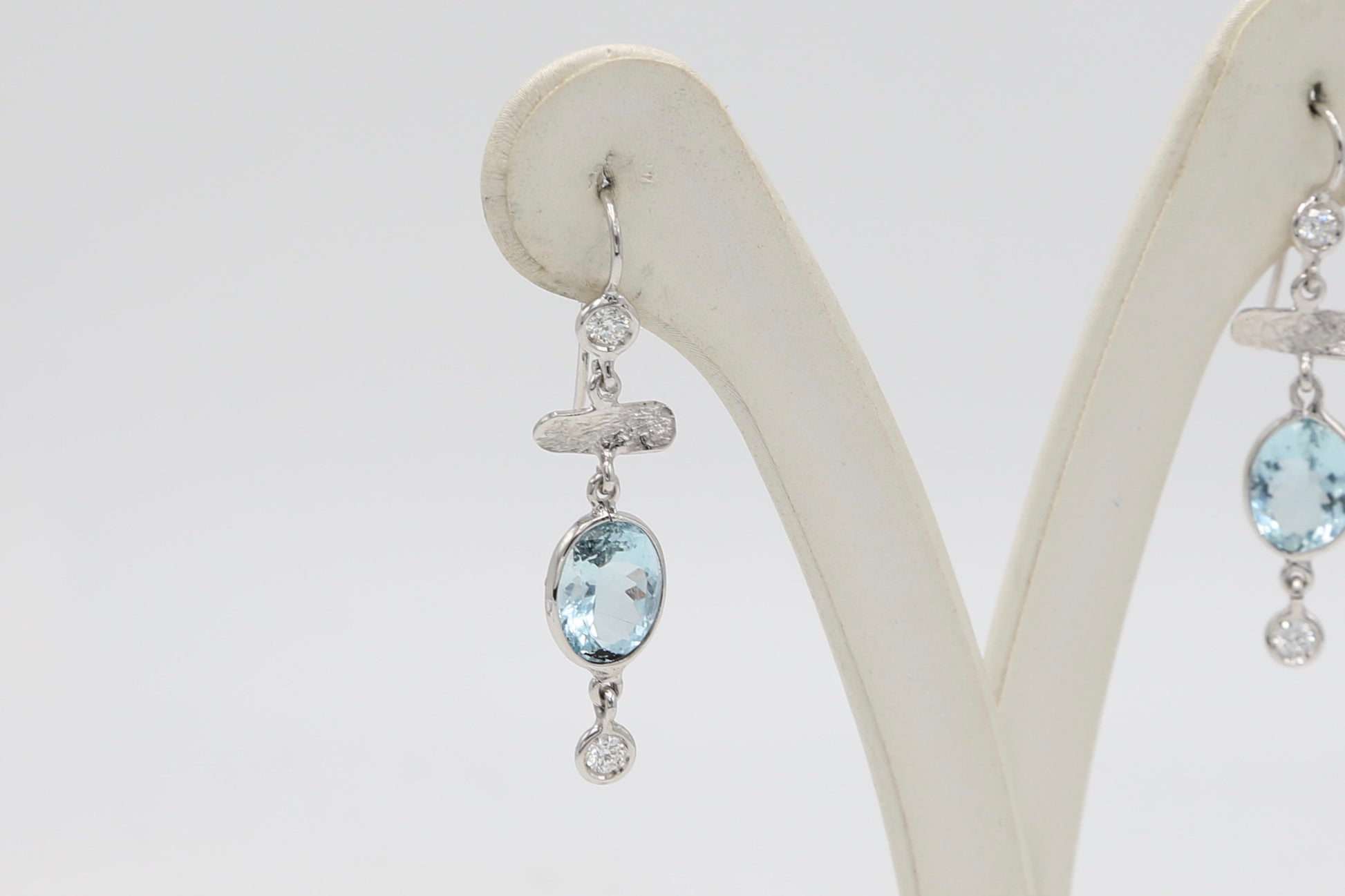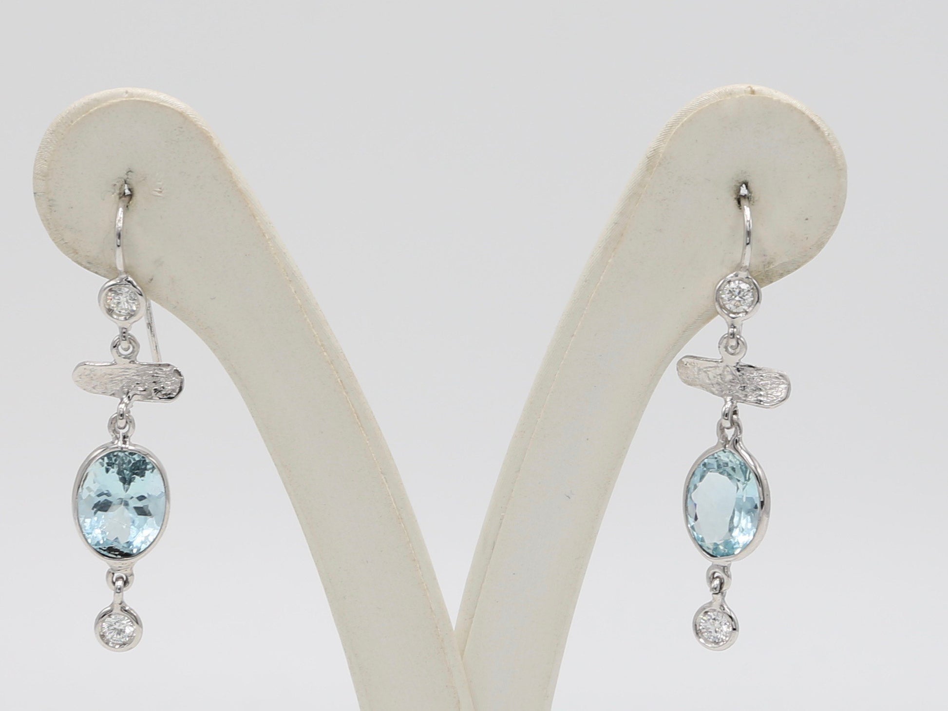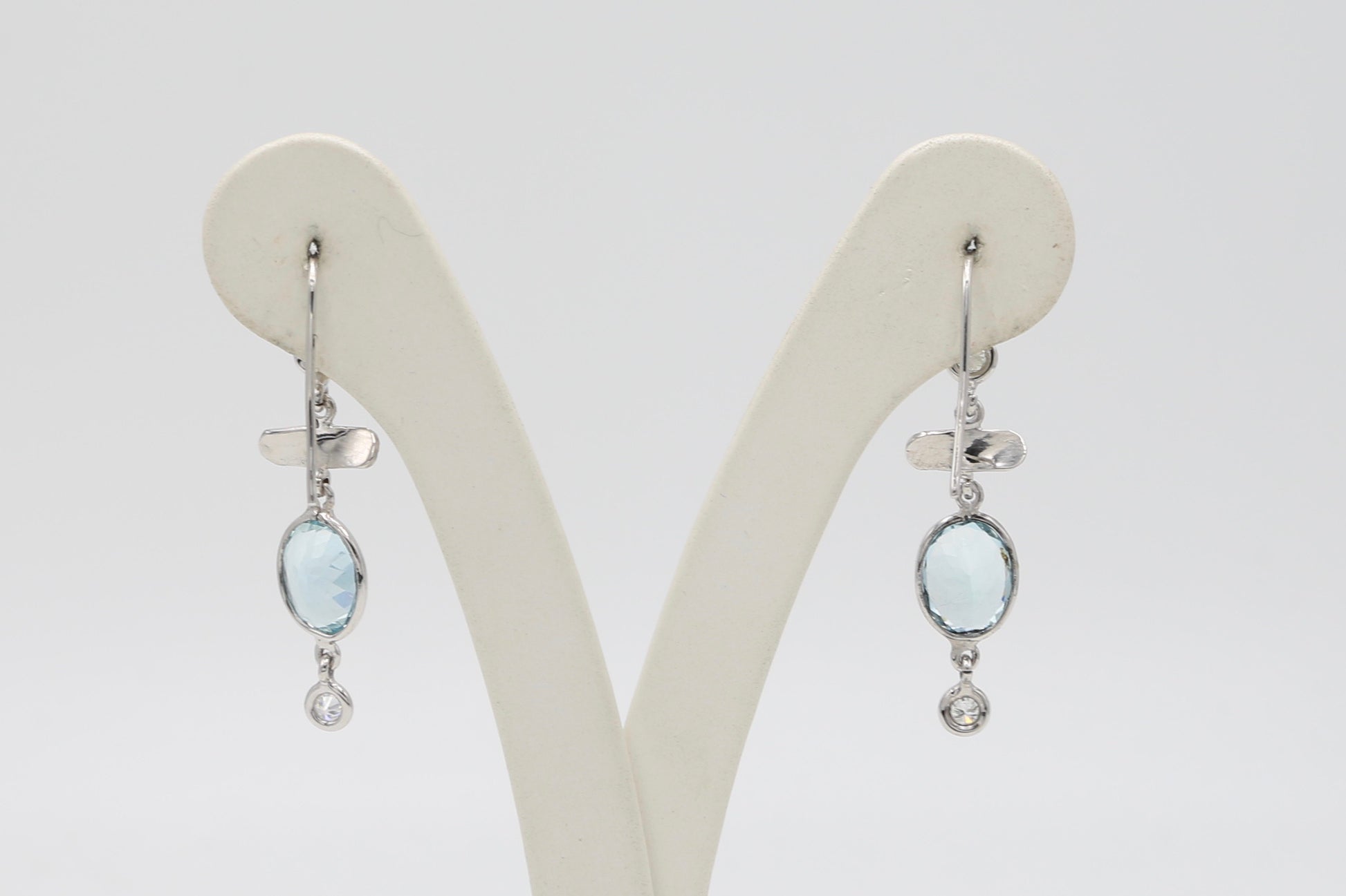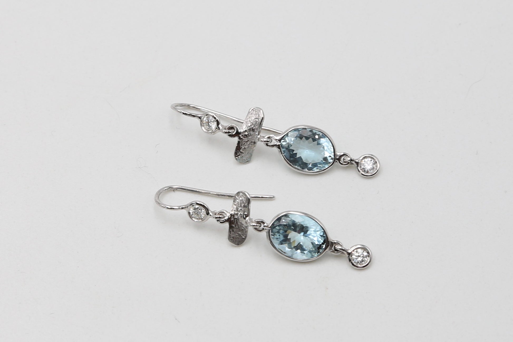 Delightful pair of monachina style earrings worked with the satin finishing technique with two splendid oval "briolette" cut aquamarines in intense light blue and two large natural diamonds