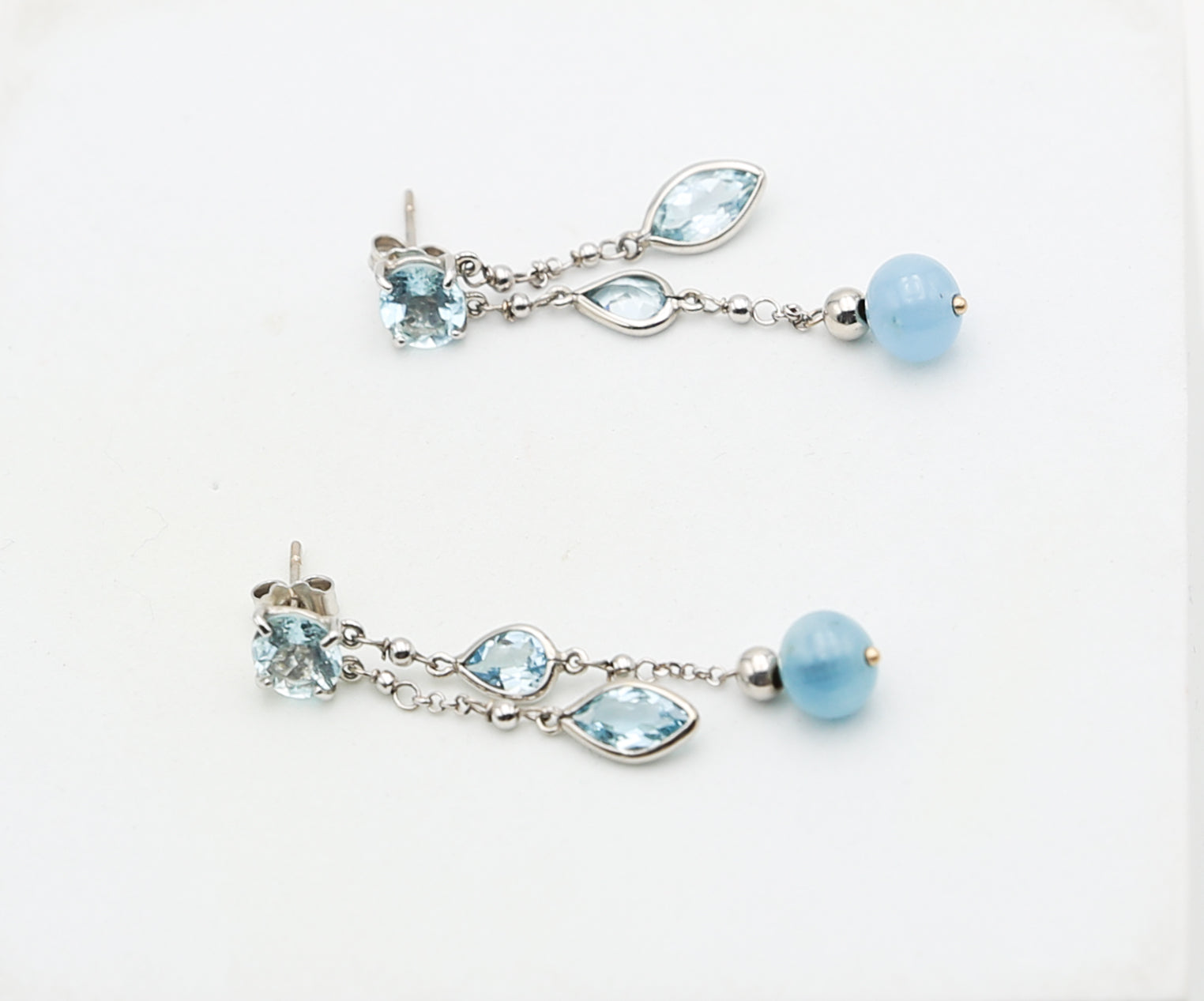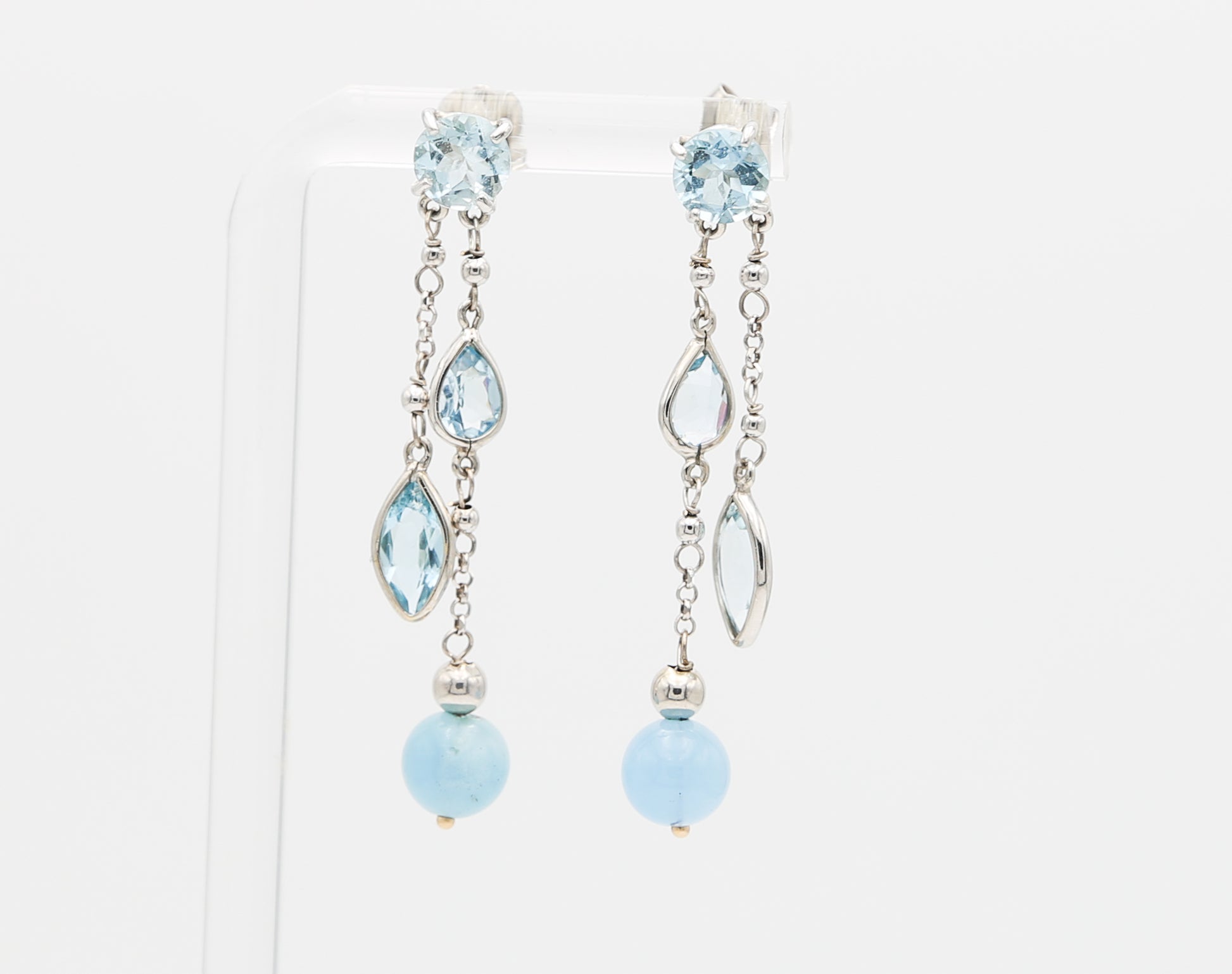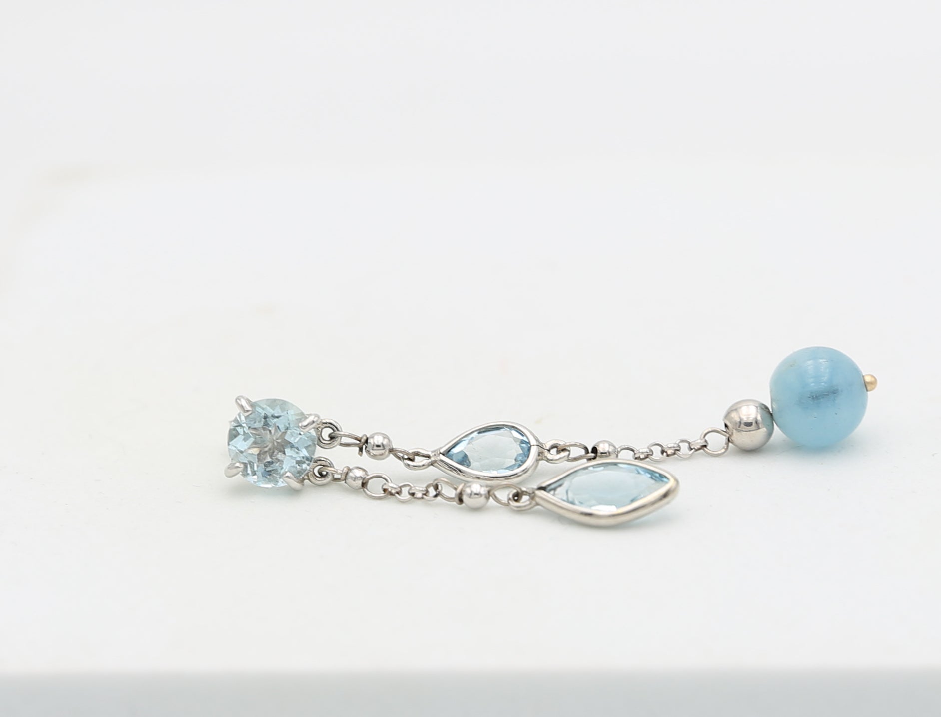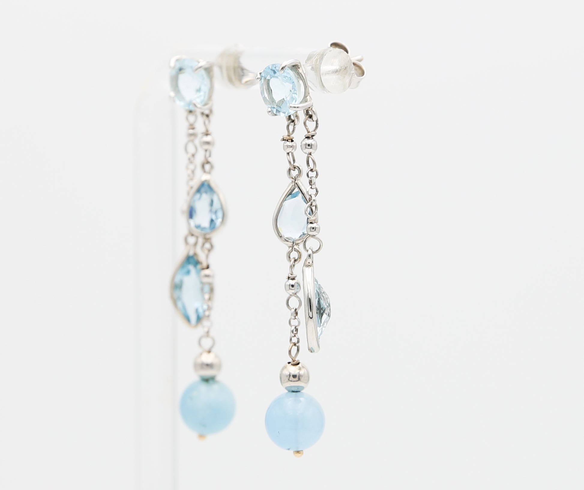 18kt white gold earrings with pin and butterfly clasp, two up-and-down chains embellished with aquamarines of various cuts create an elegant movement.