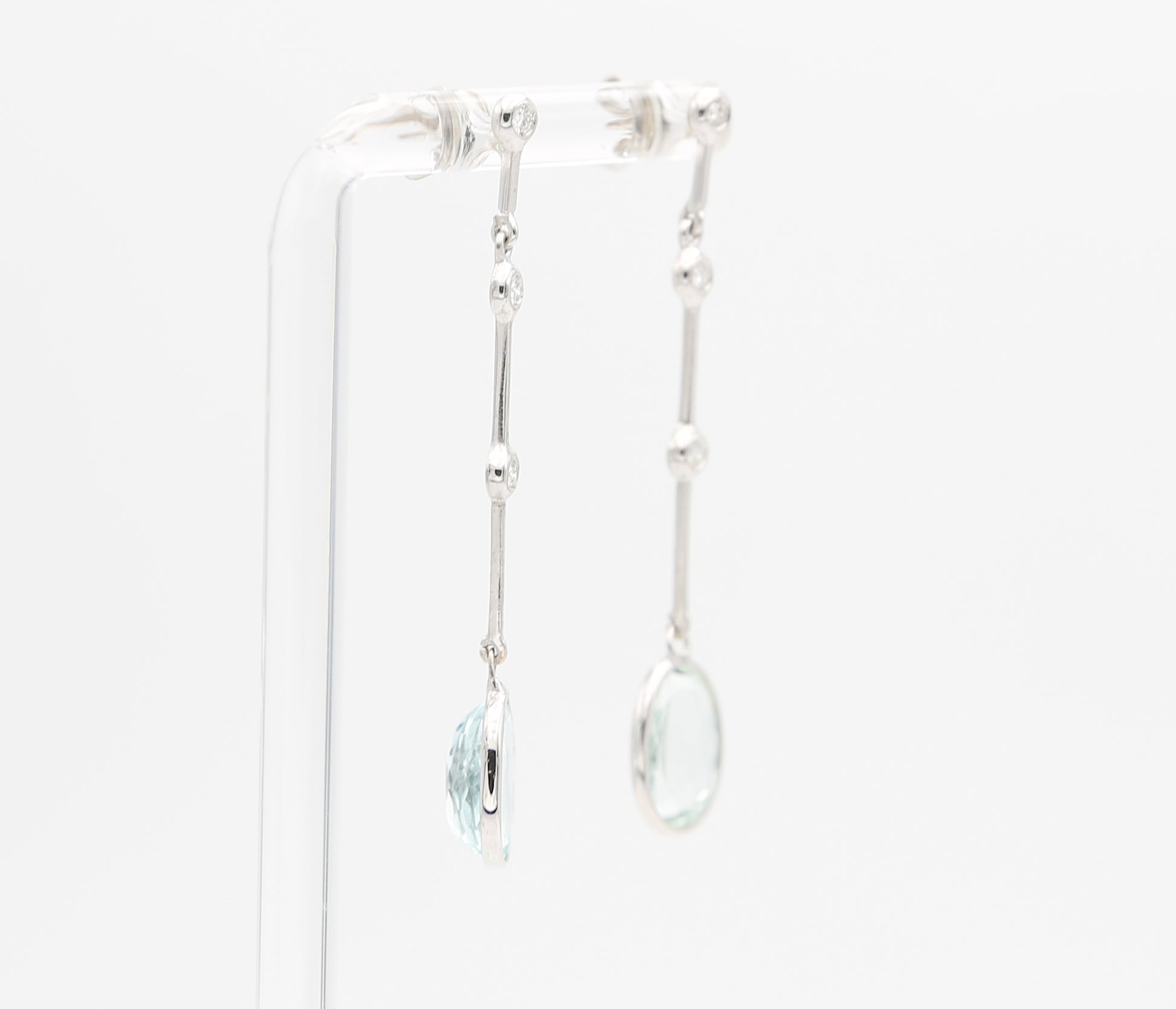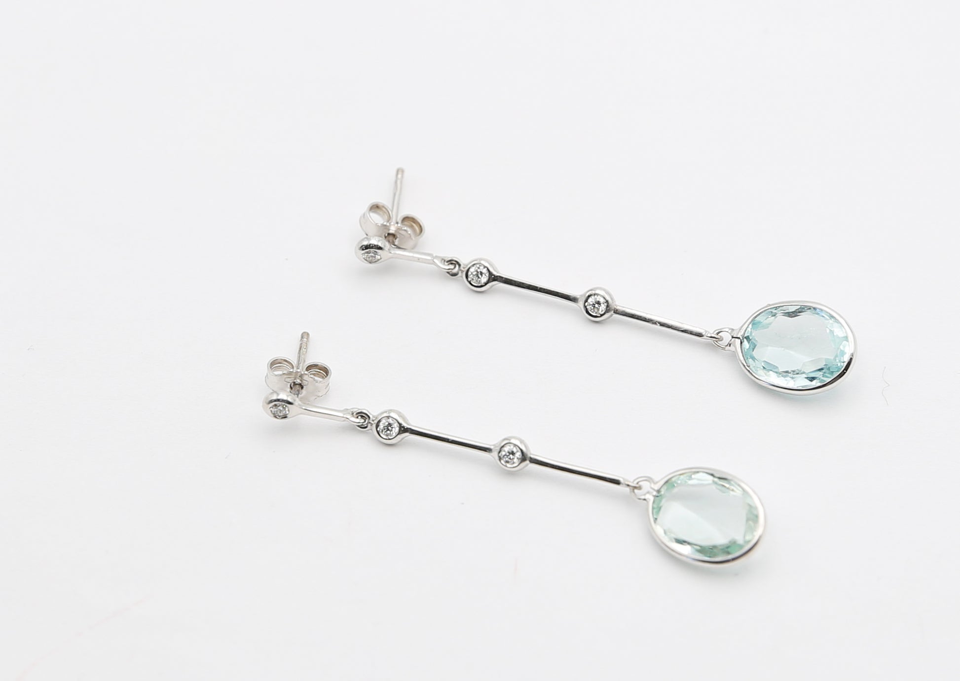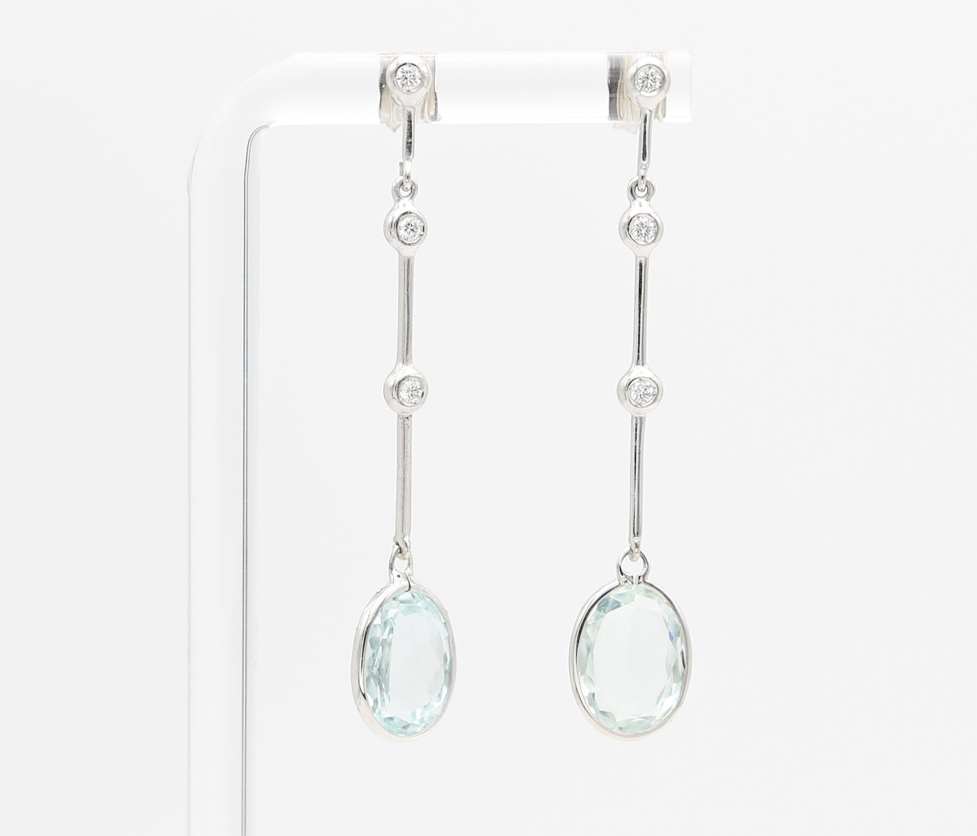 Delightful pendant earring made of 18 kt white gold with two precious oval aquamarines and a gold bar with brilliants.
