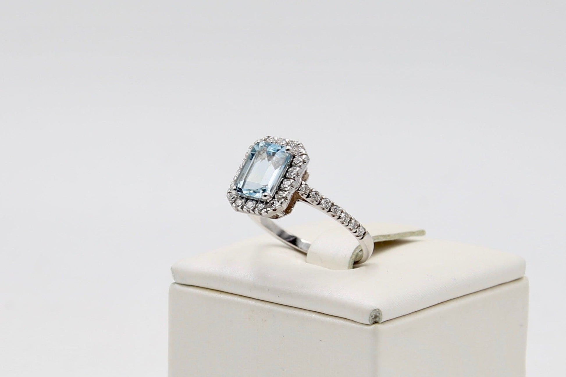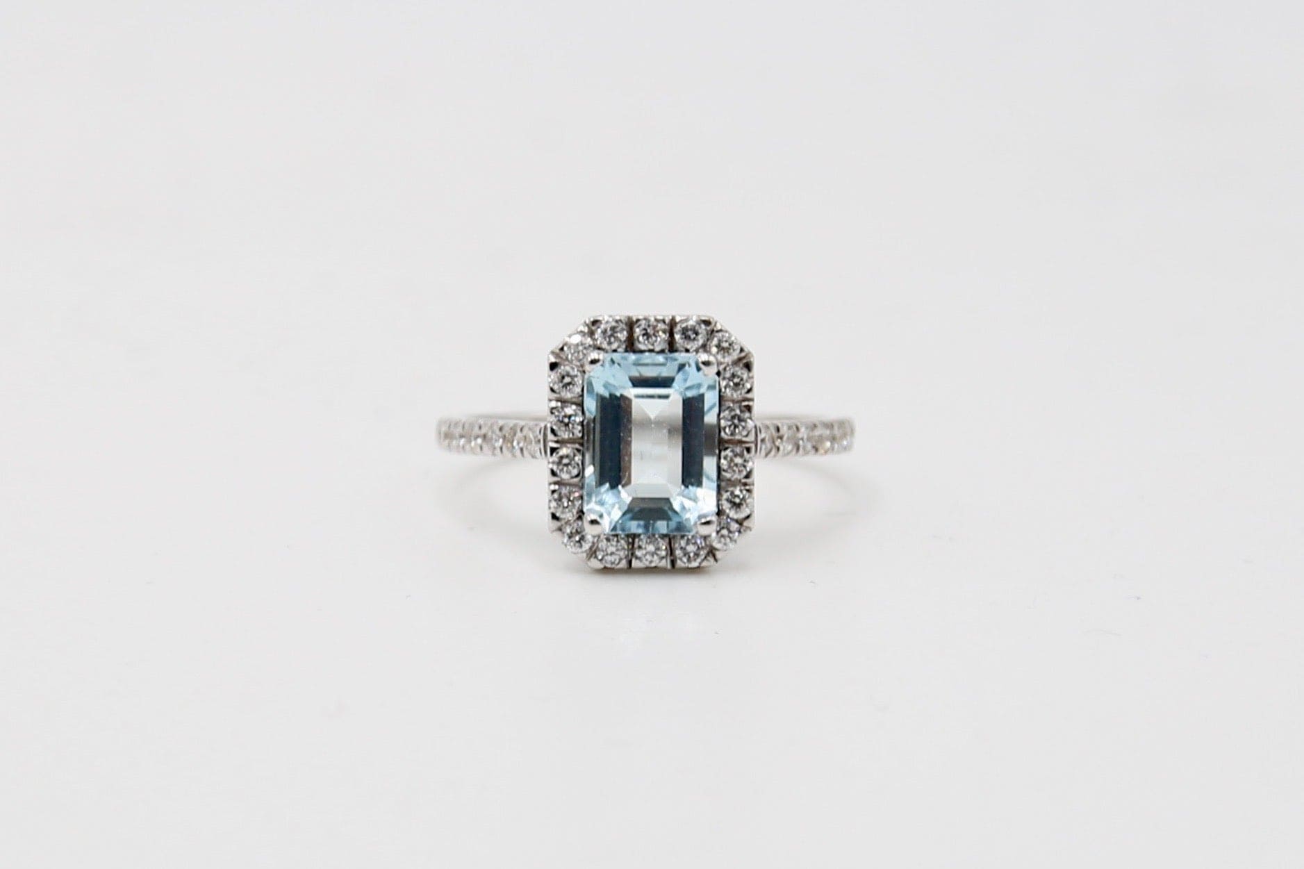 Bague en or blanc avec aigue-marine rectangulaire et diamants
