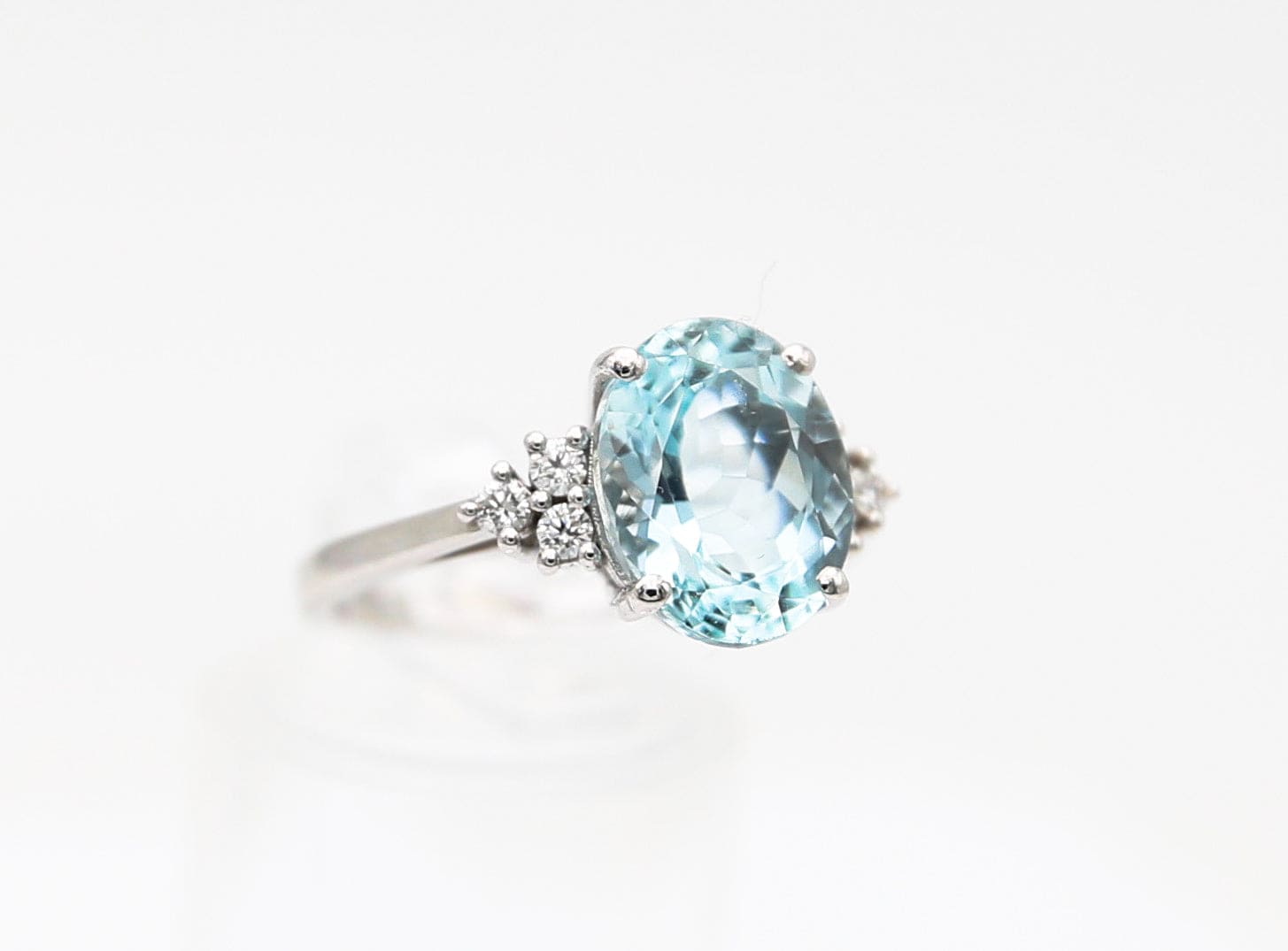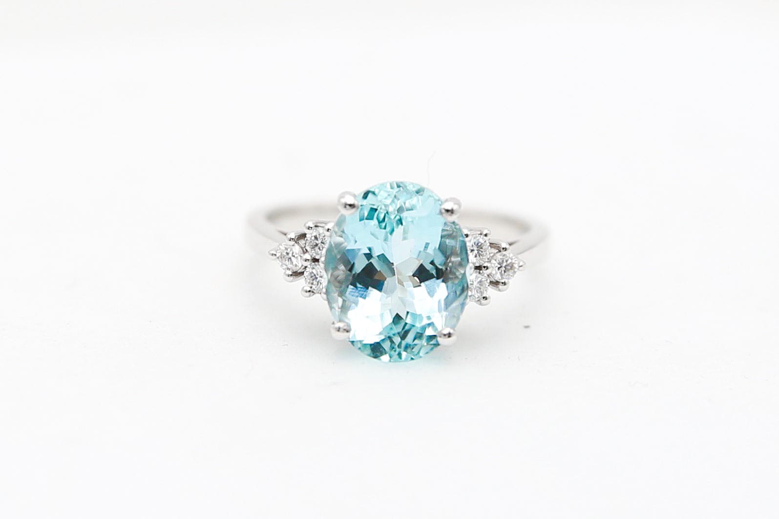 Bague en or blanc 18 carats avec aigue-marine centrale ovale facettée sertie de 4 griffes et diamants latéraux sertis en forme de pyramide.