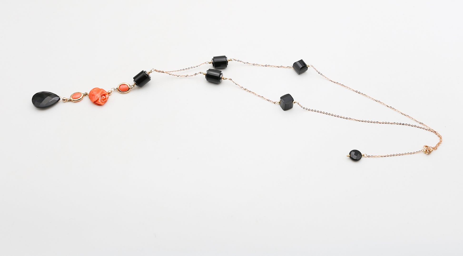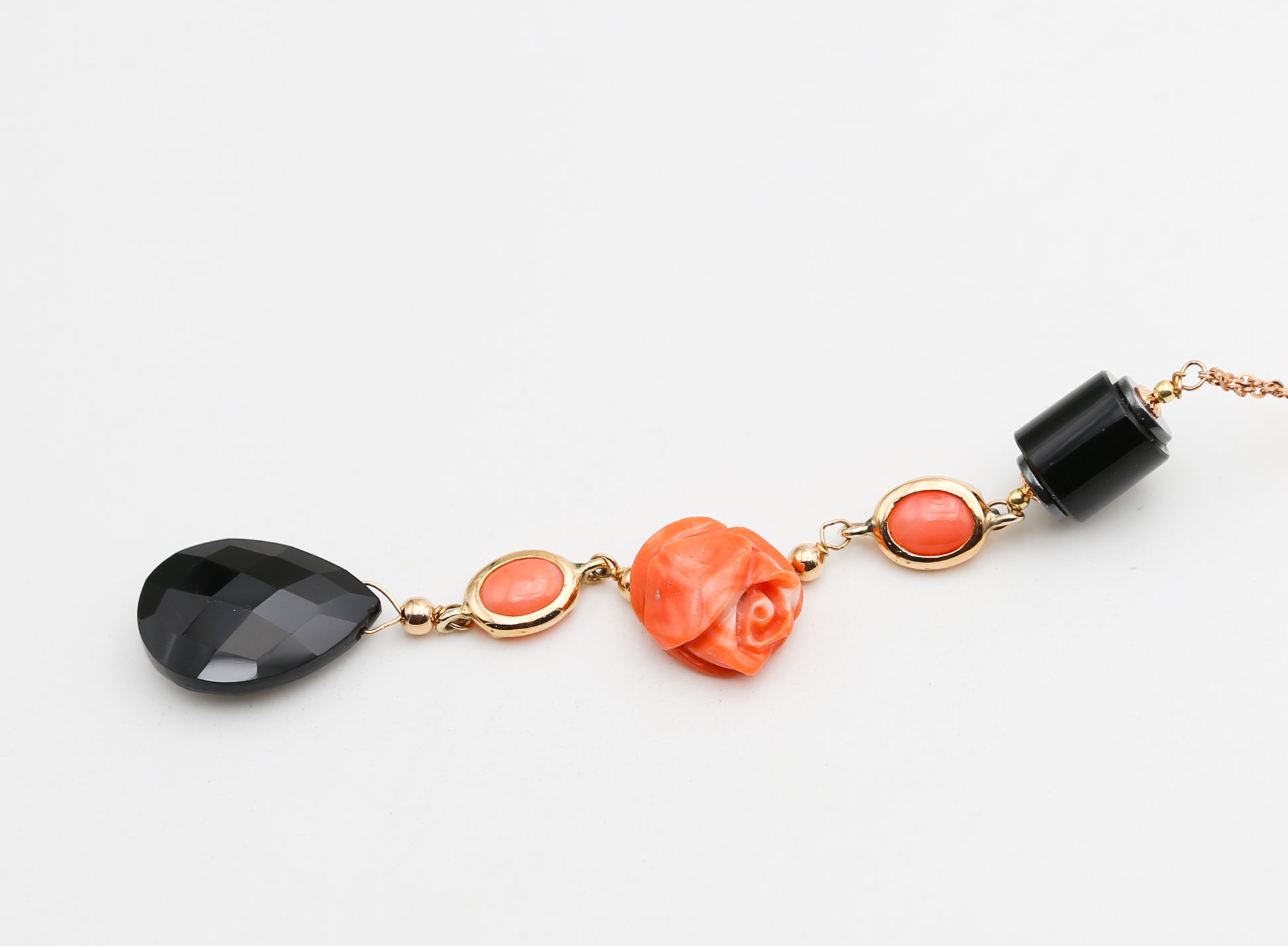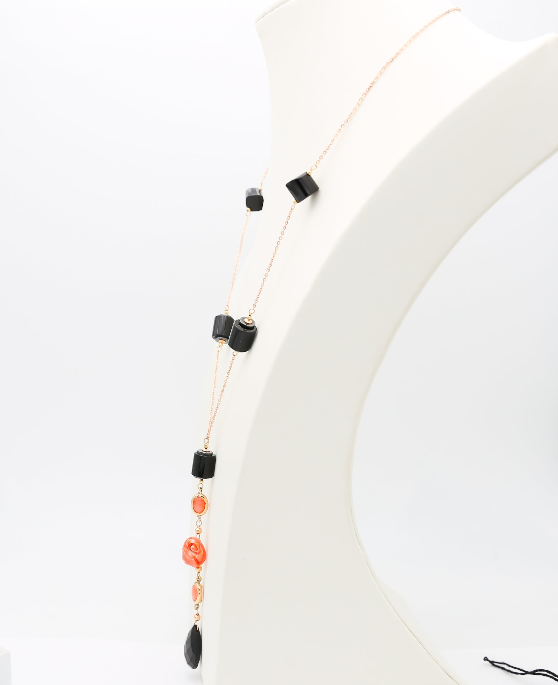 Raffinata collana lunga in oro rosa 18 kt, con pendente decorato da una rosa di corallo inciso e onice in vari tagli.