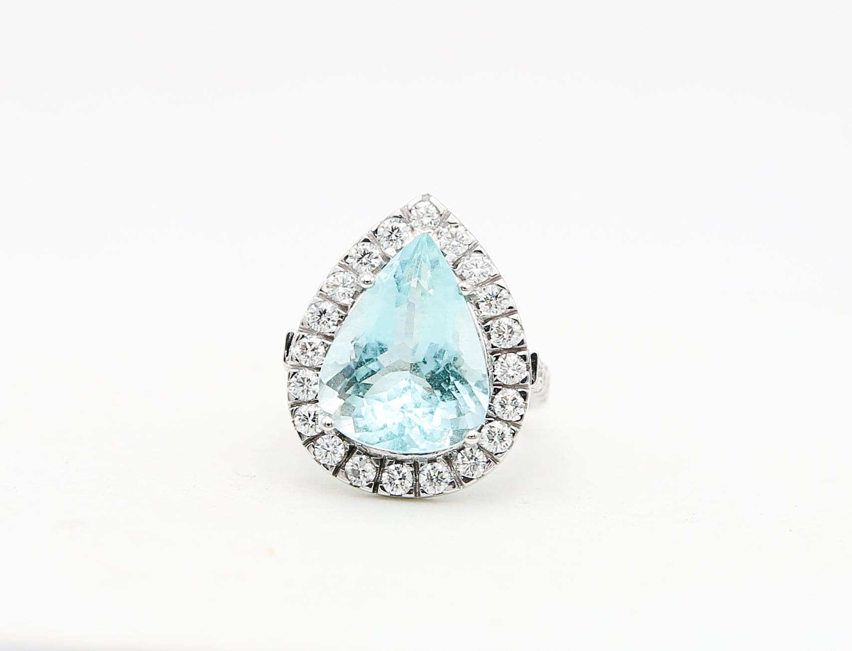 Anello in oro bianco con goccia di acquamarina e cornice di diamanti