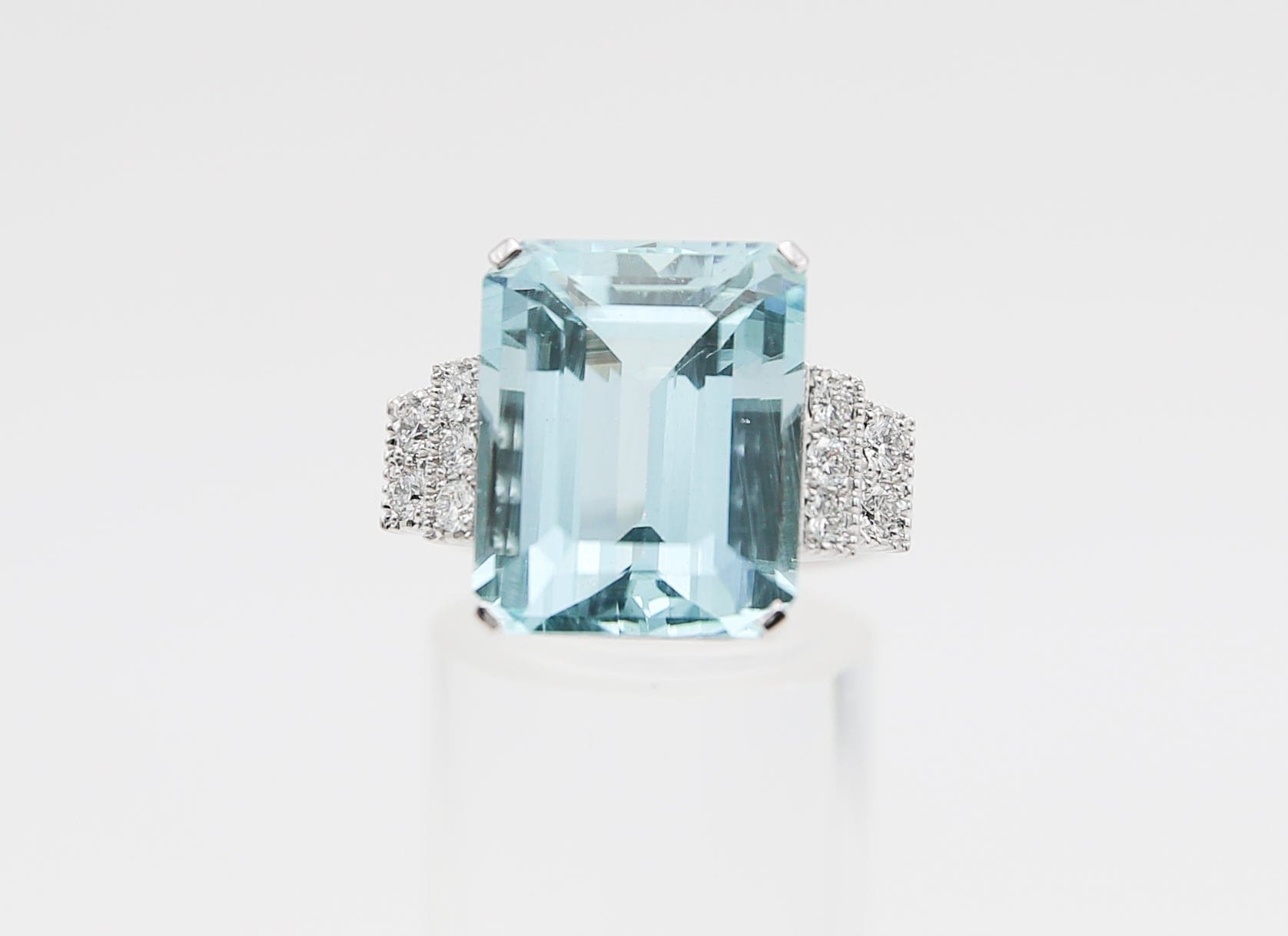 Anello in oro bianco 18 kt con una grande acquamarina centrale affiancata da dieci diamanti laterali.