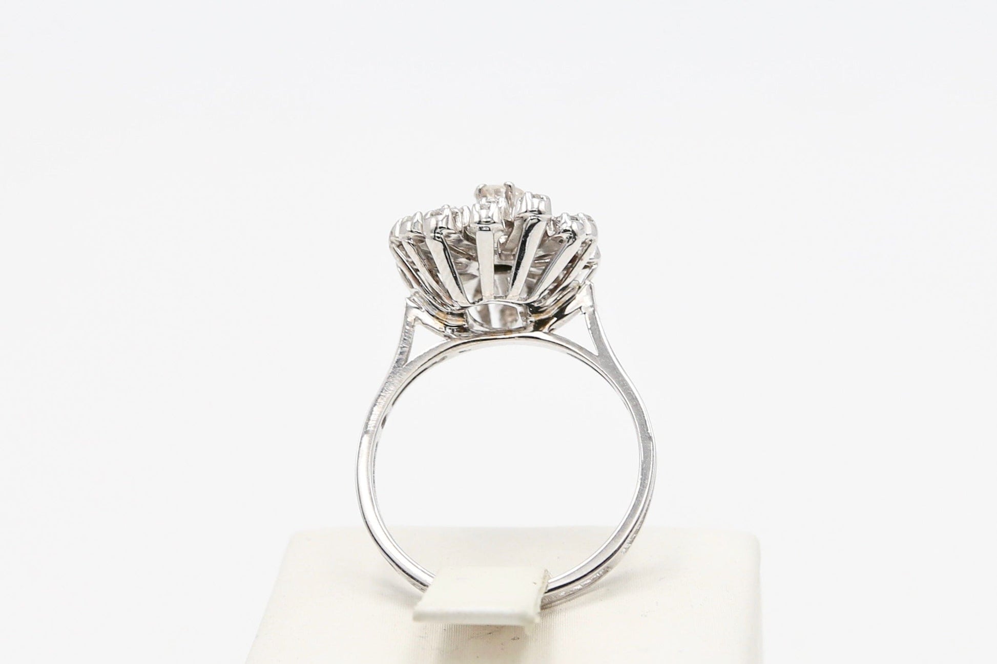 Splendido anello a goccia con diamante centrale contornato da diamanti disposti a raggiera.