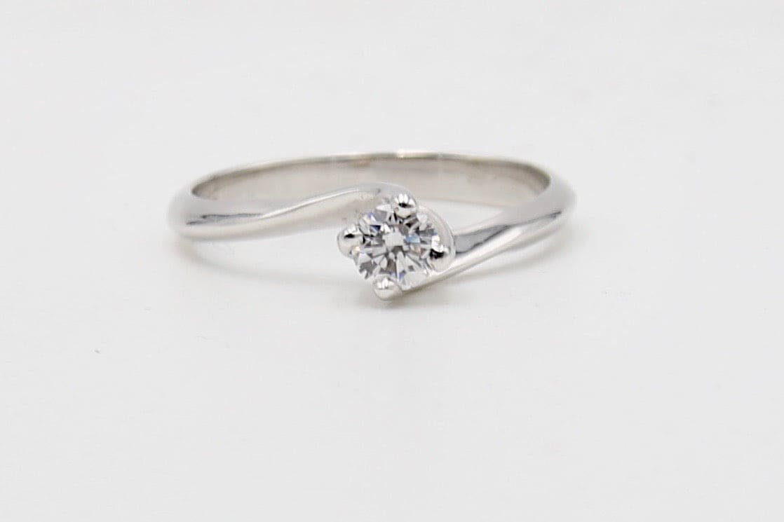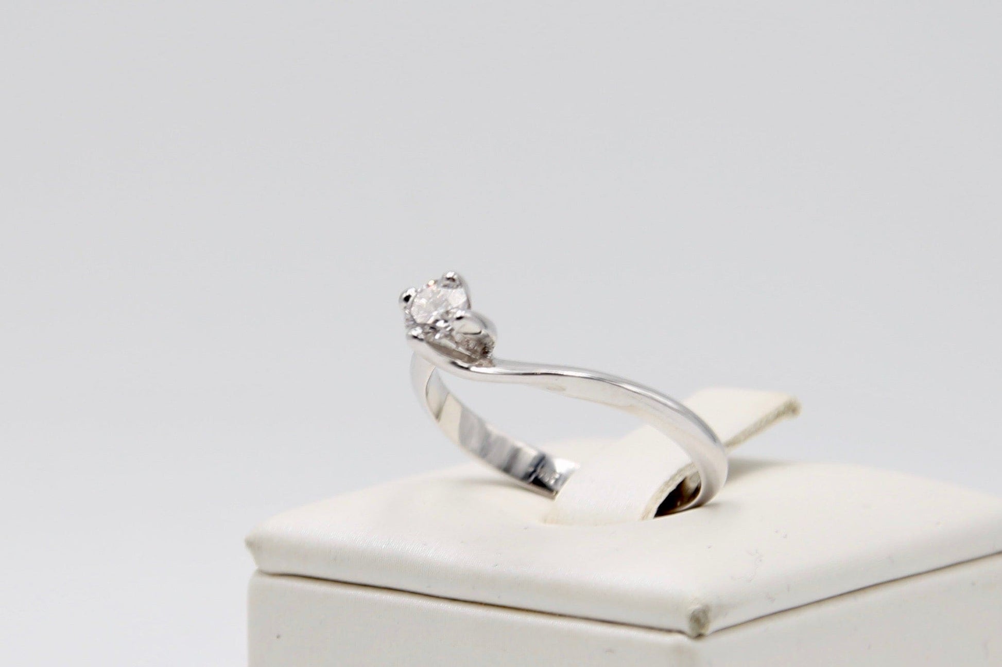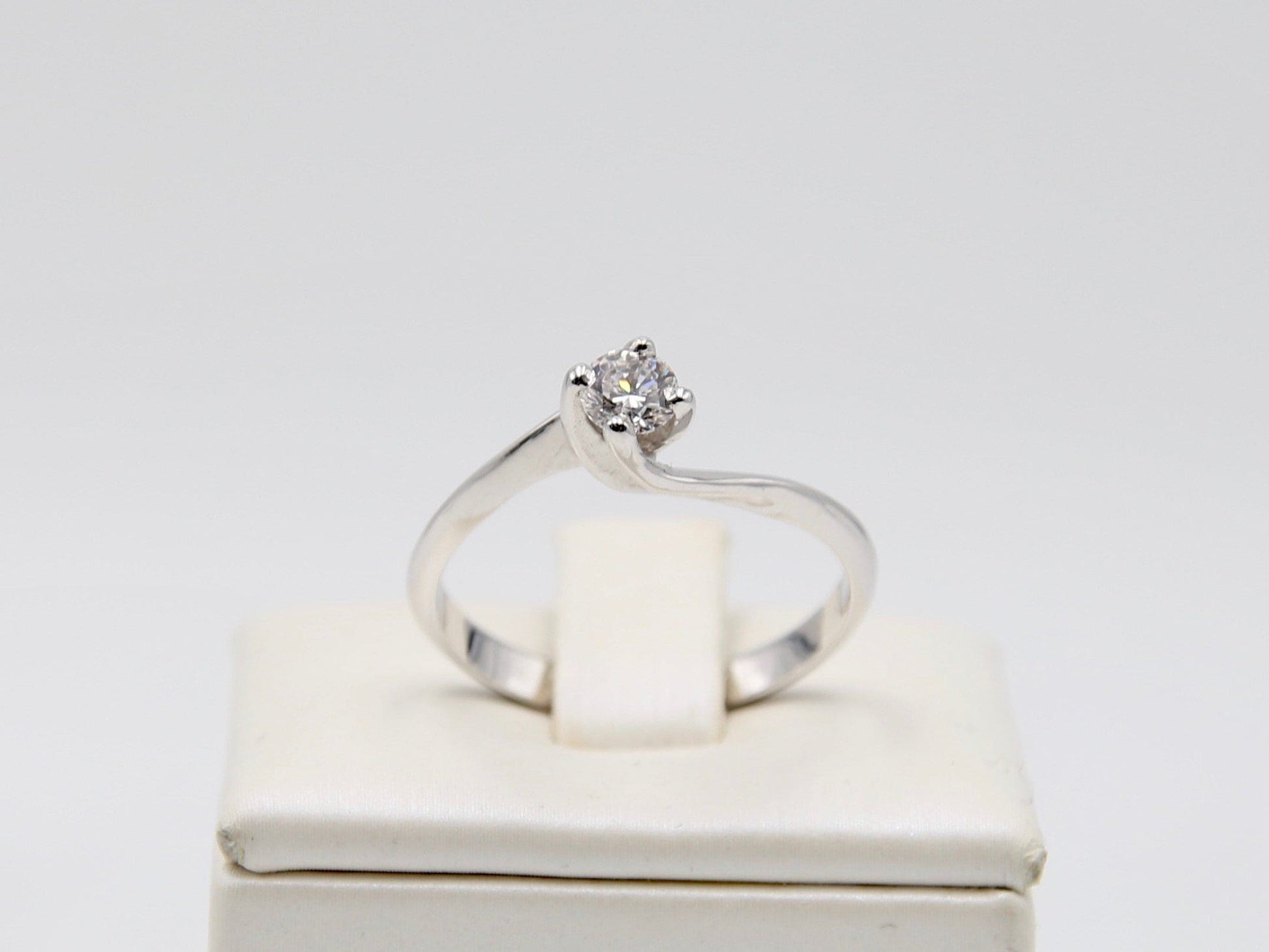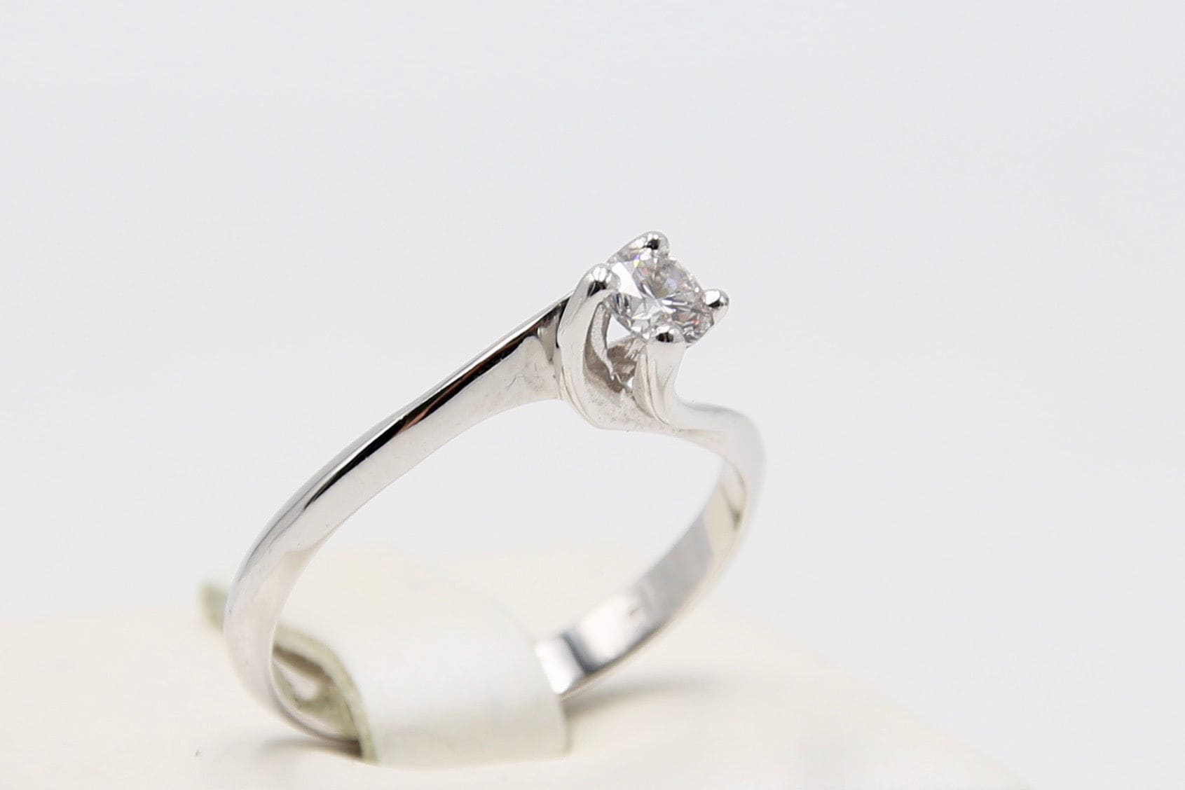 Anello solitario in oro bianco 18 kt con splendido diamante taglio brillante centrale incastonato con 4 "griffes" che lasciano la pietra completamente visibile. Prodotto in laboratorio italiano su modello "Valentino"