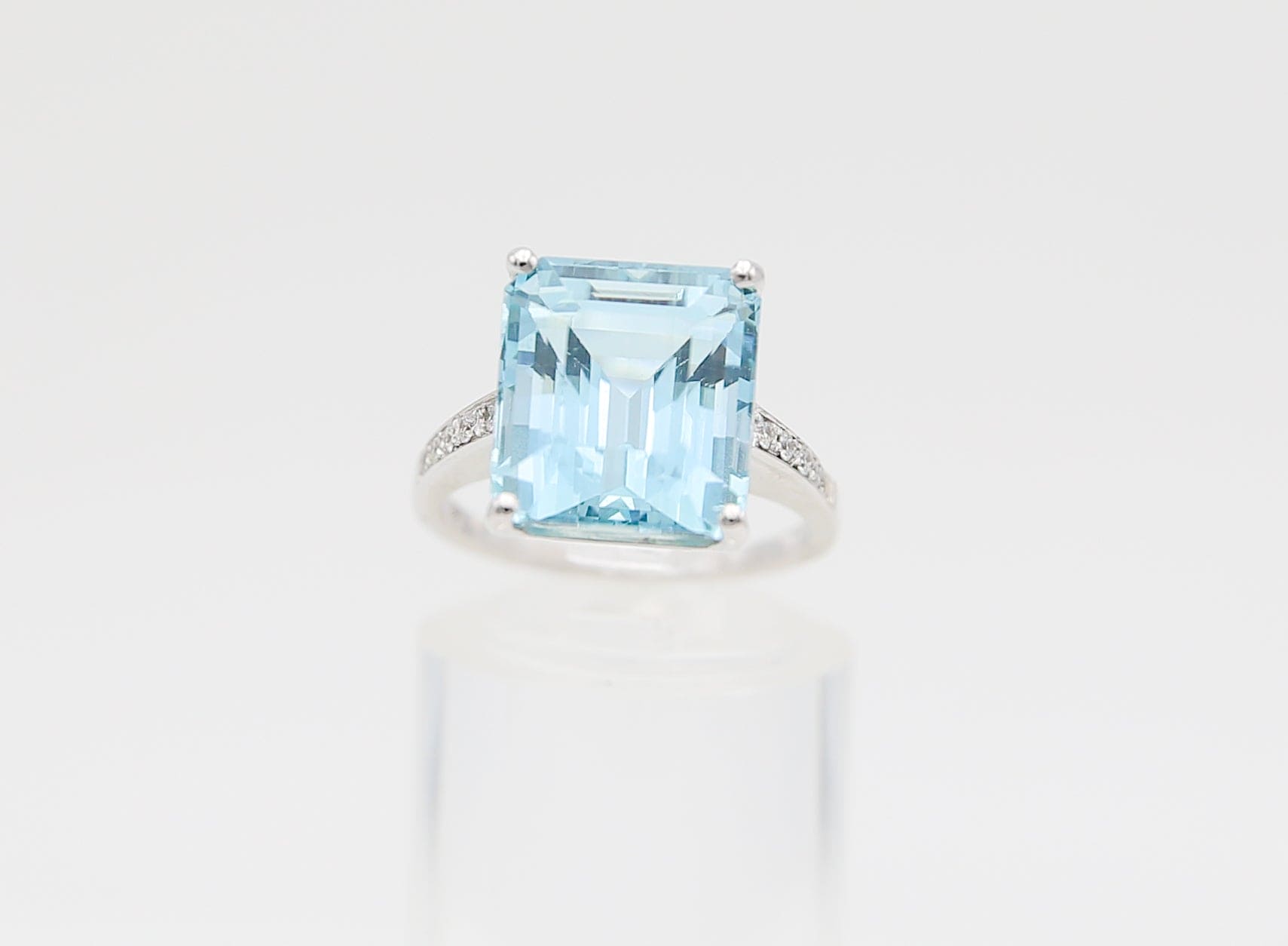 Anello in oro bianco 18 kt con un’acquamarina centrale e dieci diamanti che ne esaltano la brillantezza.