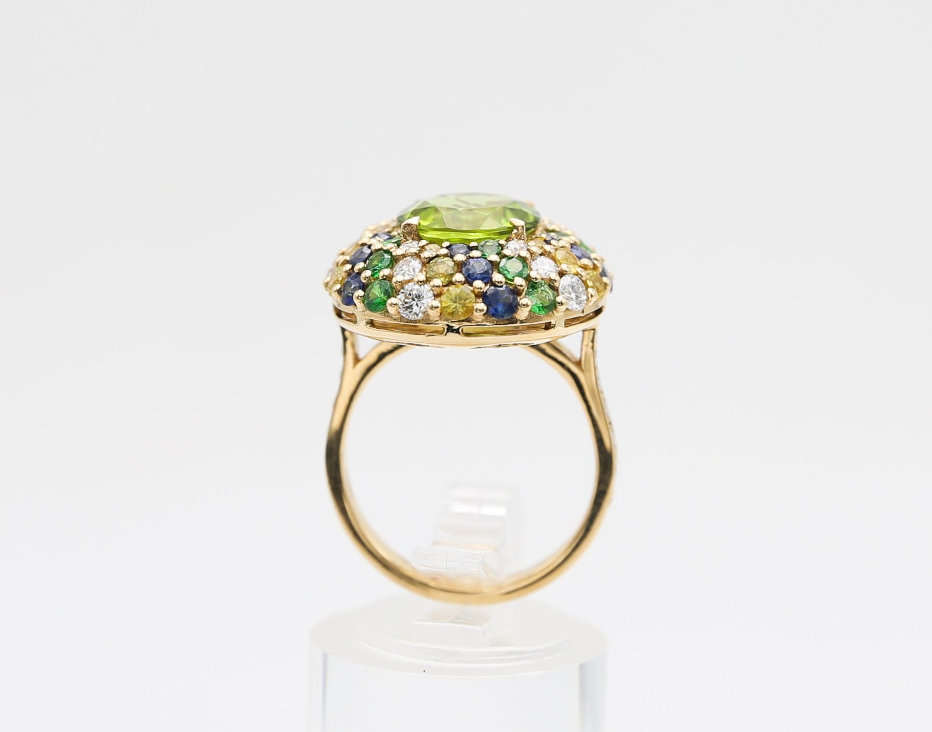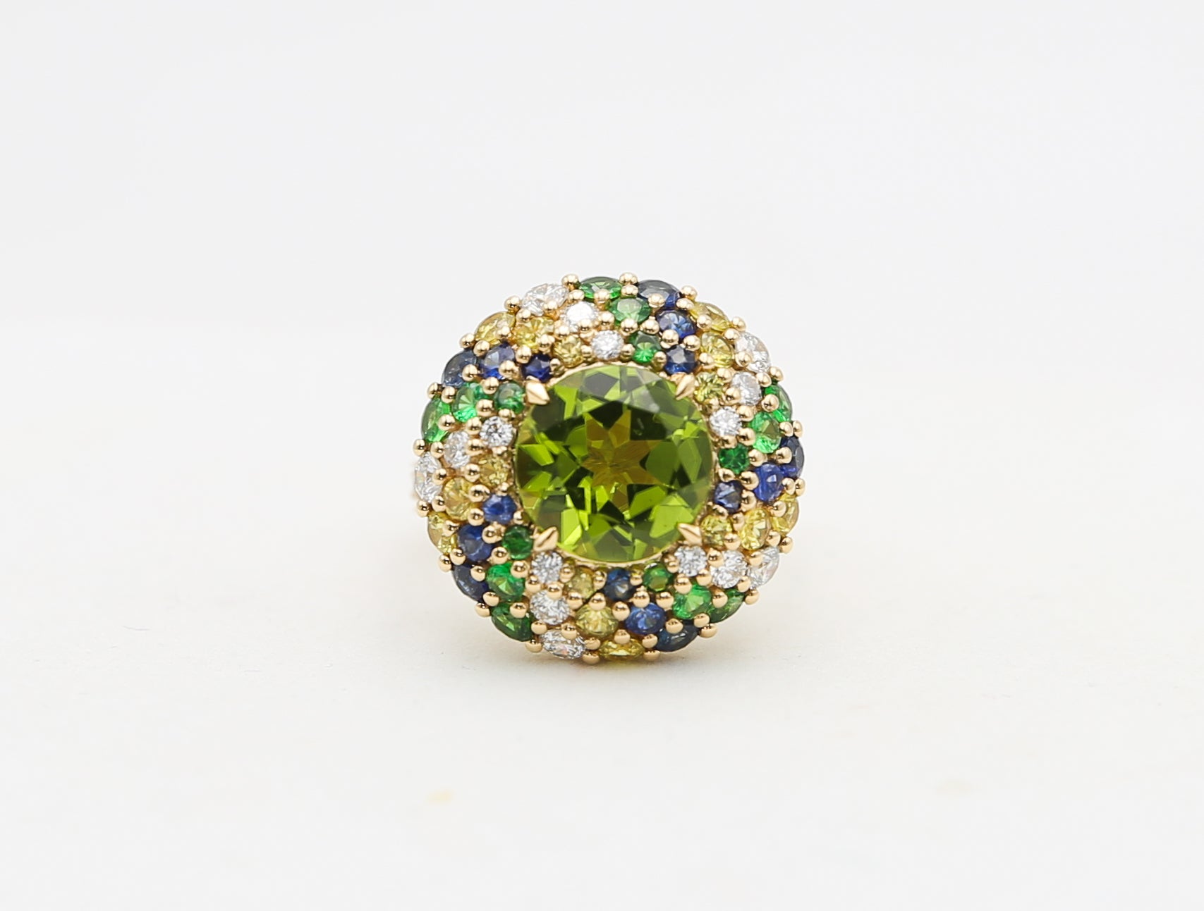 Anello in oro giallo 18 kt con un luminoso peridoto centrale, incorniciato da un prezioso tripudio di diamanti, zaffiri e tsavoriti.