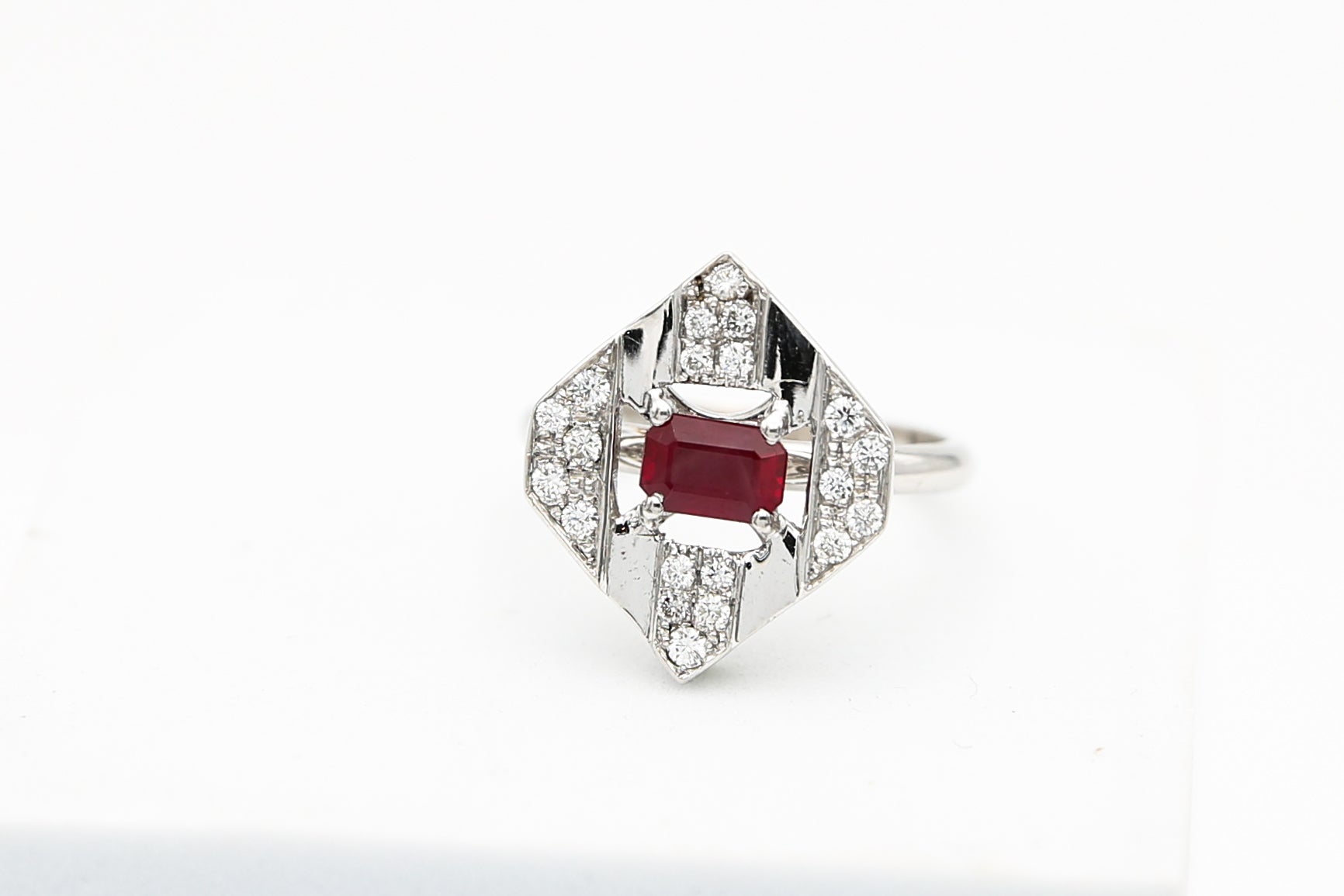 Anello in oro bianco 18kt a forma di rombo con rubino centrale e diamanti.
