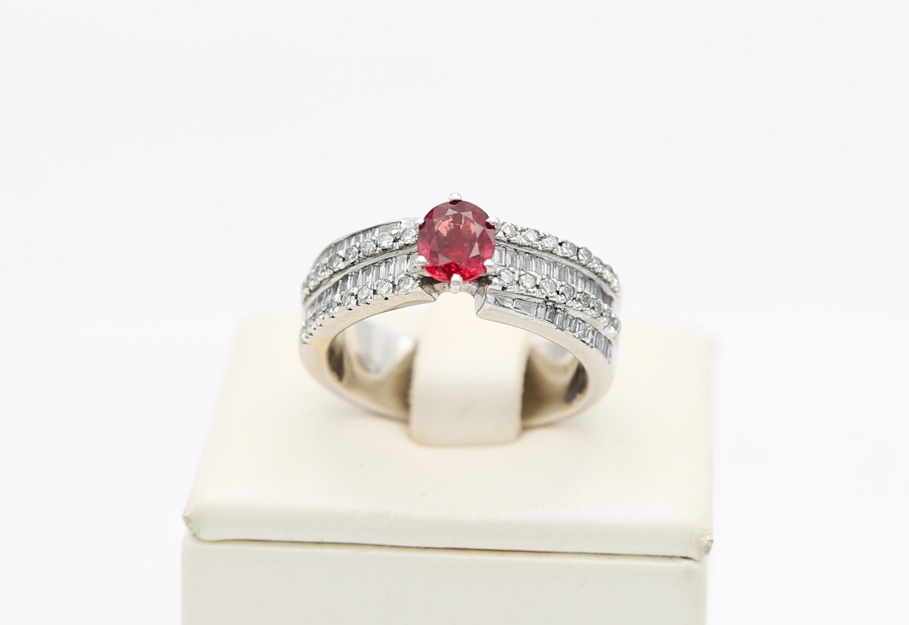 Anello in oro bianco 18 kt stile vintage con rubino centrale circondato da diamanti di varie taglie.