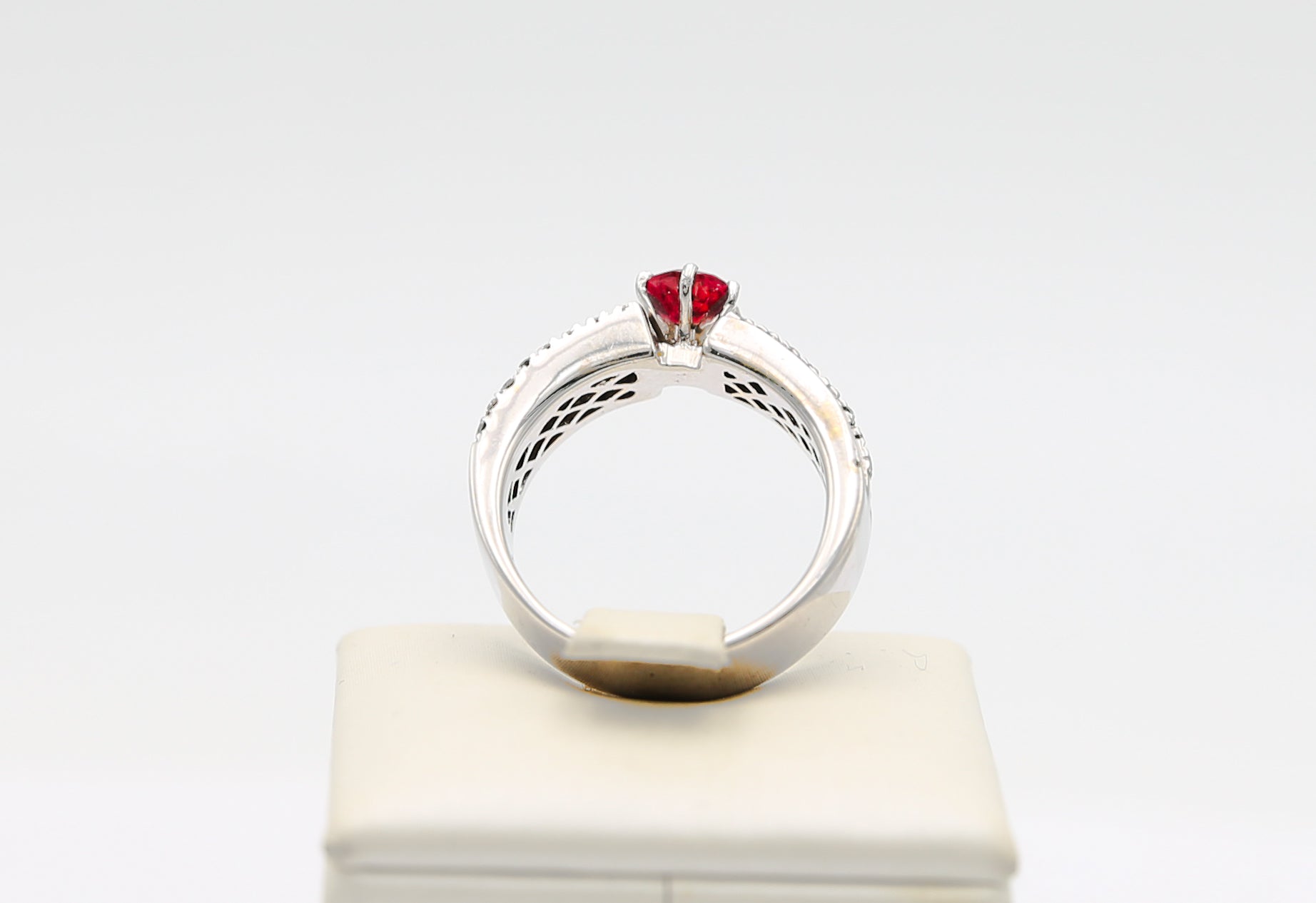L'eleganza del design e la brillantezza dei diamanti esaltano la bellezza del rubino, creando un gioiello di grande valore e fascino.