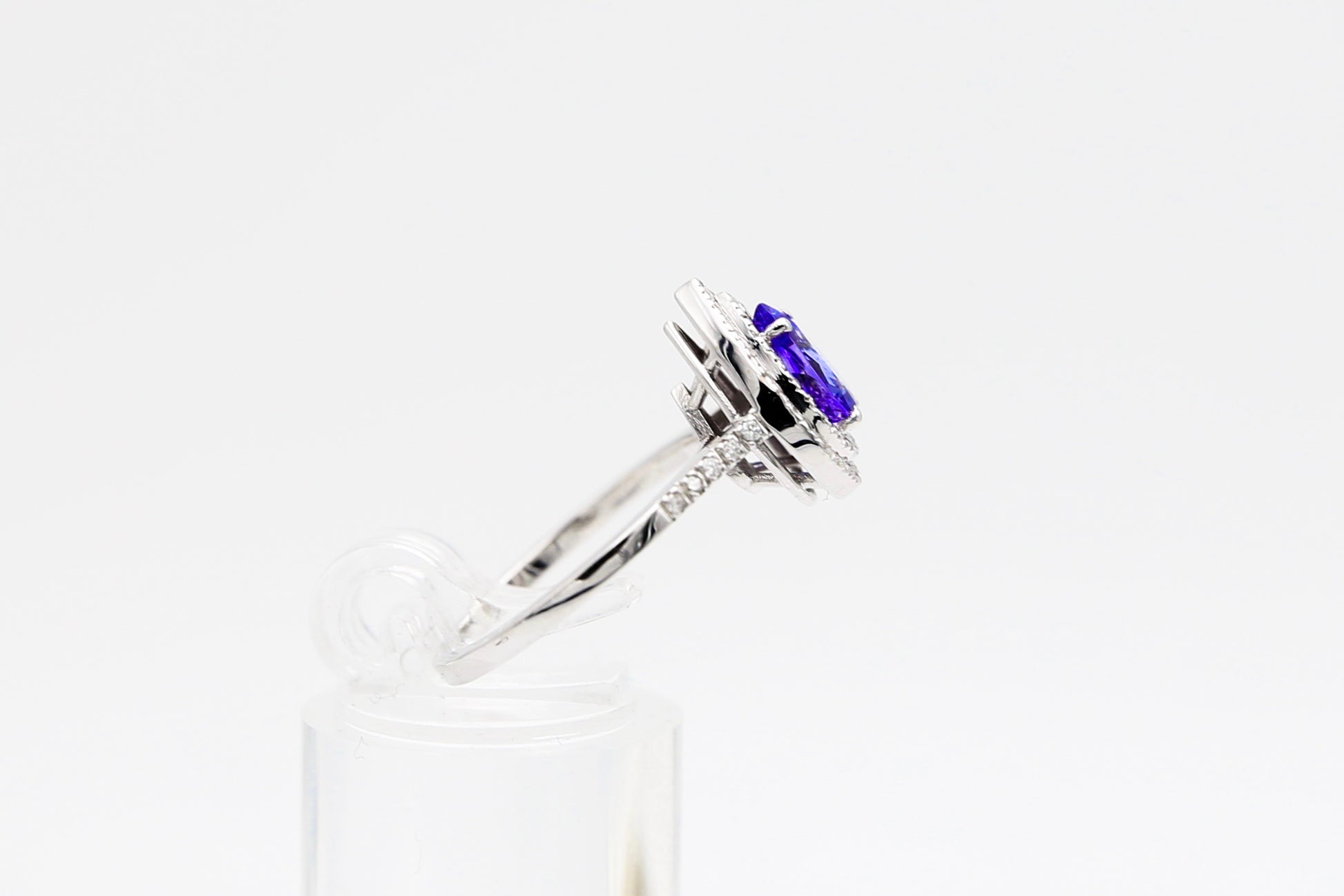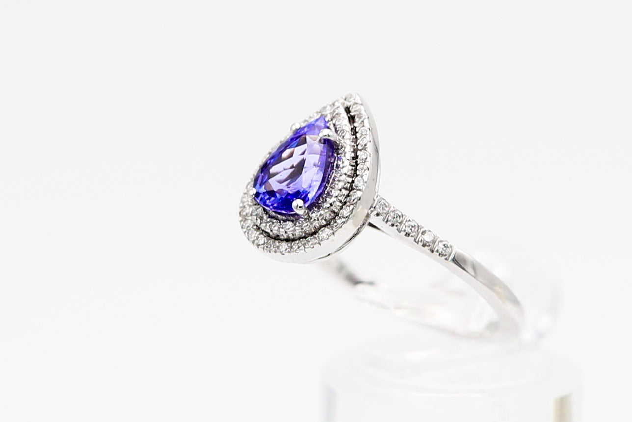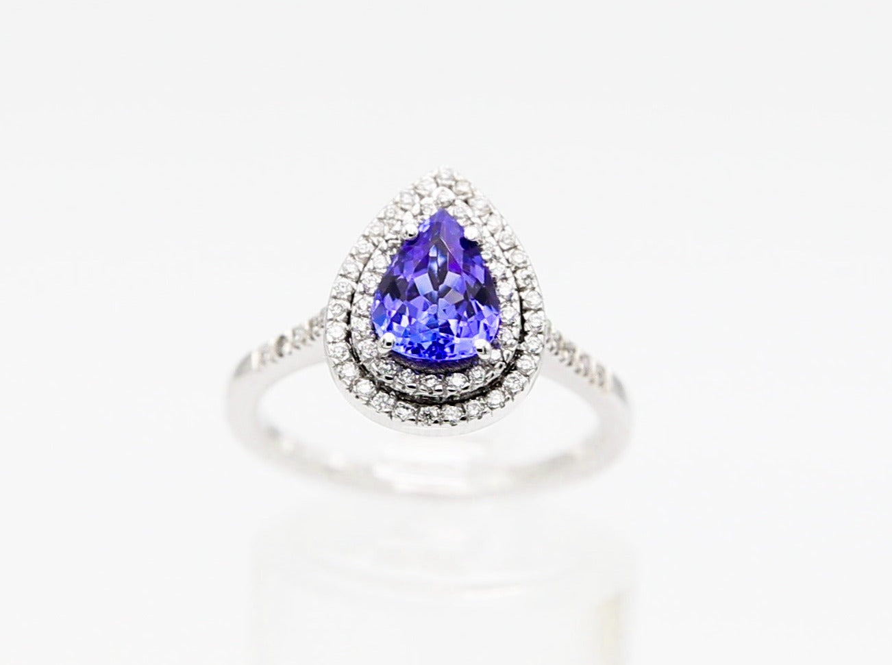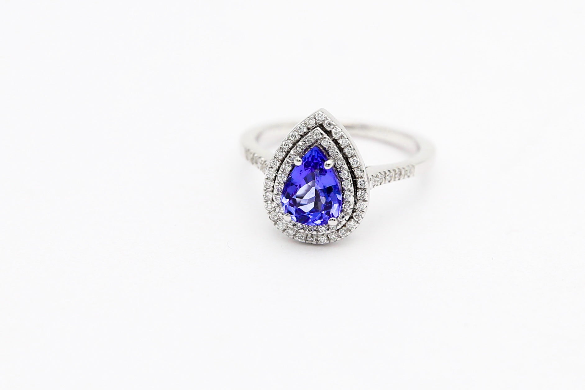 Anello in oro bianco a 18kt con una bellissima tanzanite a goccia dal colore intenso contornata da due file di diamanti raffinato ed elegante da indossare anche per un occasione speciale.