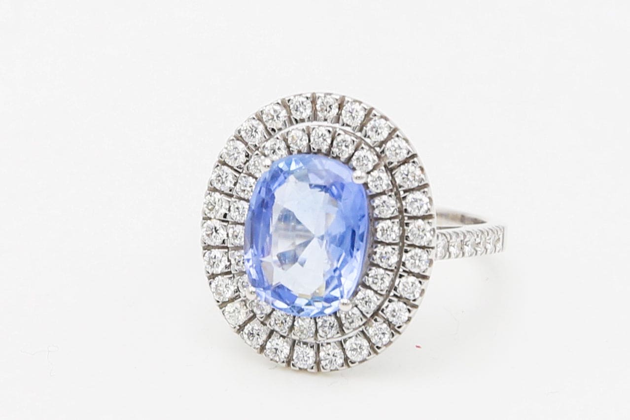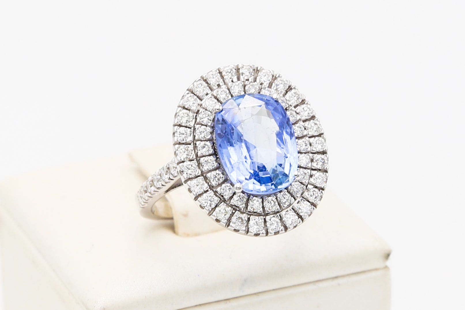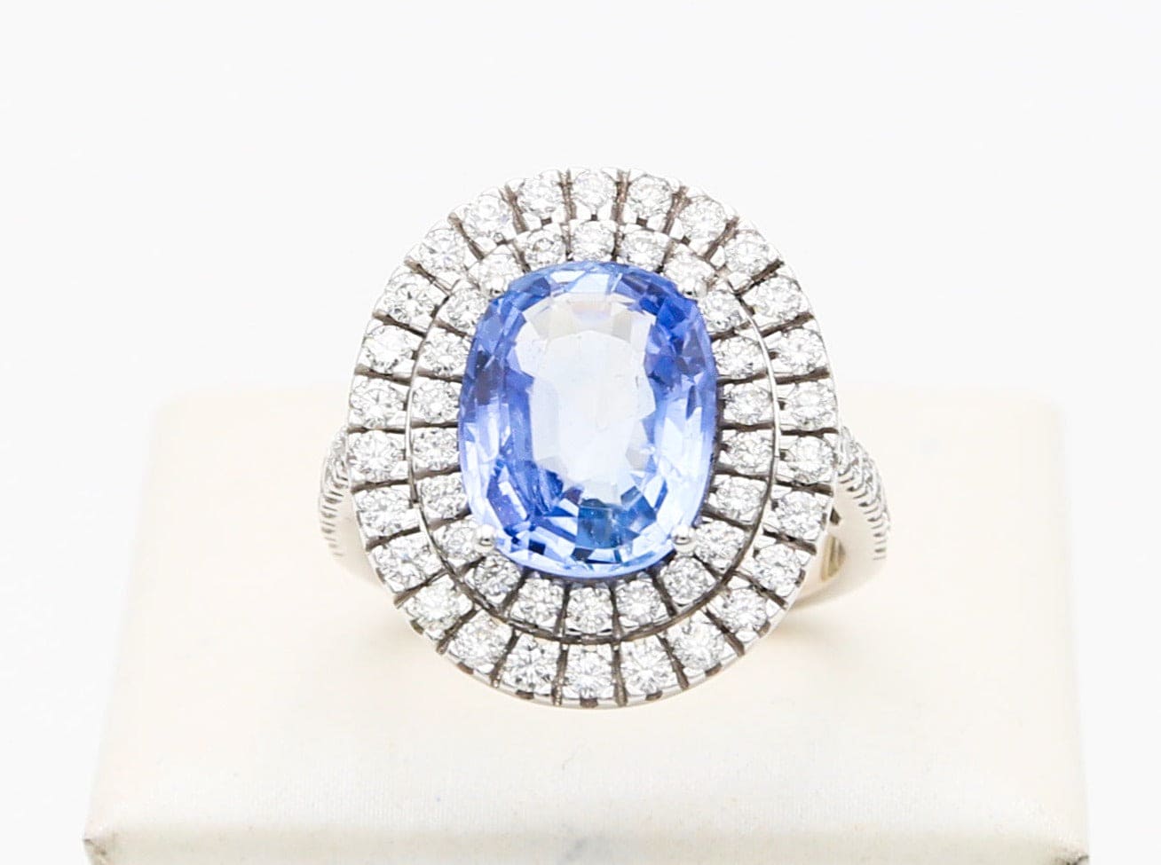 Bellissimo anello in oro bianco 18kt con zaffiro centrale (certificato) contornato con due file di diamanti.