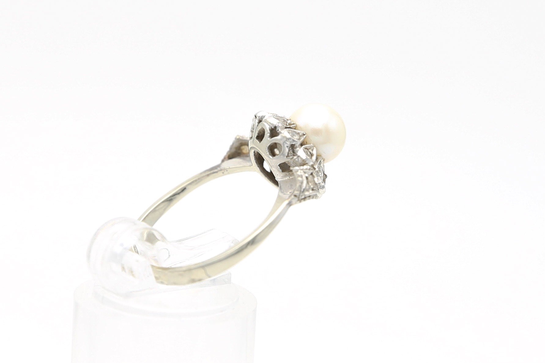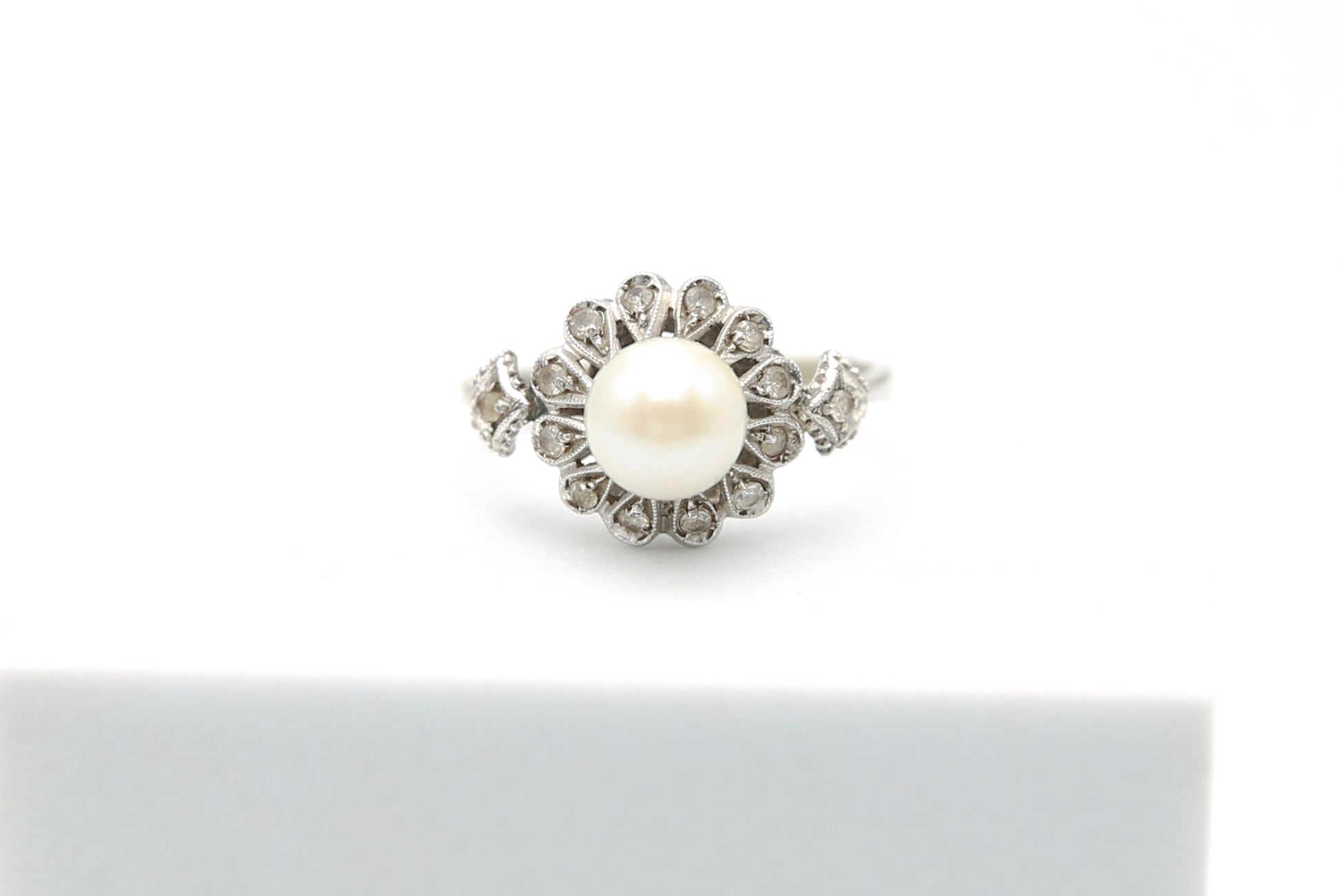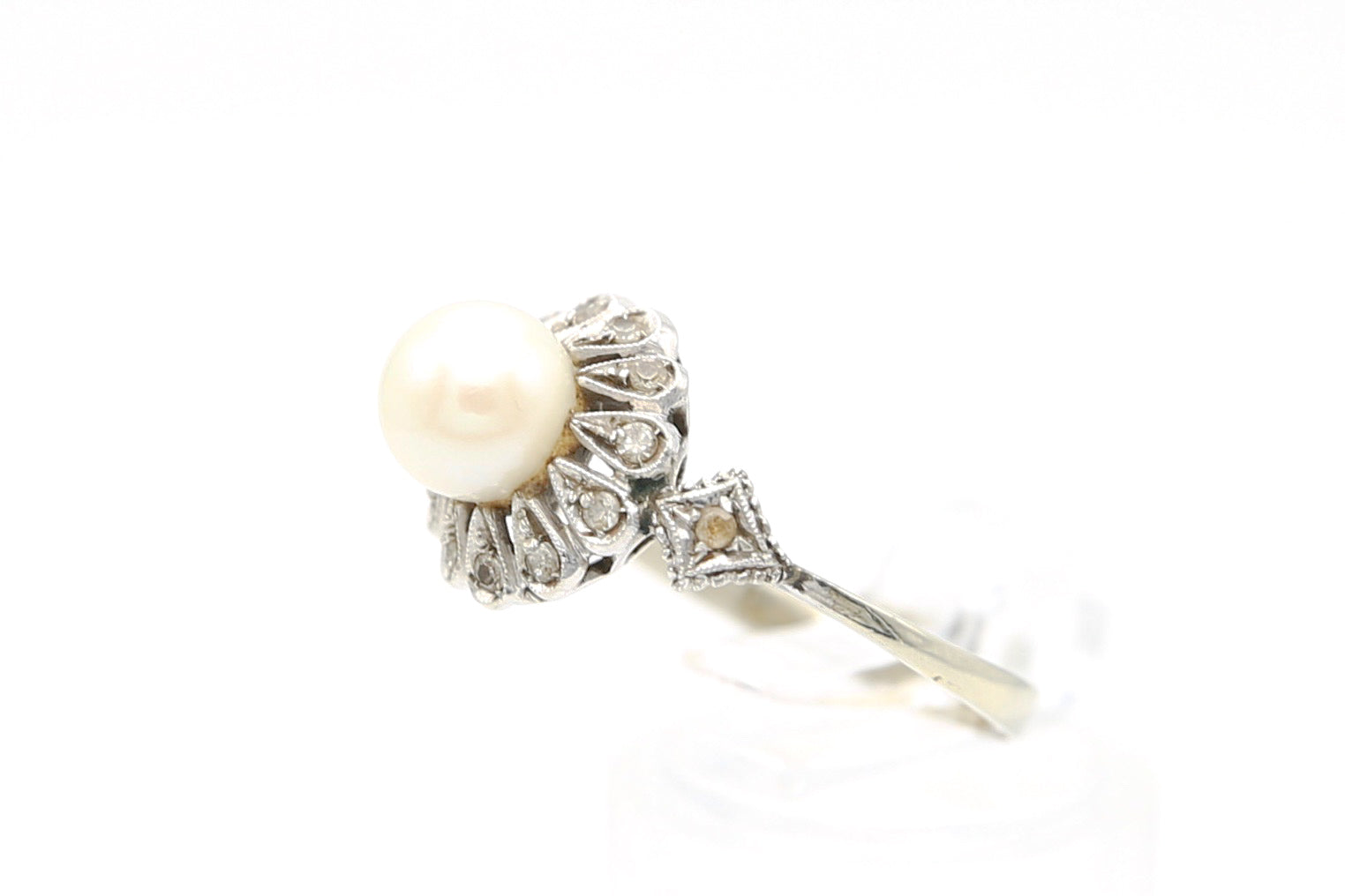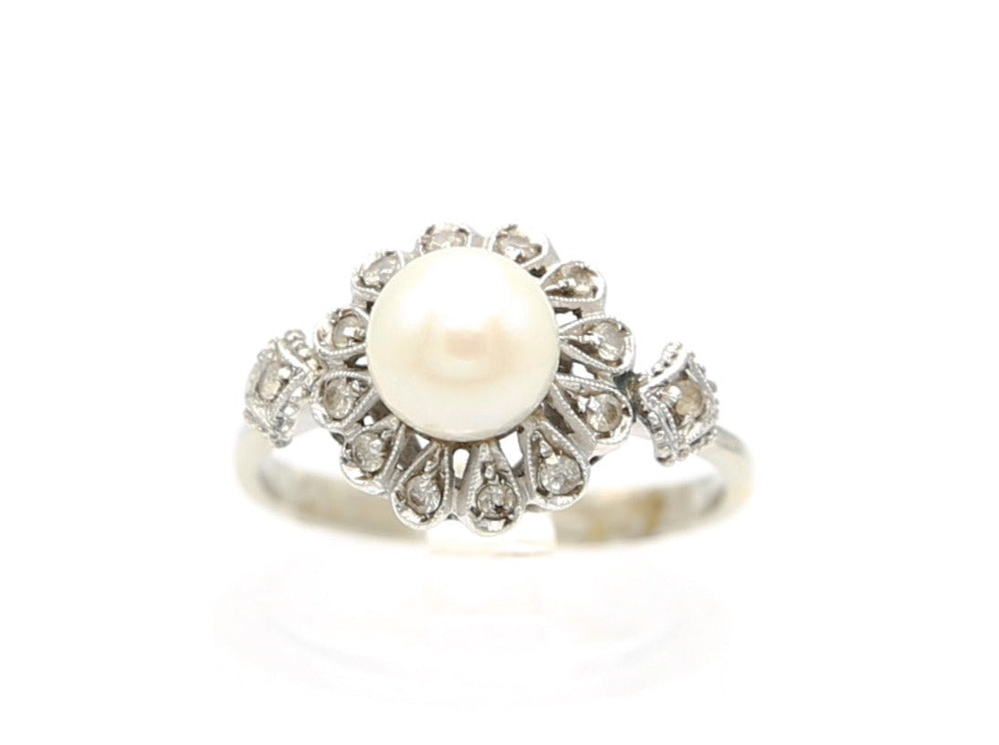 Anello in oro vintage degli anni '60 circa con perla circondato da spinelli incassati in piccoli castoni a forma di goccia in oro bianco 18kt e lavorazione smerigliata tipica del periodo.