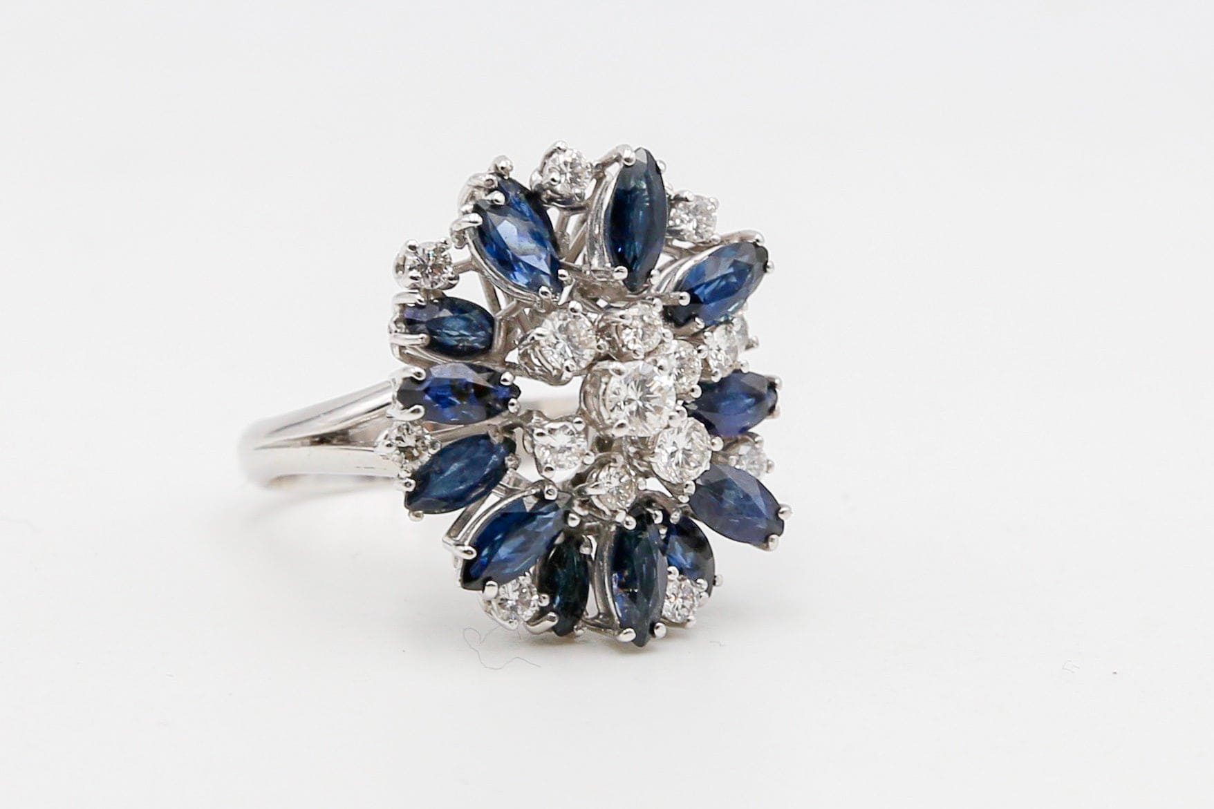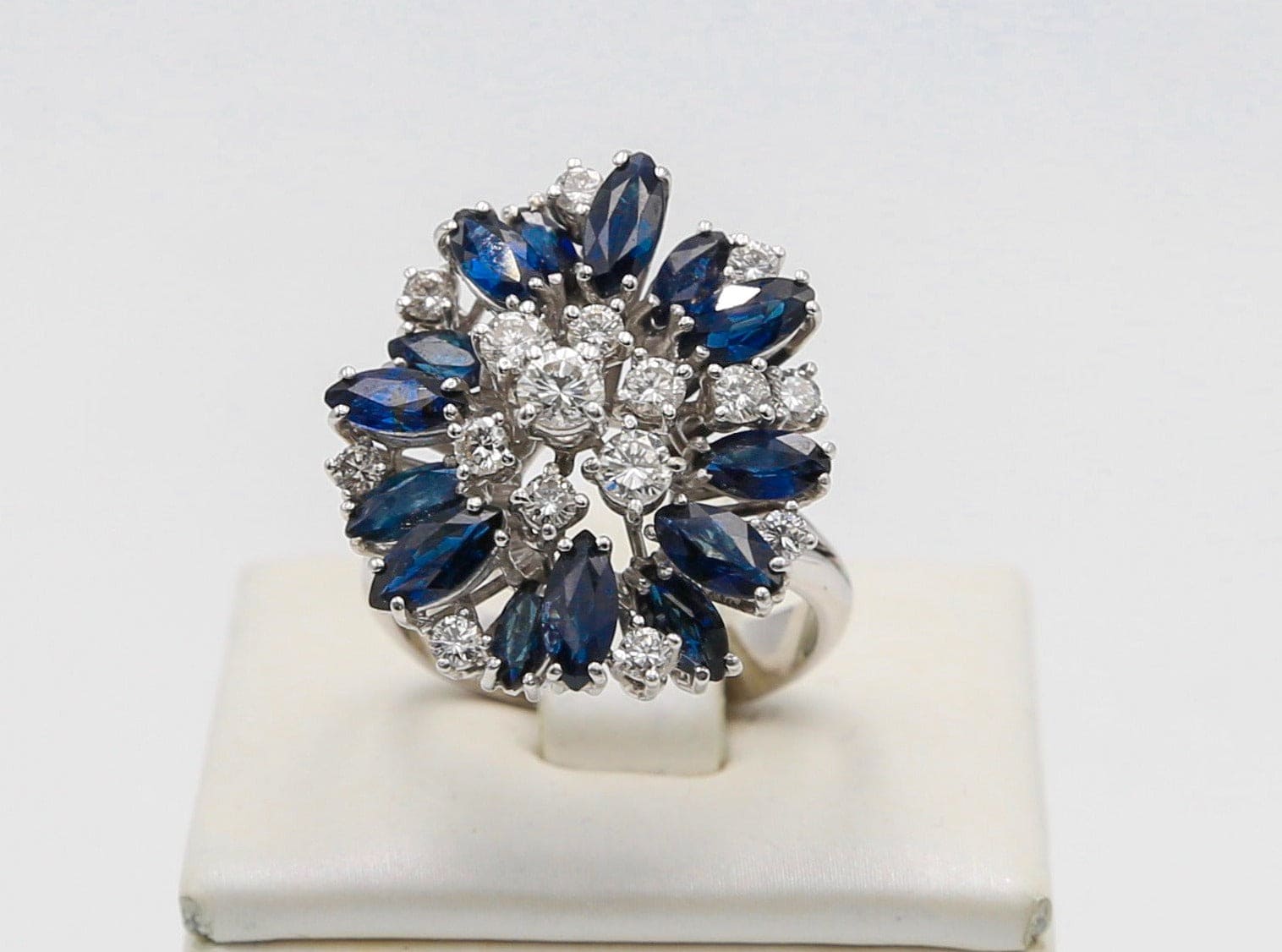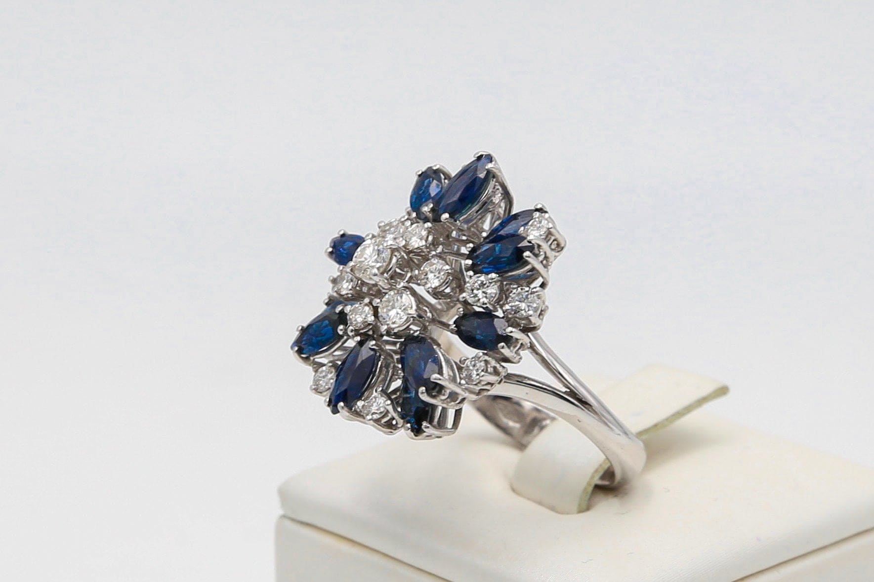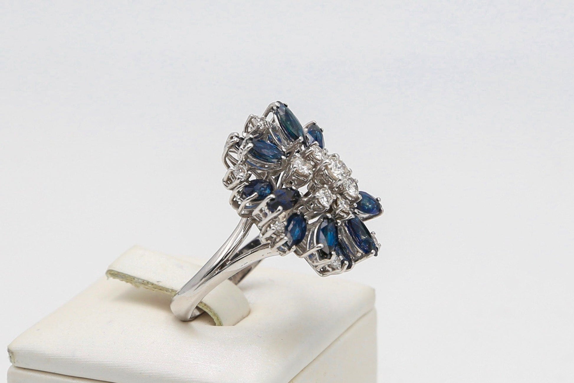 Anello vintage in oro bianco 18kt con splendide navette di zaffiro naturale e diamanti naturali taglio brillante incastonati su sottil griffes di oro bianco disposte su vari livelli.