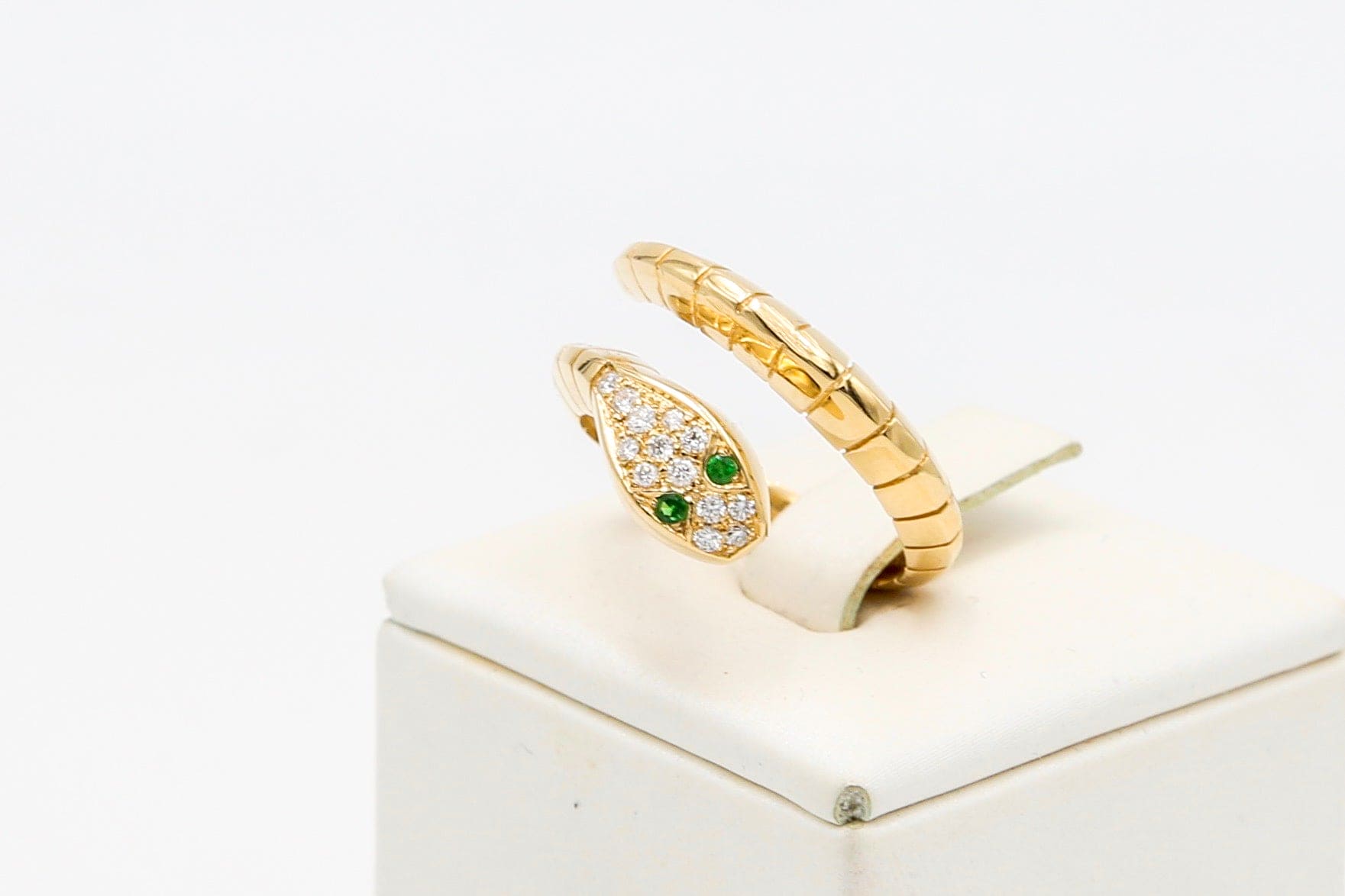 Anello in oro bianco 18 carati con testa di serpente composta da diamanti naturali taglio brillante e due tsavoriti che delineano gli occhi.