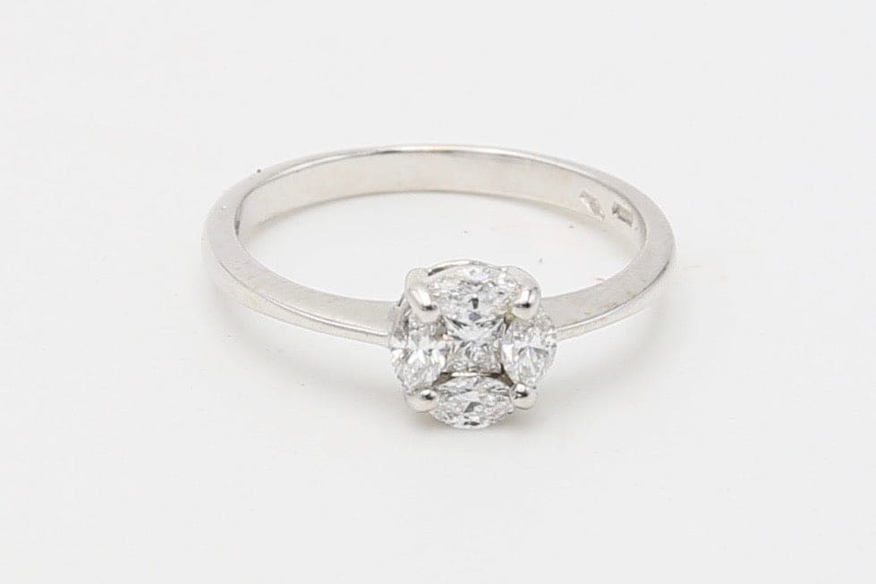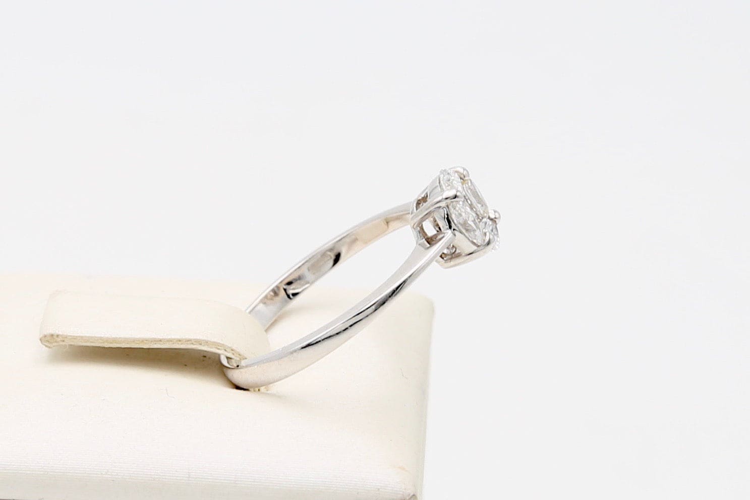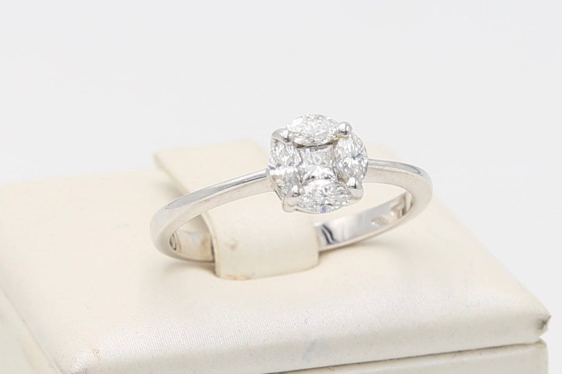 Raffinato anello con diamanti naturali di tagli particolari "navette" e "princess" posti al centro. Particolarmente luminoso, questo gioiello ad effetto solitario. può essere indossato tutti i giorni.