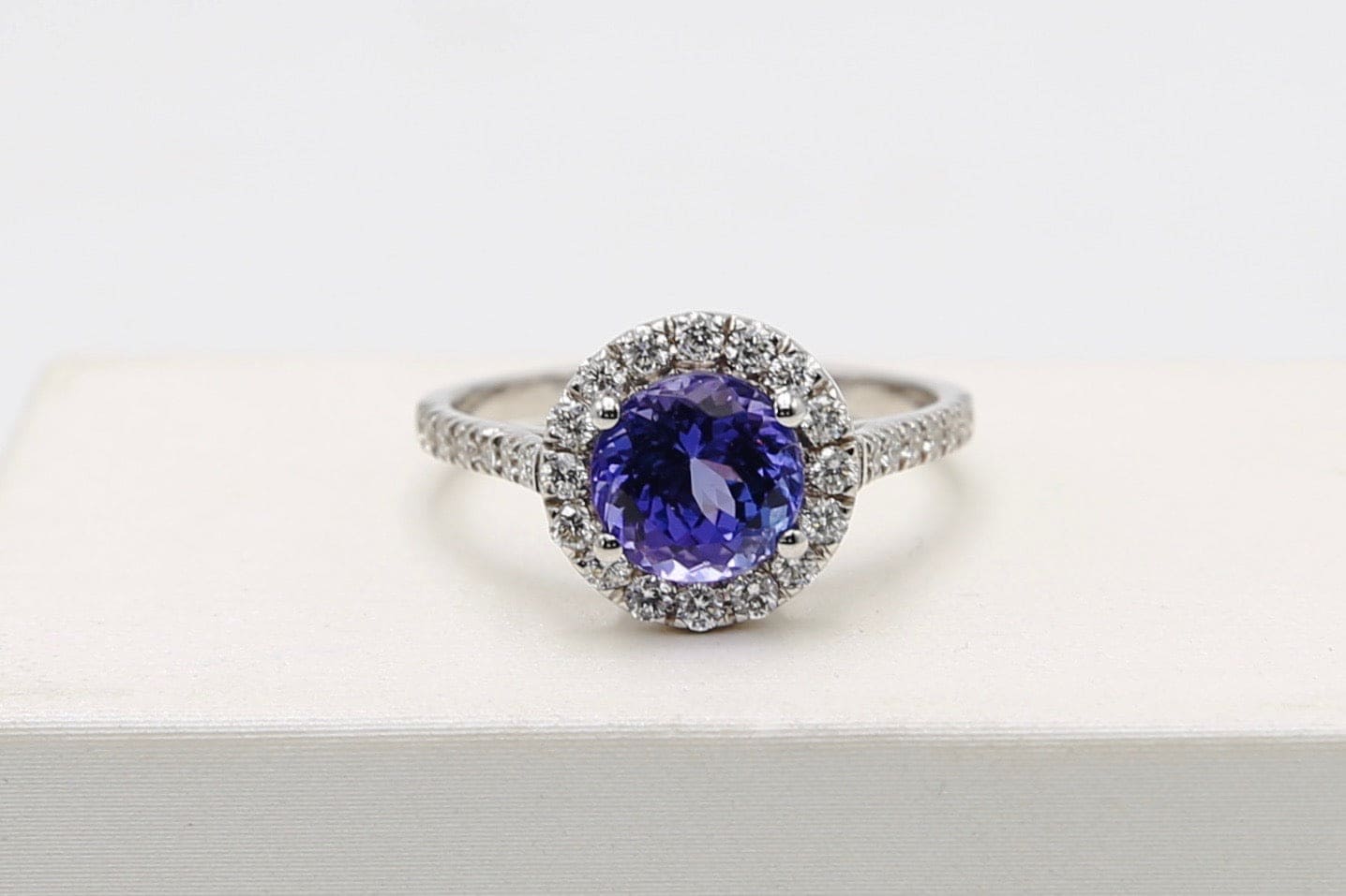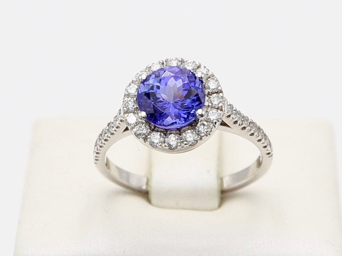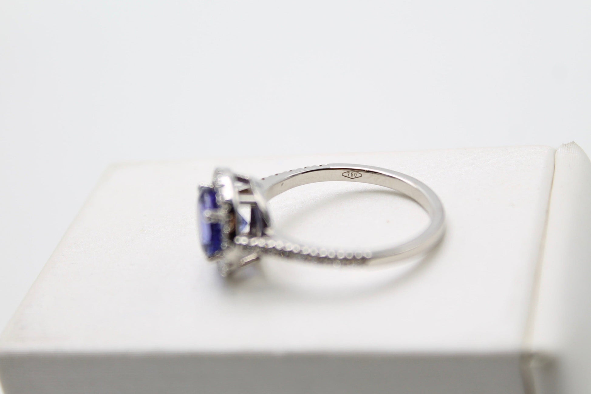 Anello di eccellente fattura, con gemme di ottima qualità e in perfetto stato di conservazione. Realizzato in oro bianco 18 carati con al centro una superba tanzanite di taglio brillante di un bellissimo colore blu intenso, alla tanzanite è una gemma molto apprezzata in gioielleria poiché ha la caratteristica di cambiare la tonalità di colore dal blu al viola in base a come viene colpita dalla luce.