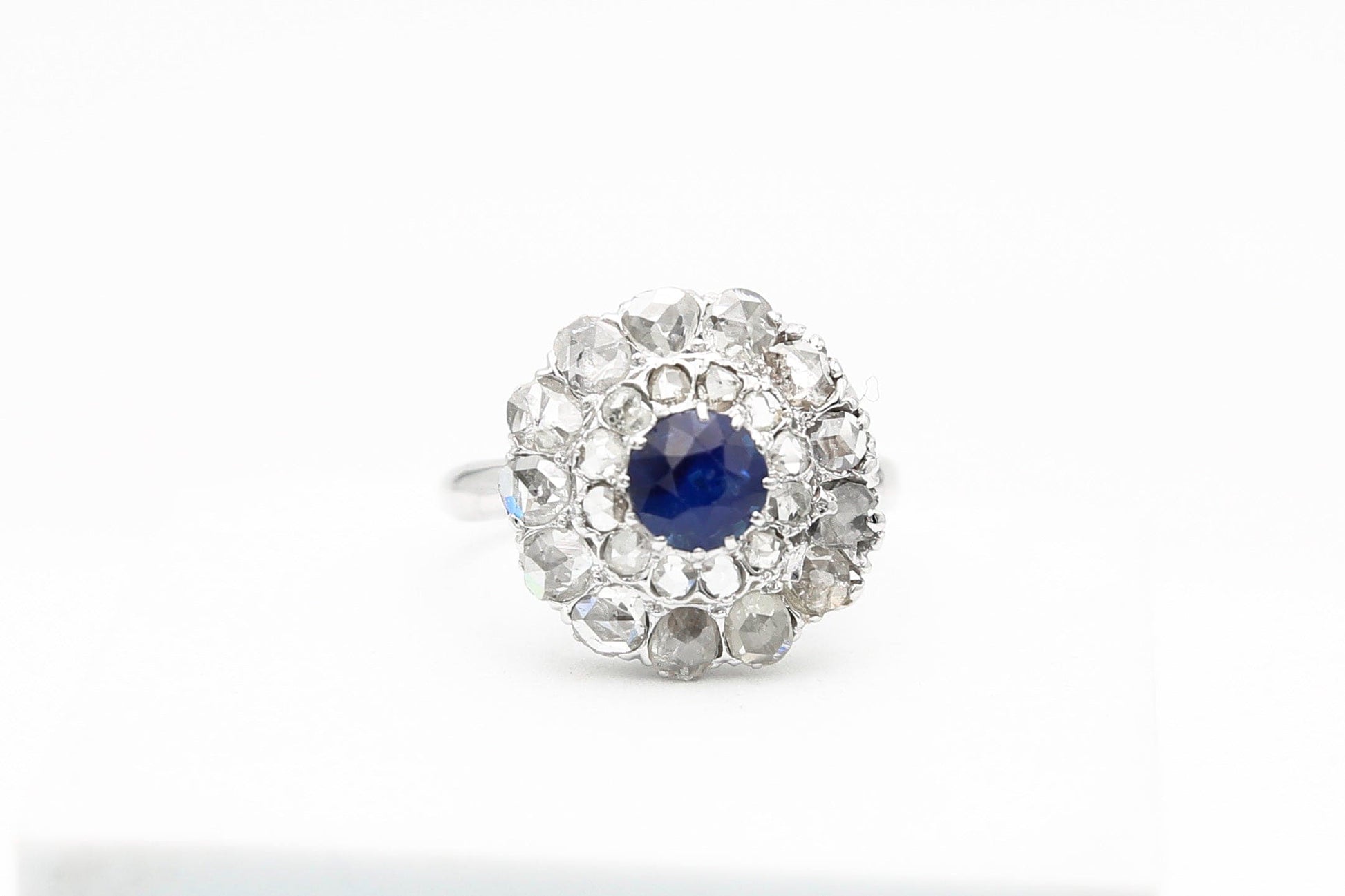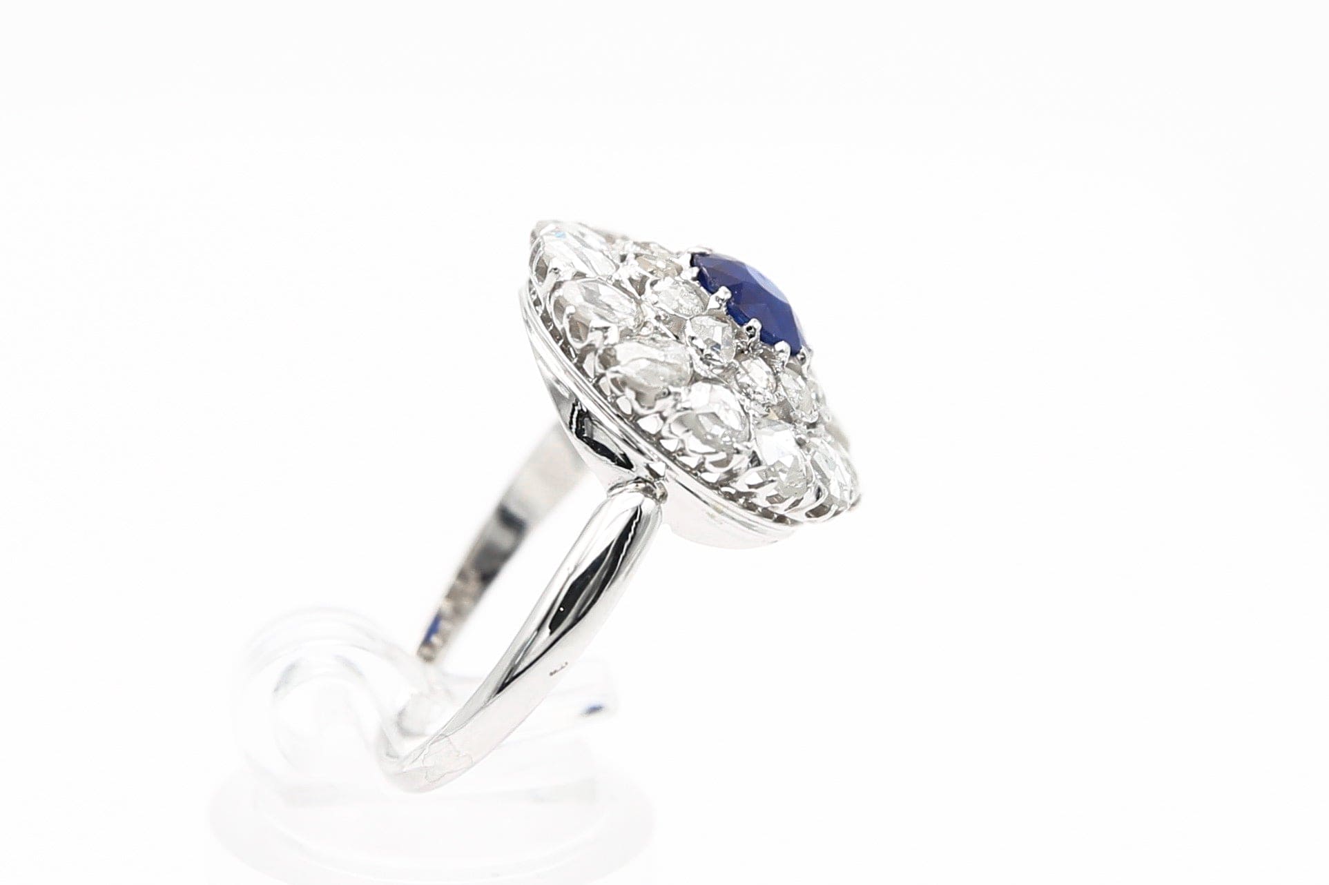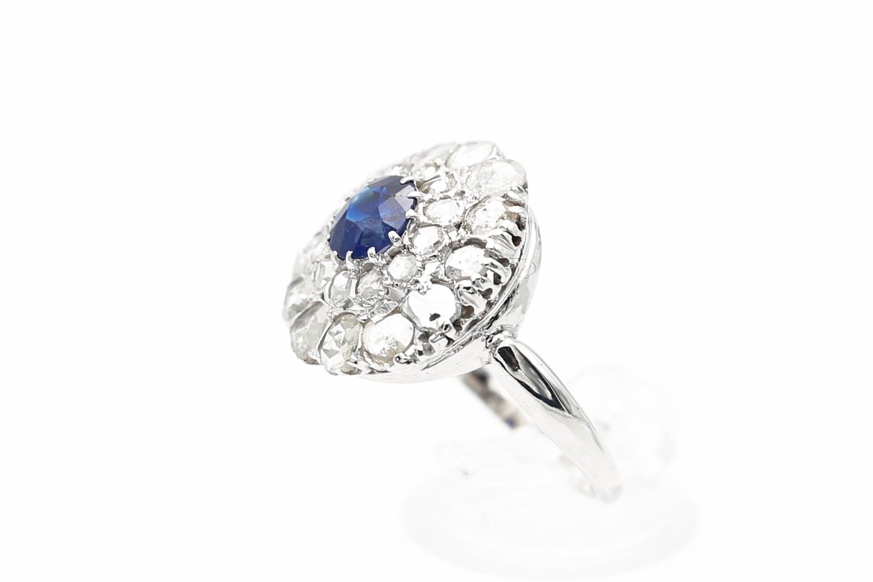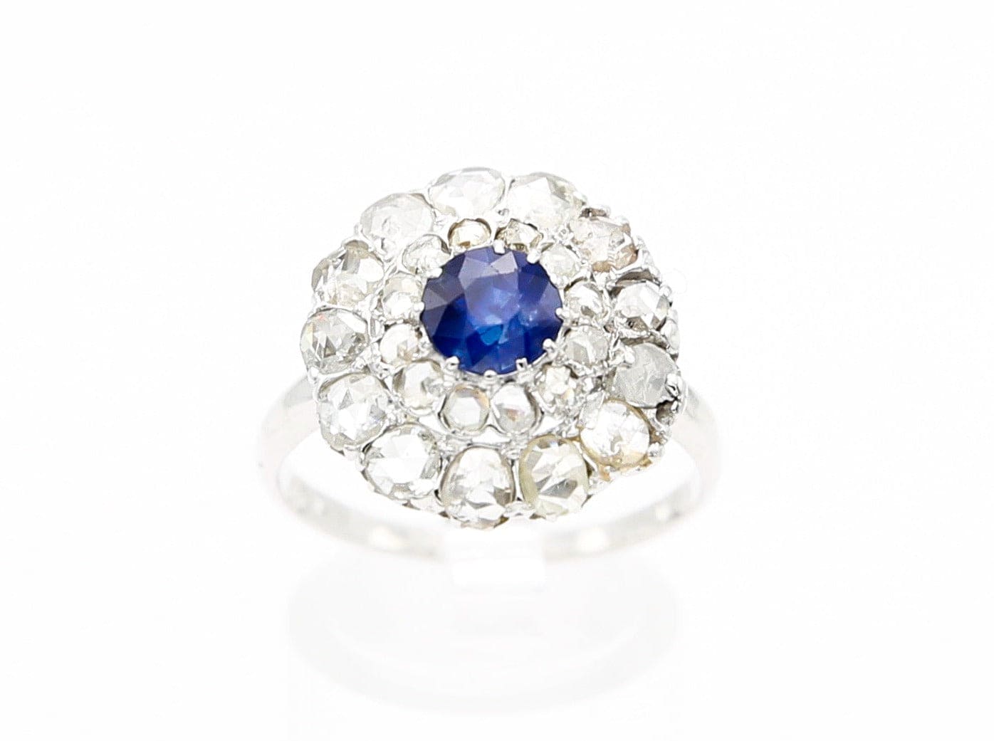 Eccezionale anello vintage modello "toppa" in oro bianco 18 carati con incantevole zaffiro centrale e diamanti taglio rosa corone' di contorno.
