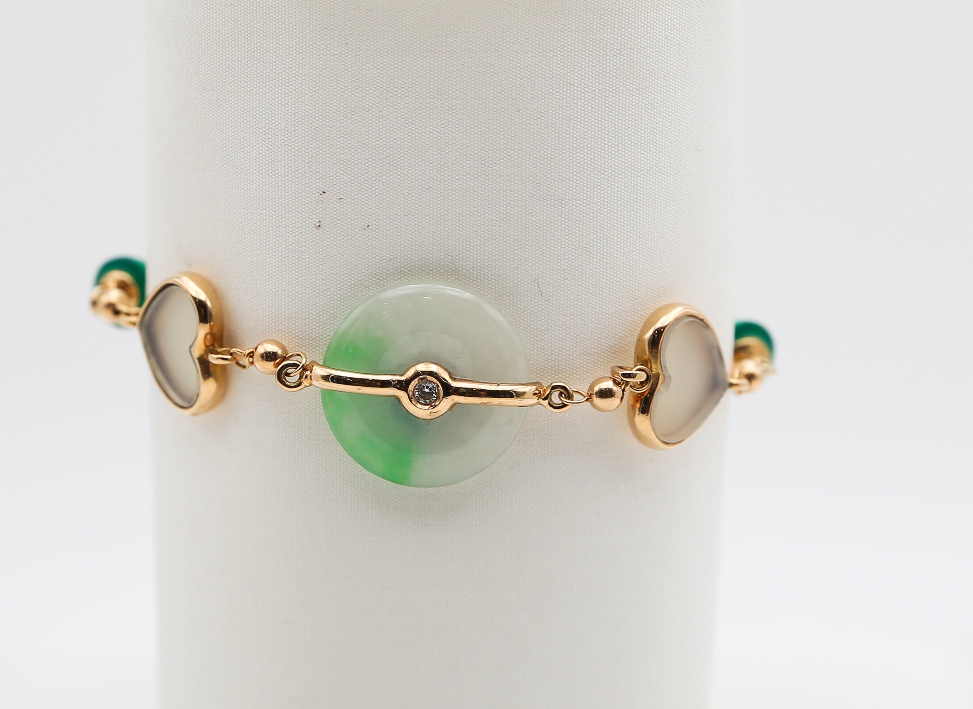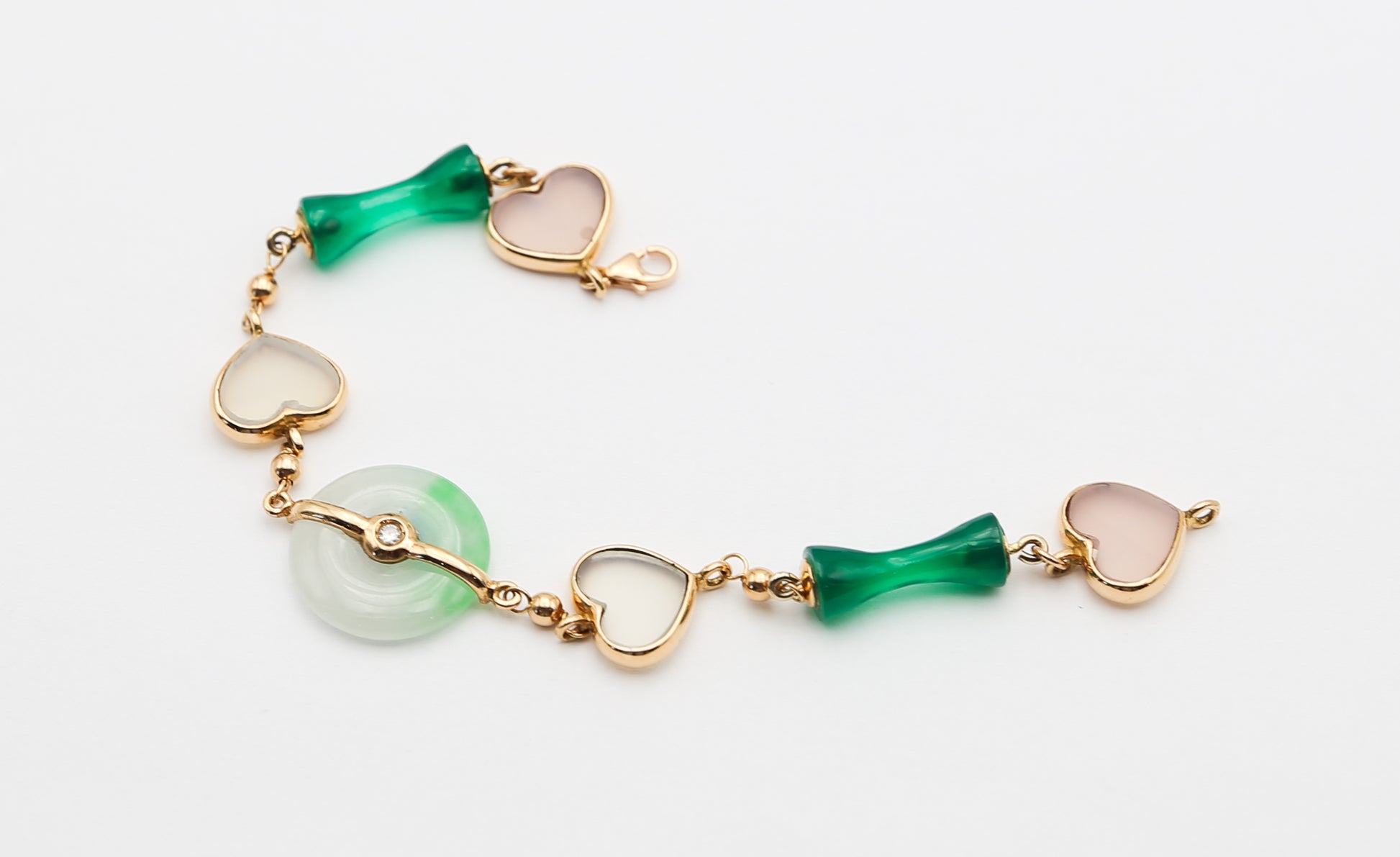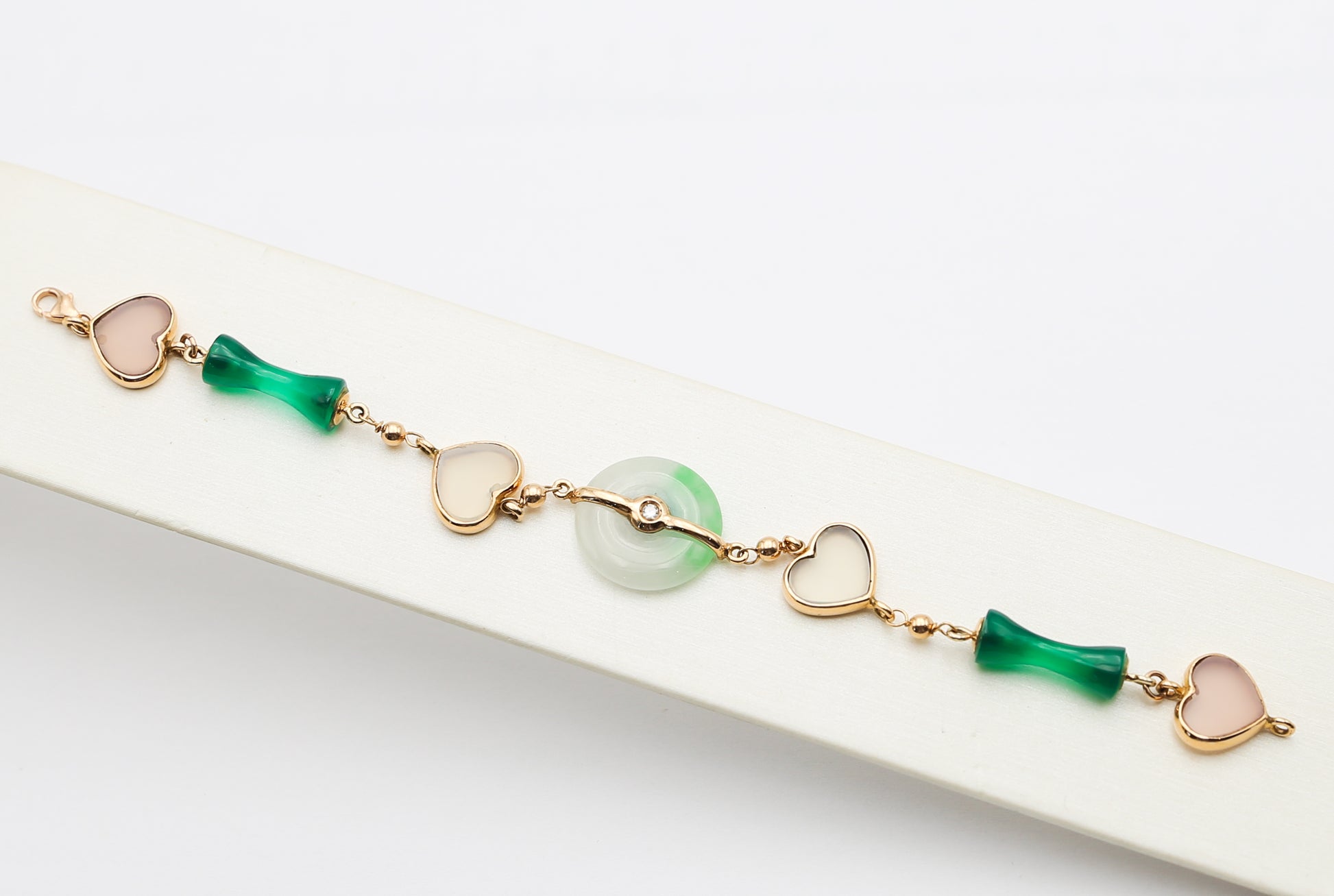 Bracciale in oro rosa 18 kt con elementi a cuore e al centro spicca una splendida giada burma adornata da un diamantino che aggiunge un tocco raffinato ed elegante.