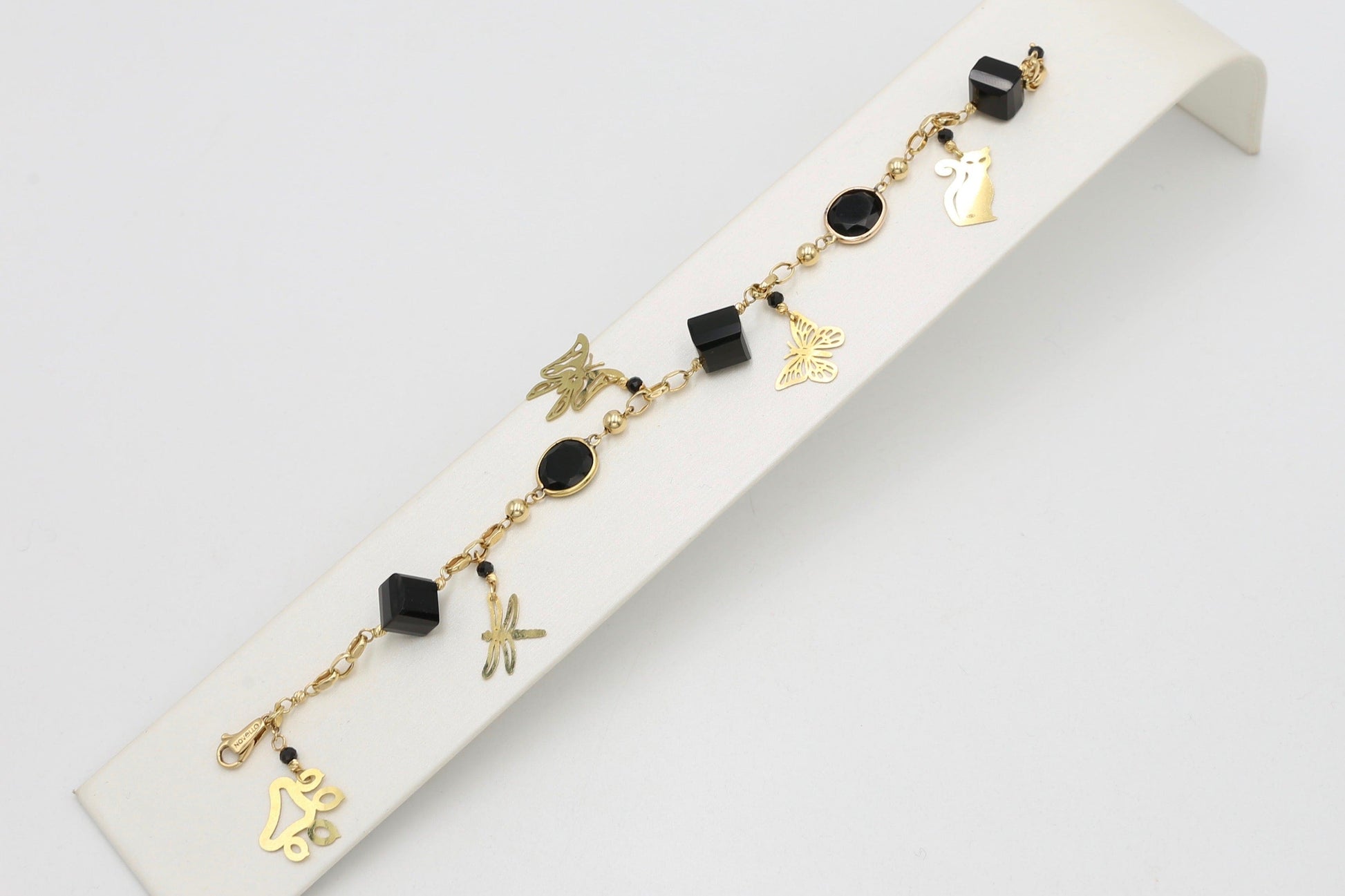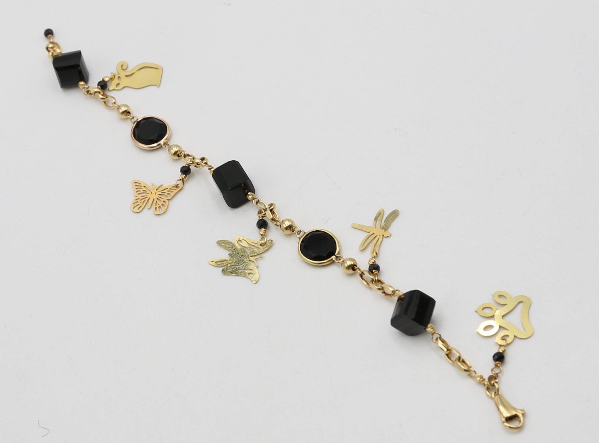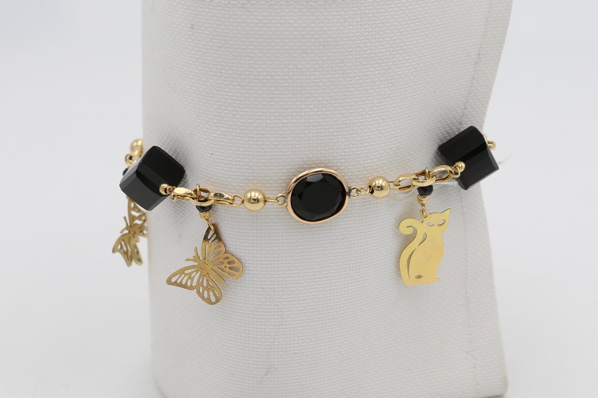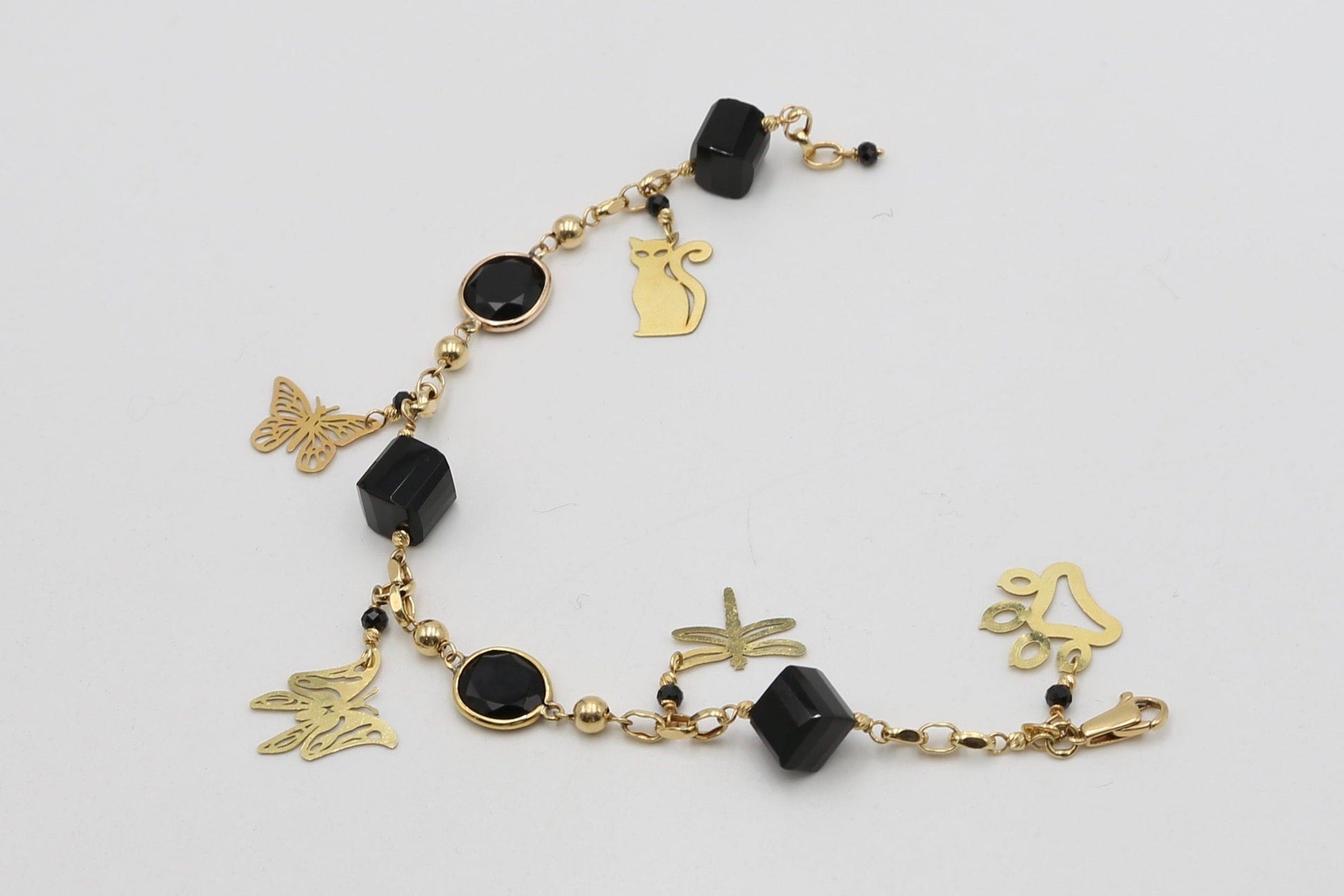 Splendido bracciale a catena d'oro giallo 18 kt, arricchito da elementi di onice e pendenti in oro a forma di animali. Realizzato da abili artigiani italiani, il gioiello presenta una combinazione unica di materiali di alta qualità. Con i suoi 2 onici ovali, 3 onici cubici e 6 spinelli sferici, questo bracciale rappresenta una scelta di stile senza tempo per chi ama il lusso.