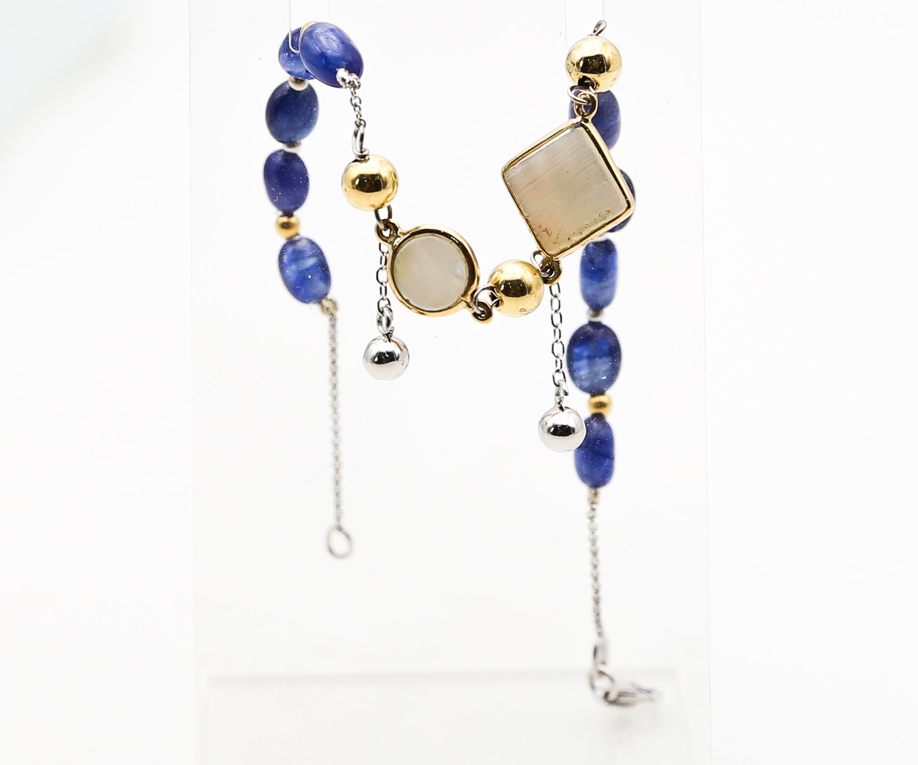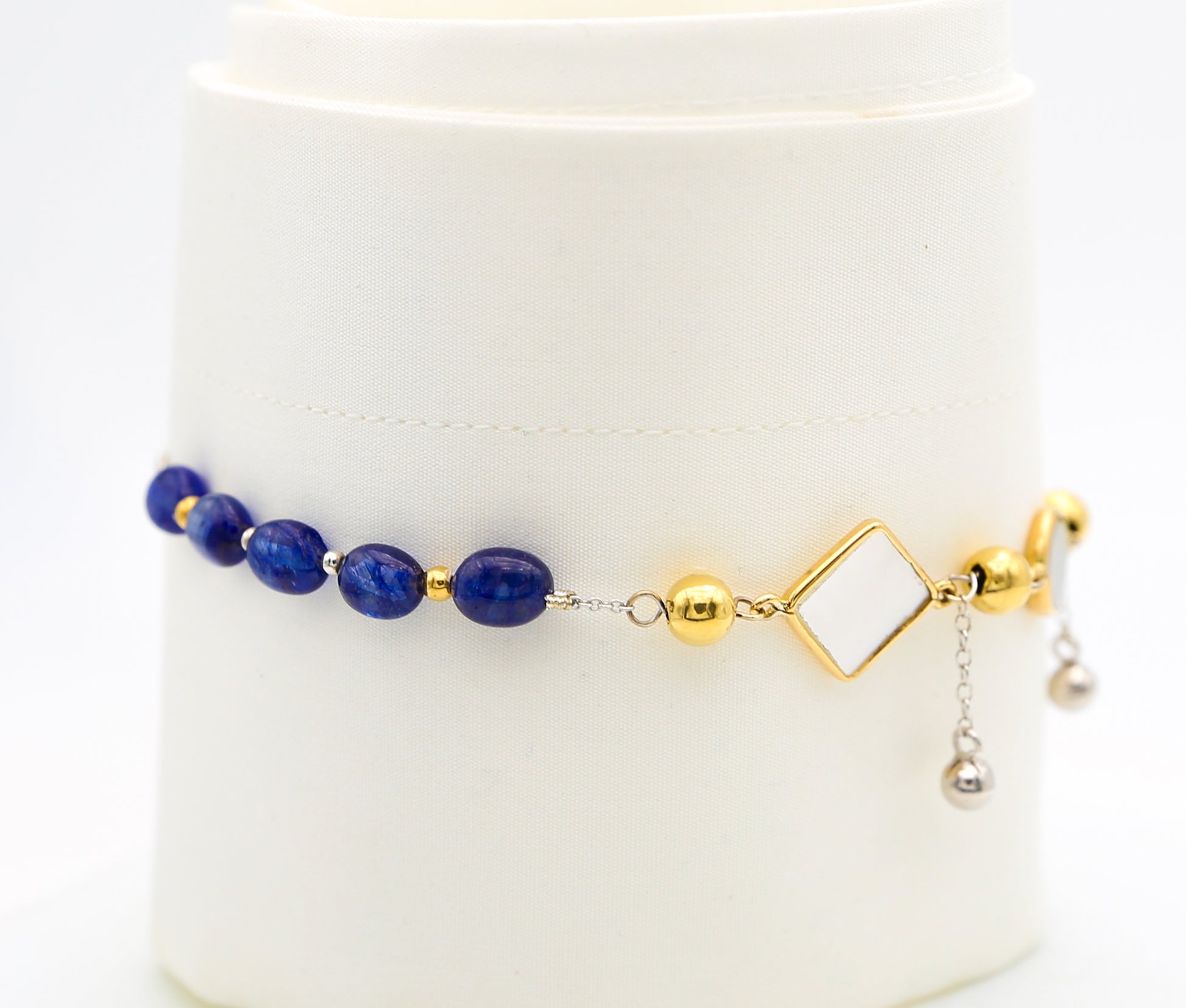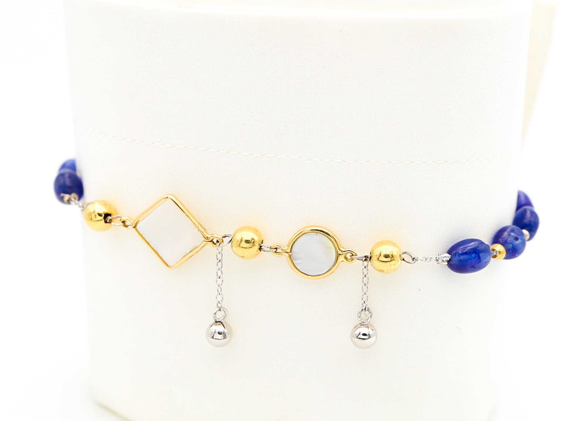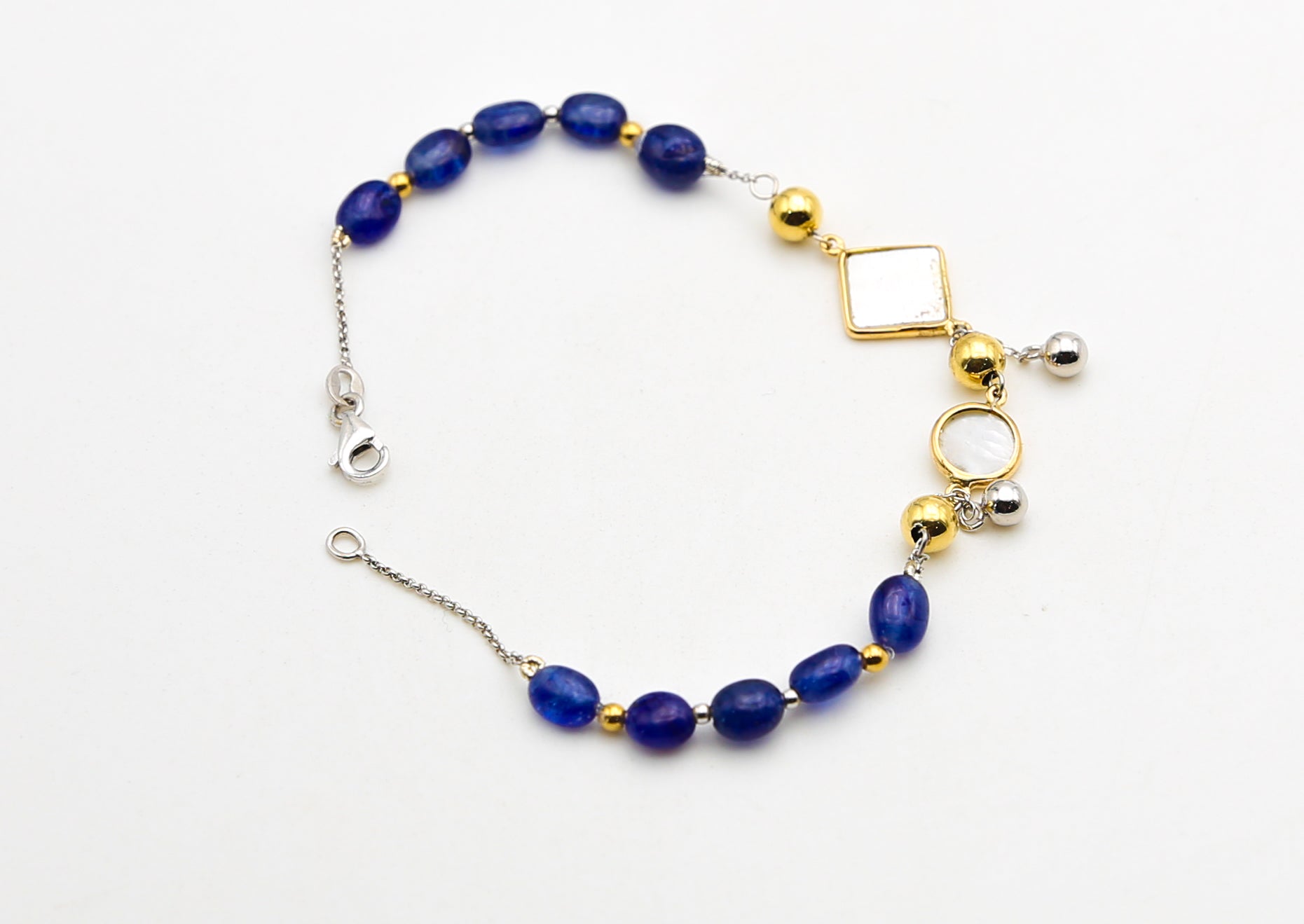 Bracciale in oro giallo e bianco 18 kt con 10 zaffiri, alternati da micropalline in oro e dettagli in madreperla.