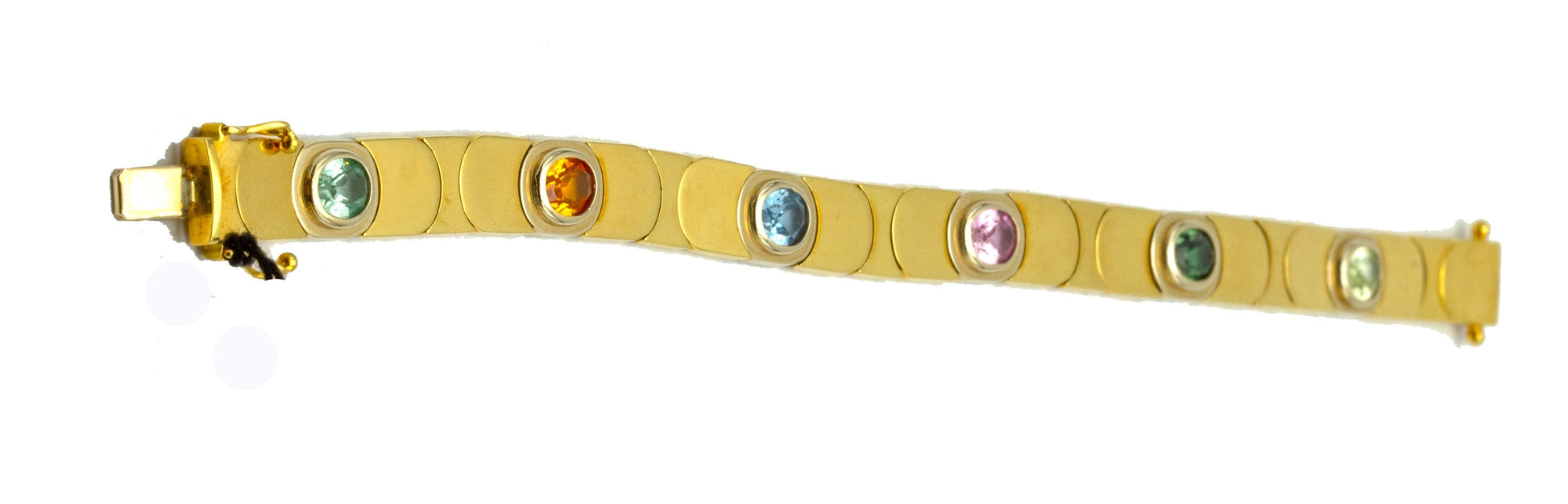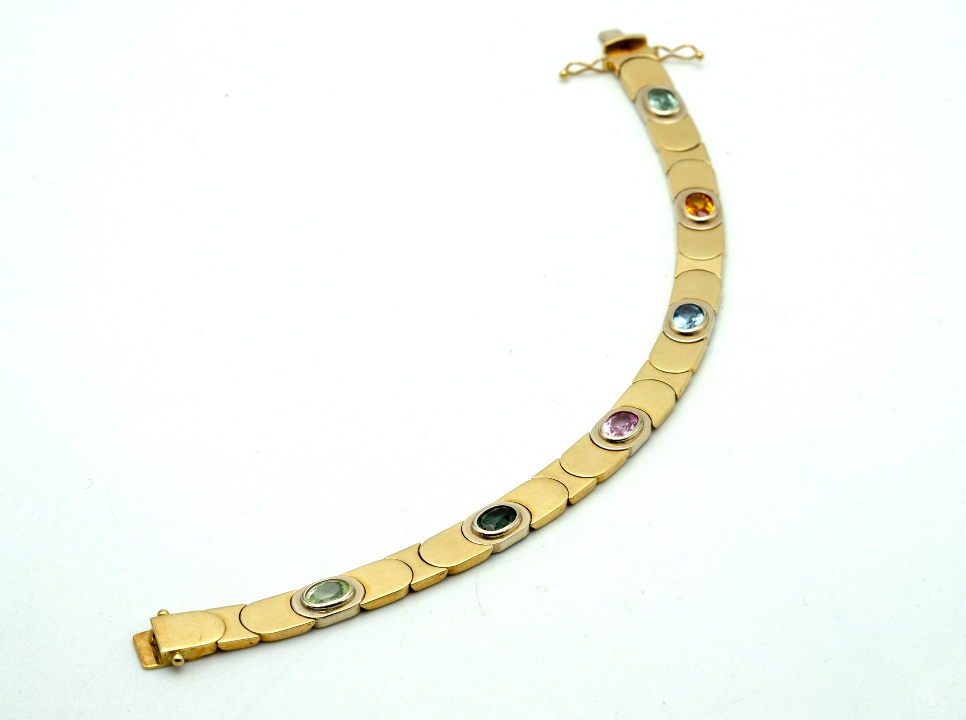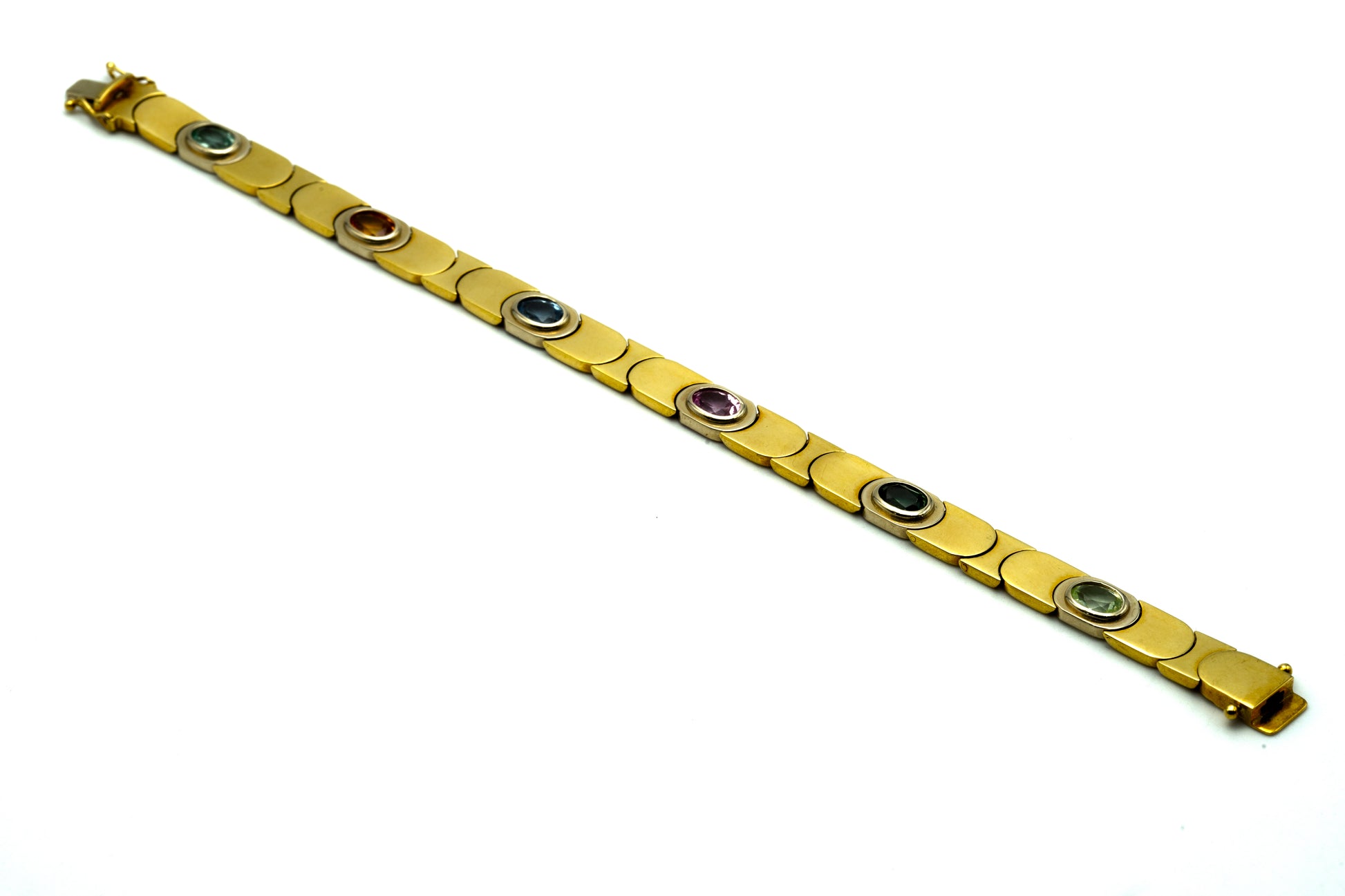 Bracciale in oro giallo 18kt maglia piatta vintage degli anni '80 circa chiusura a scomparsa con doppio otto di sicurezza impreziosito da pietre naturali incastonate.