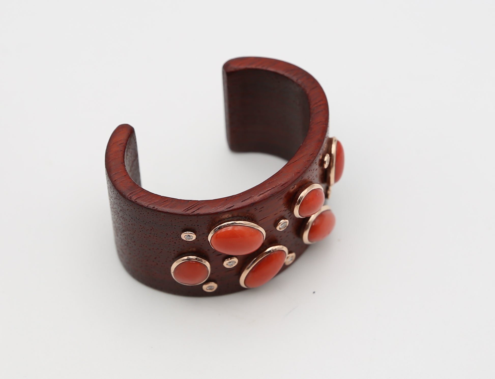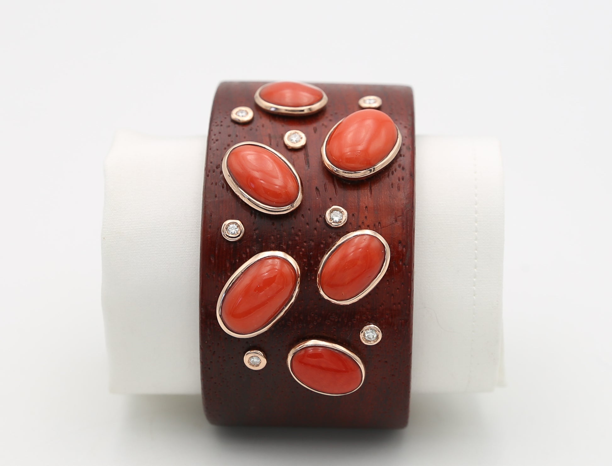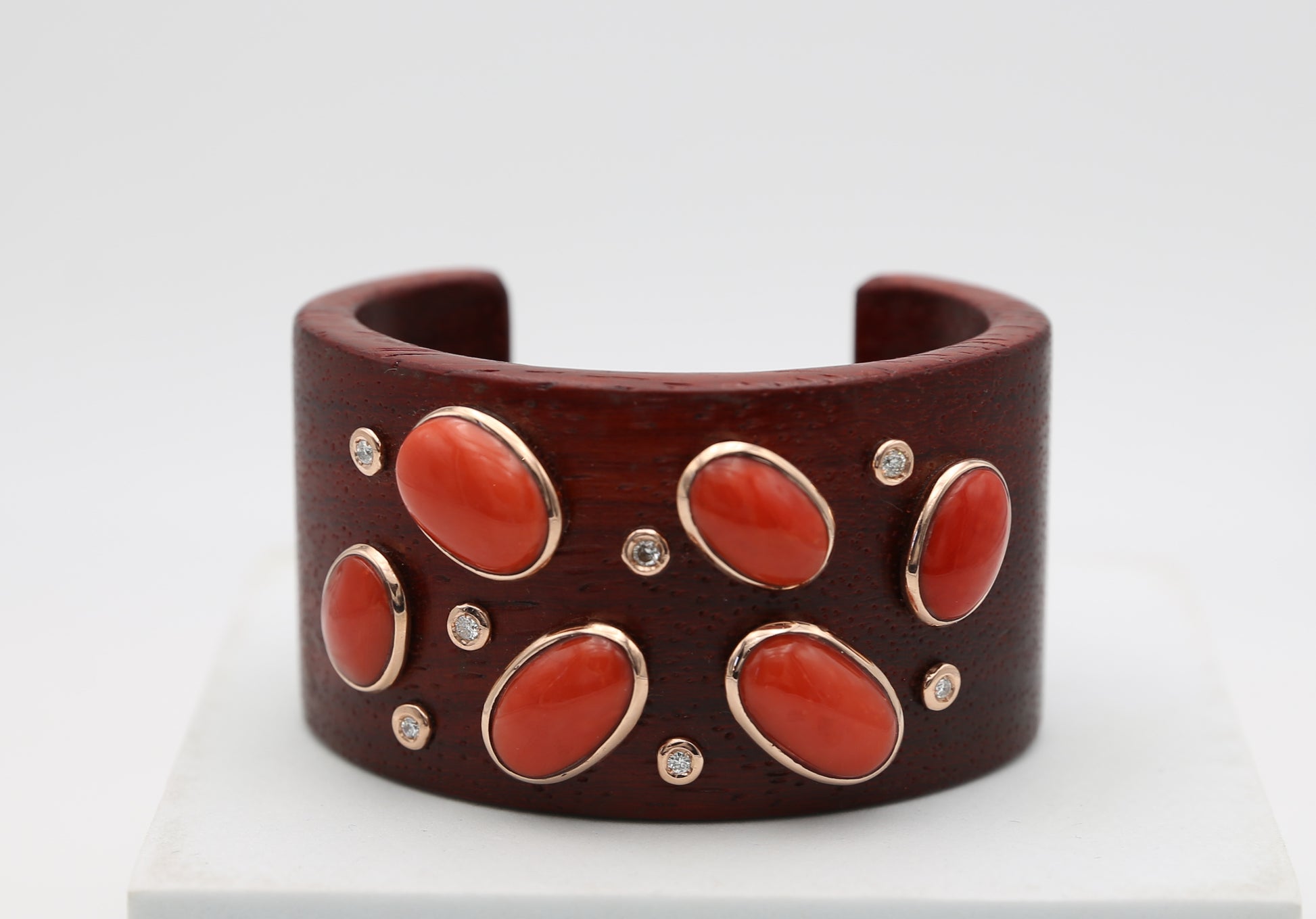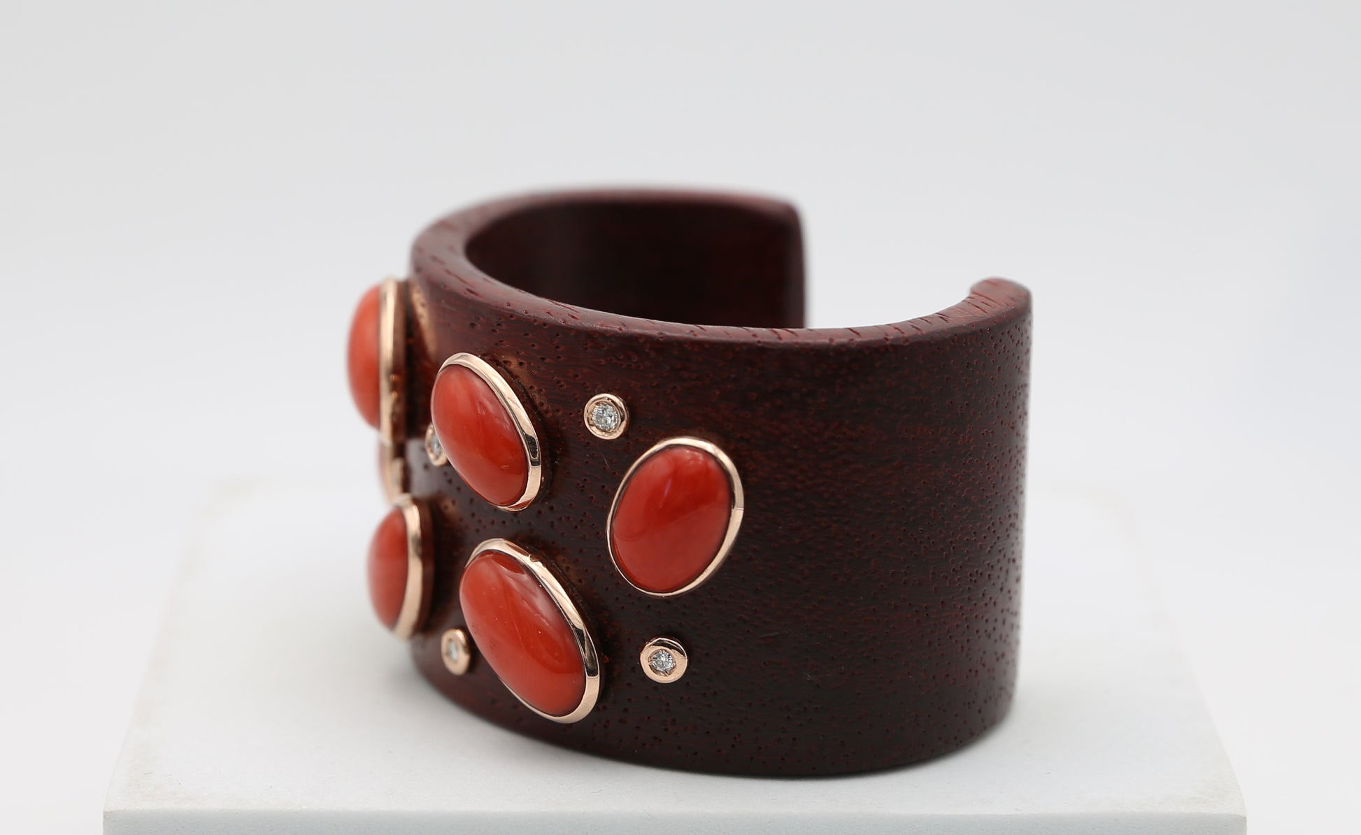 Bracciale rigido in legno con inserti in oro giallo 9 kt, decorato con sette diamanti e sei coralli cabochon partenopei.