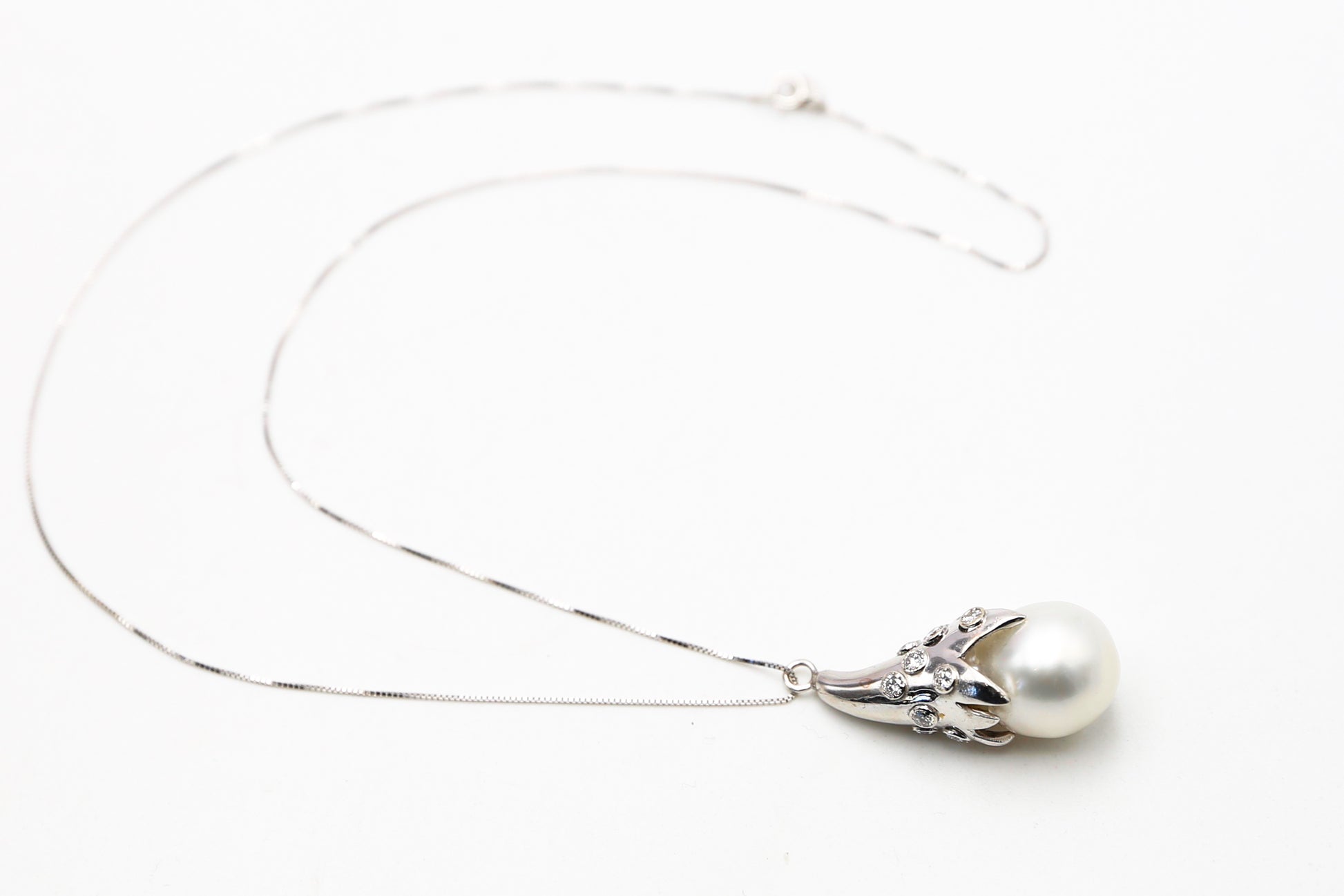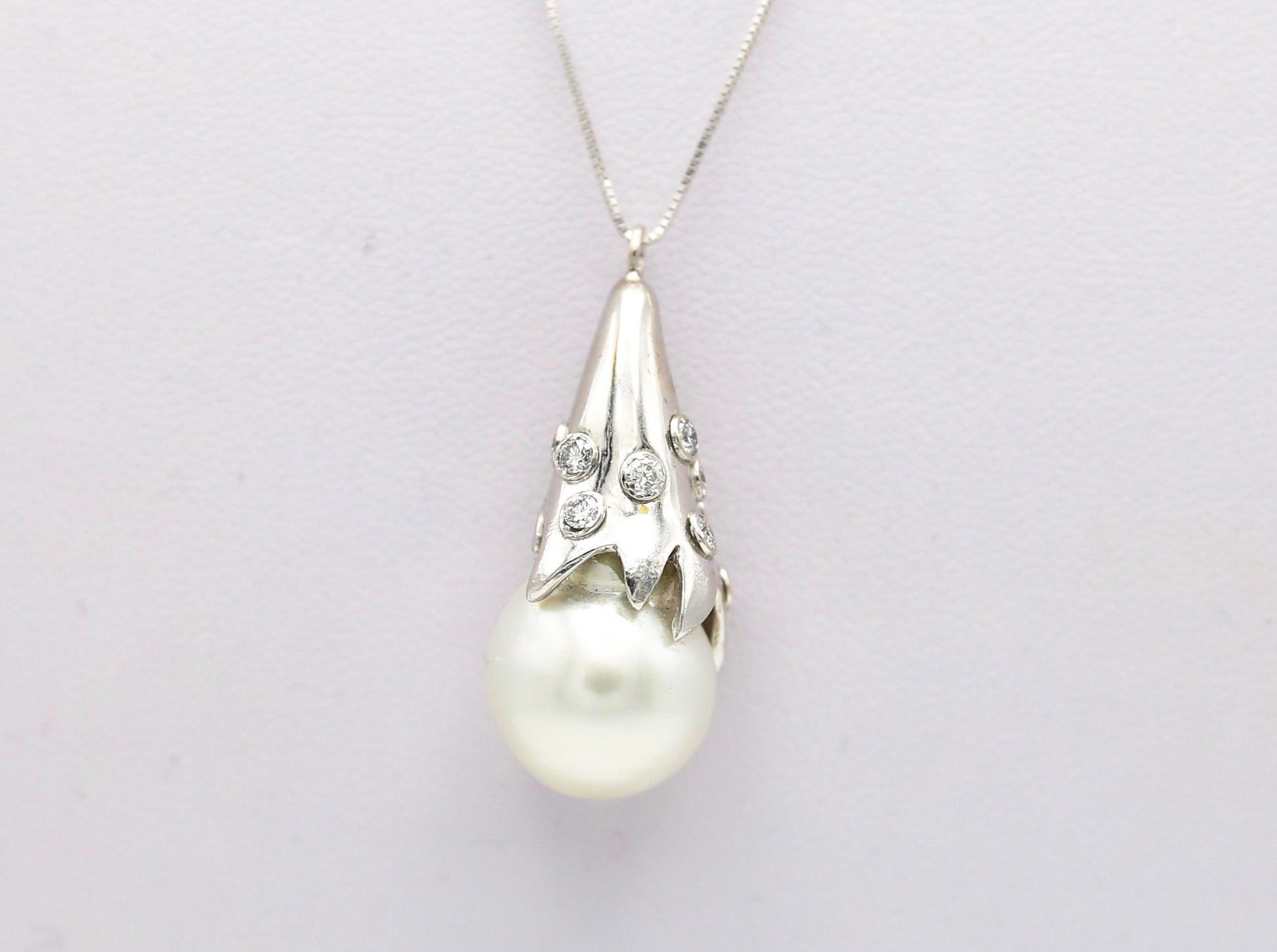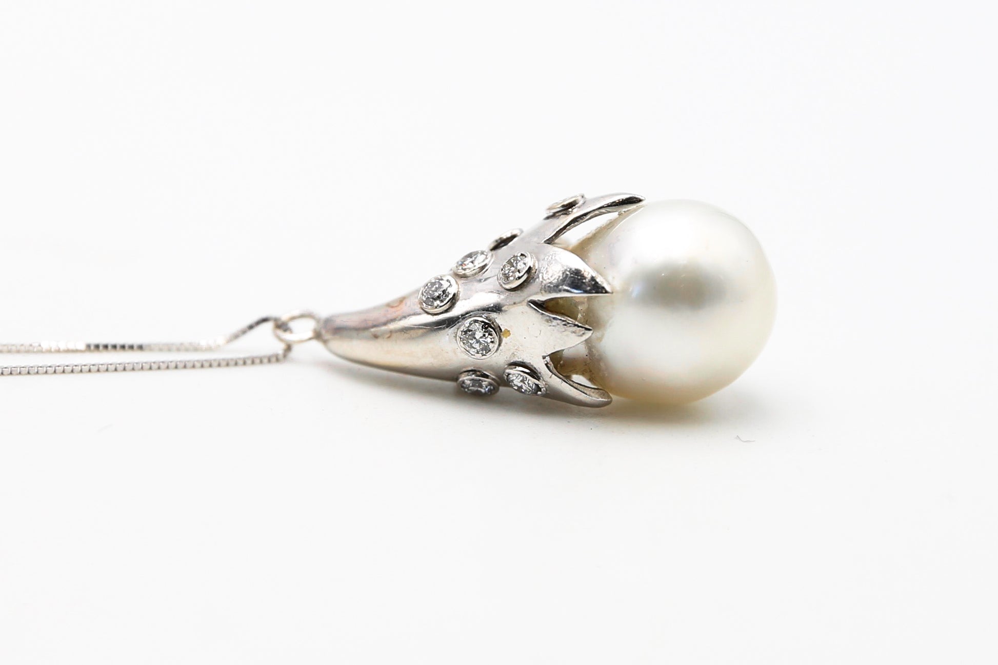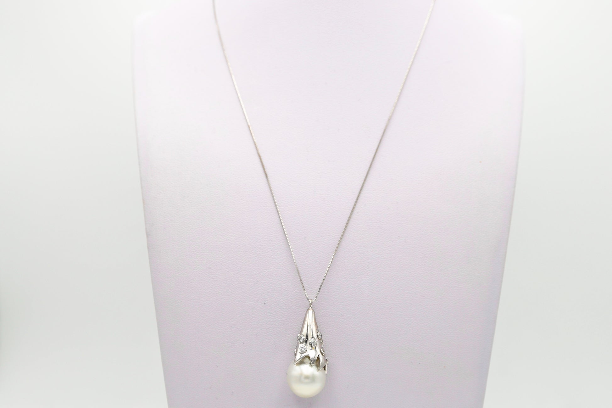 Catenina in oro bianco 18kt maglia veneziana con ciondolo pendente realizzato con perla barocca australiana e diamanti taglio antico.