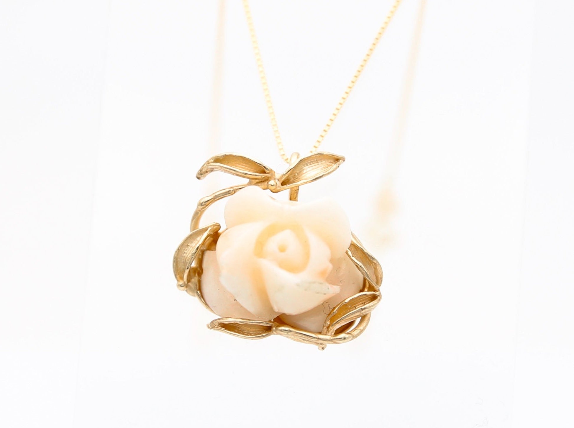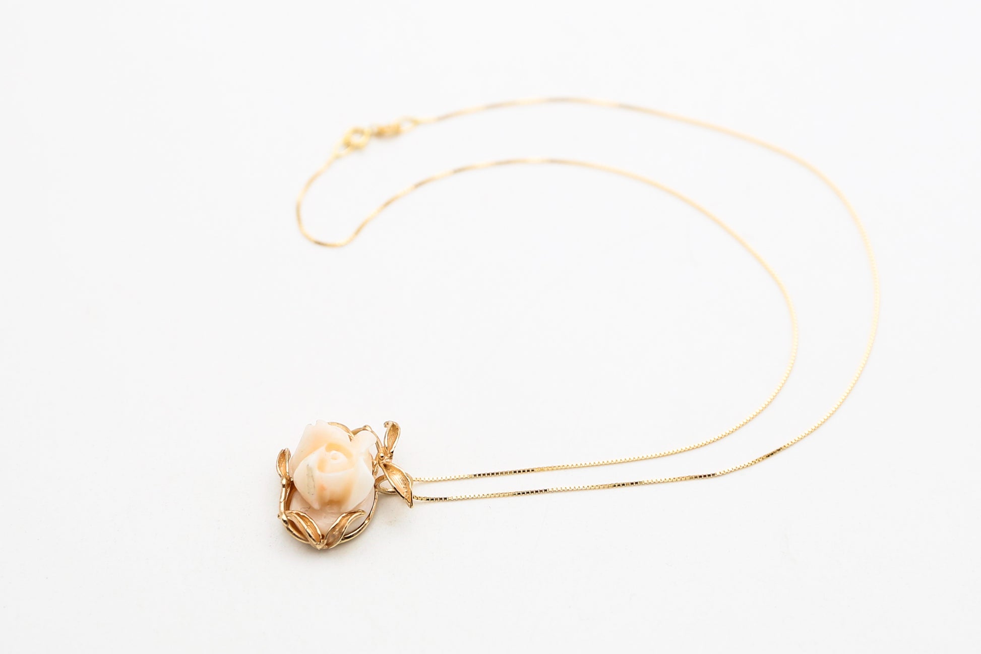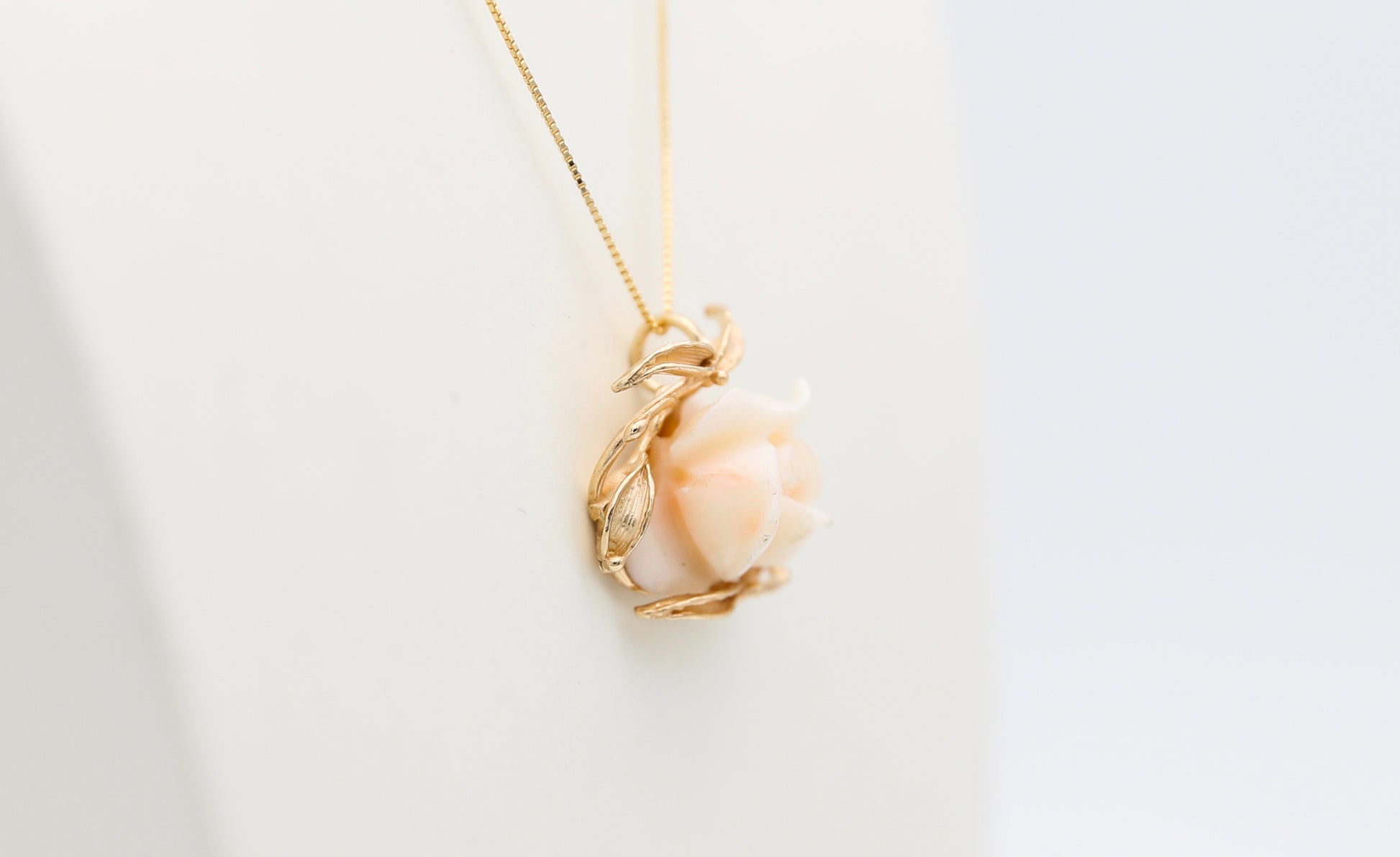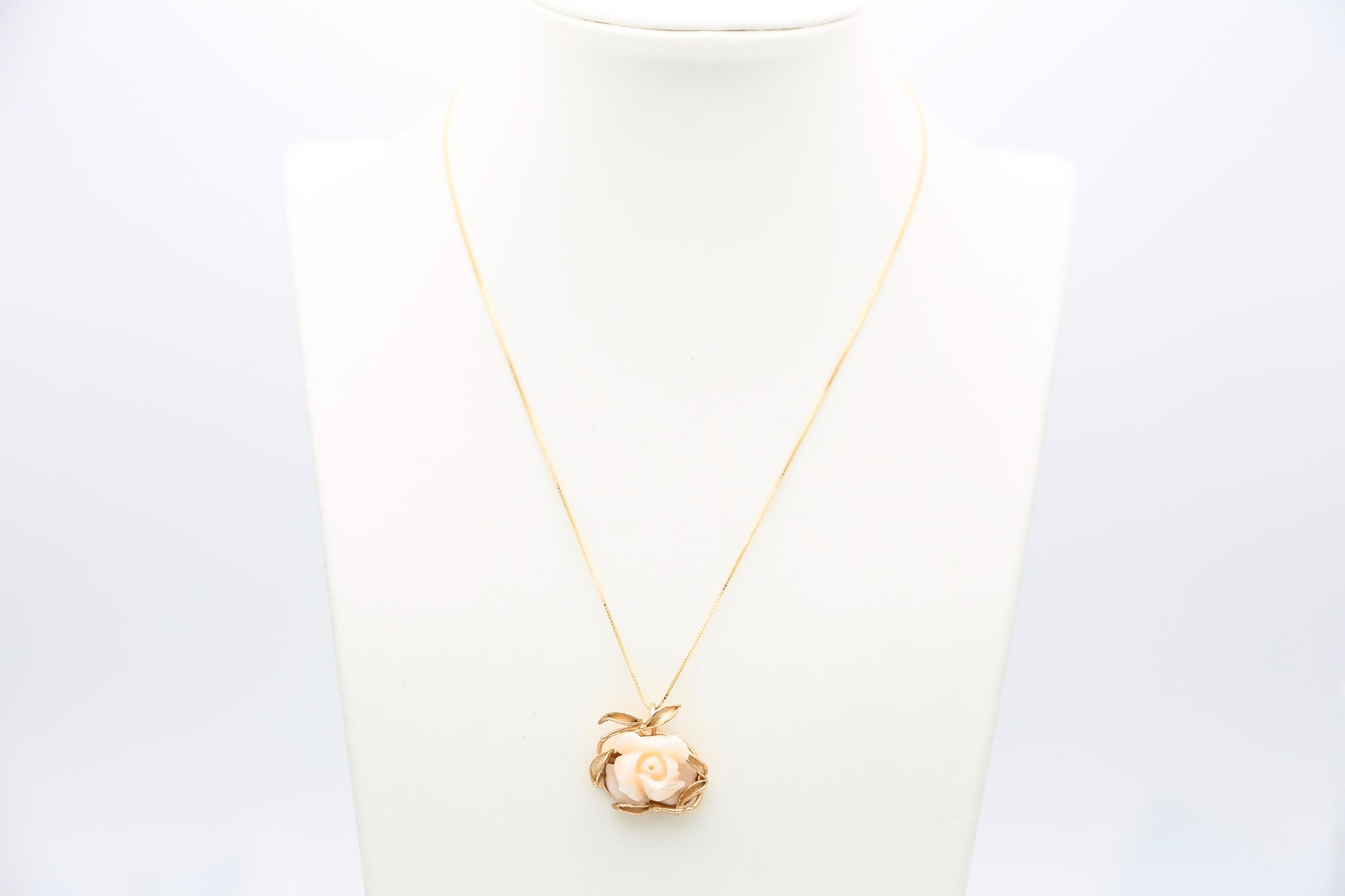 Catenina in oro a 18kt maglia veneziana passante nel ciondolo realizzato in oro a 14kt. Cera persa motivo floreale con una bellissima rosa di corallo incisa.