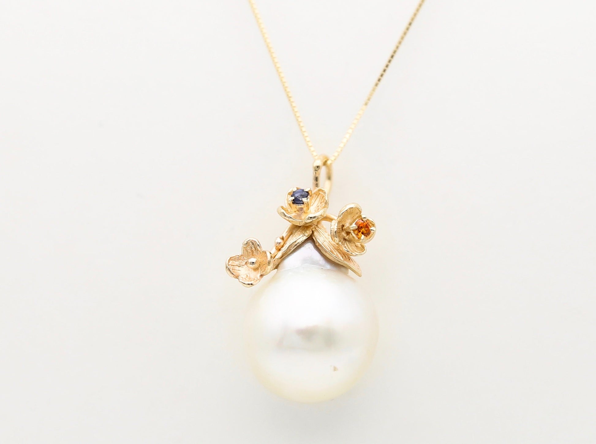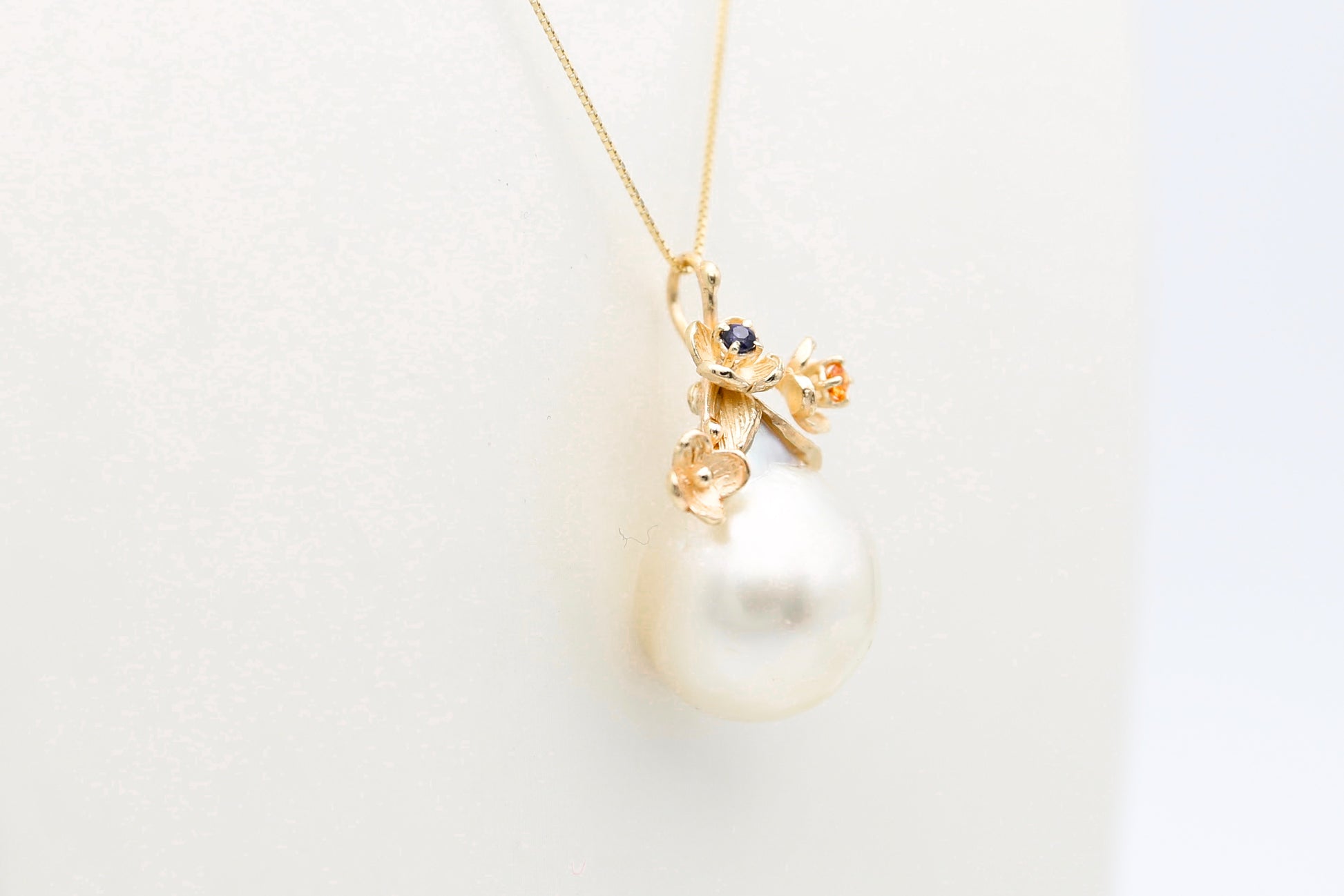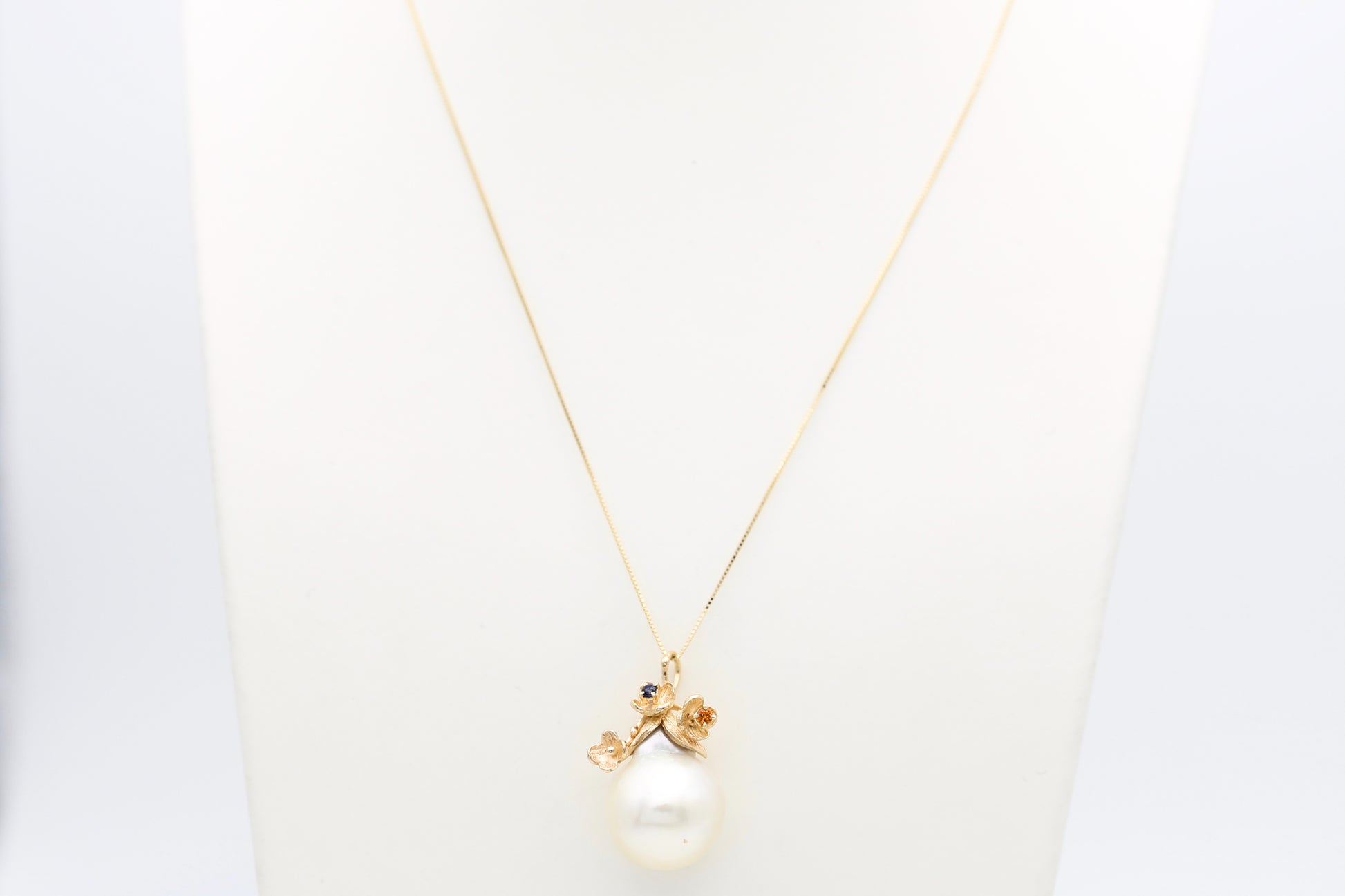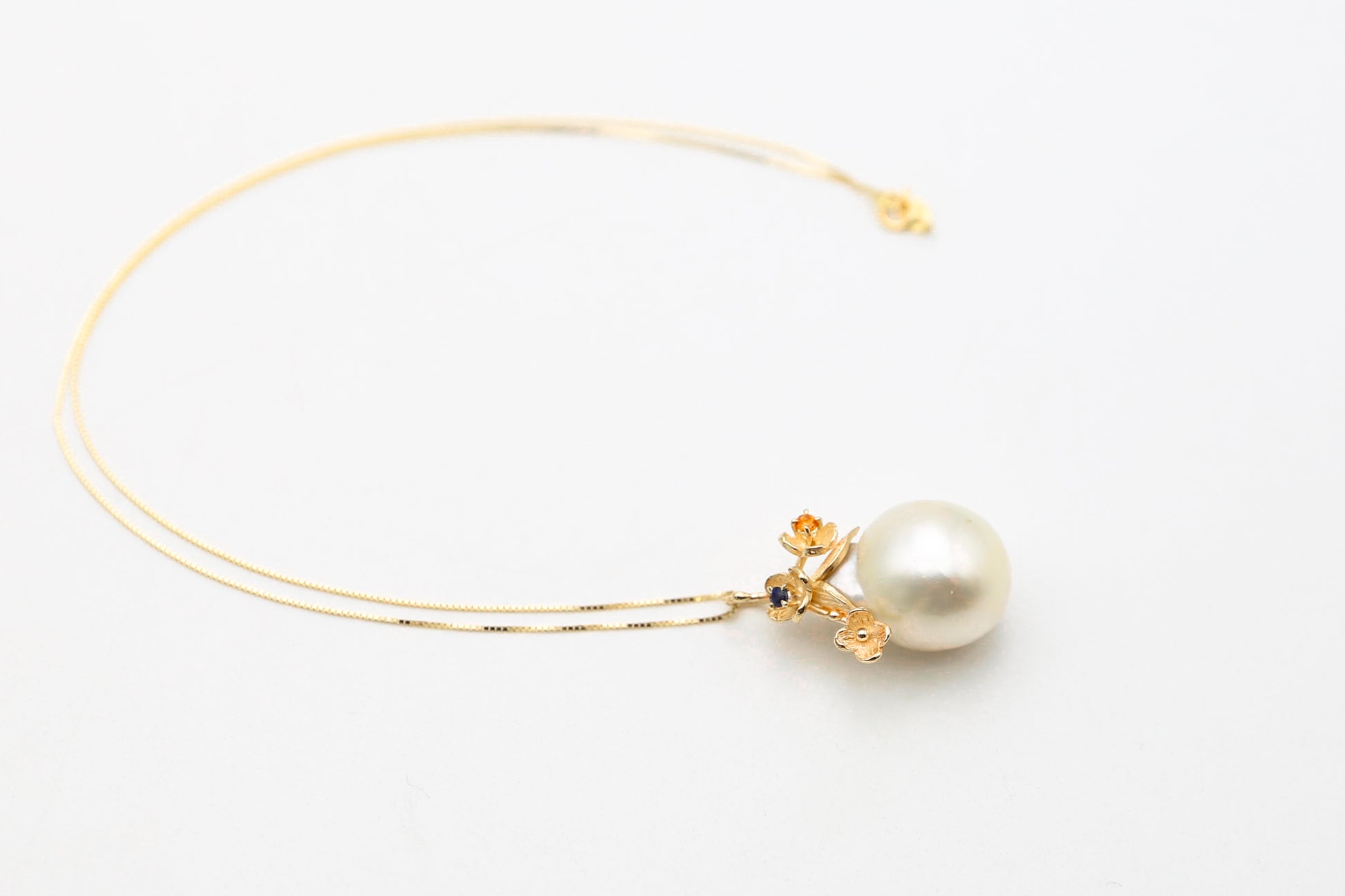 Catenina in oro giallo 18kt e 14kt maglia veneziana passante nel ciondolo realizzato a cera persa motivo floreale con perla australiana e zaffiri.