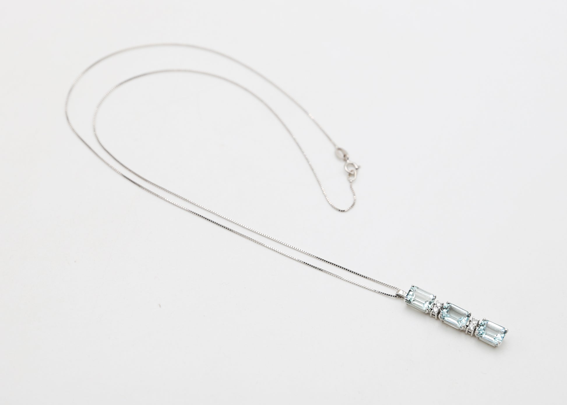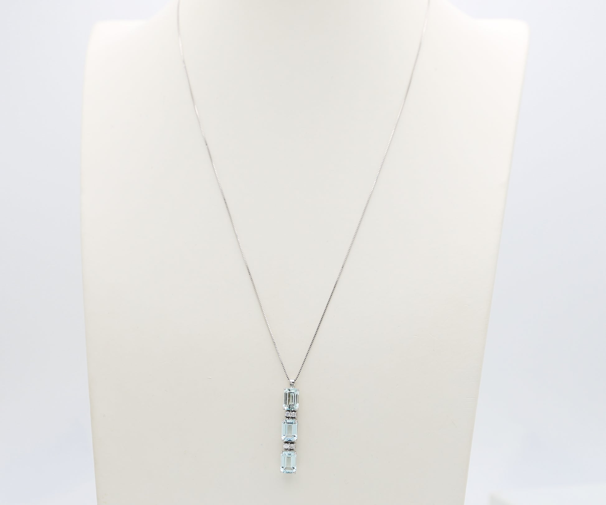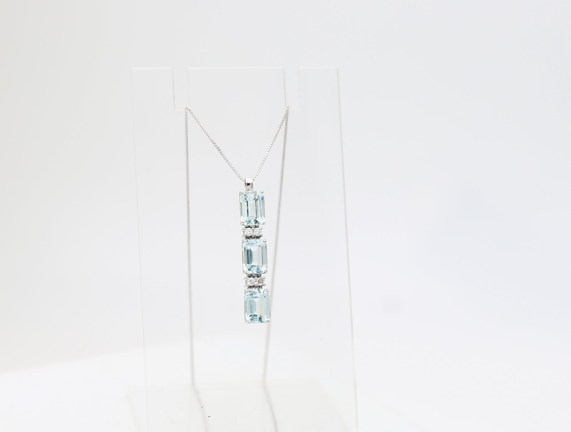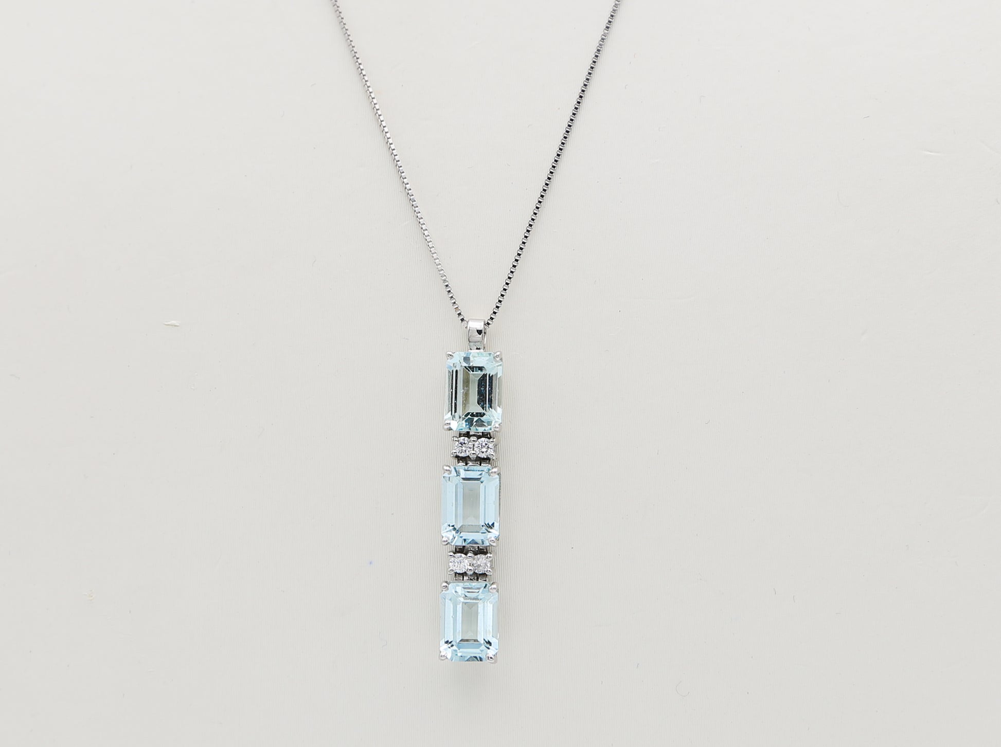 Raffinato pendente in oro bianco 18 kt con tre splendenti acquamarine taglio smeraldo di colore celeste intenso impreziosite da quattro diamanti naturali taglio brillante.