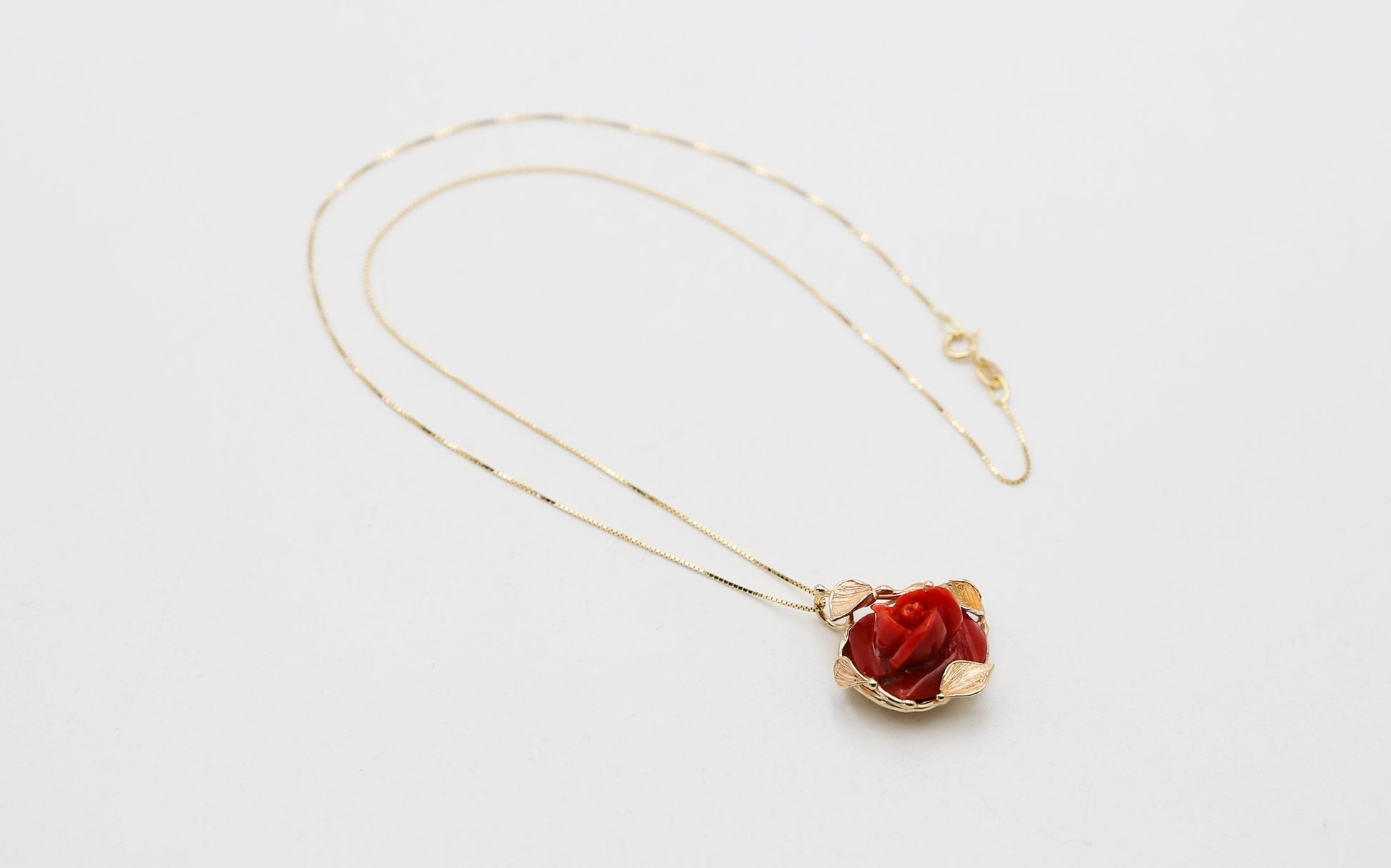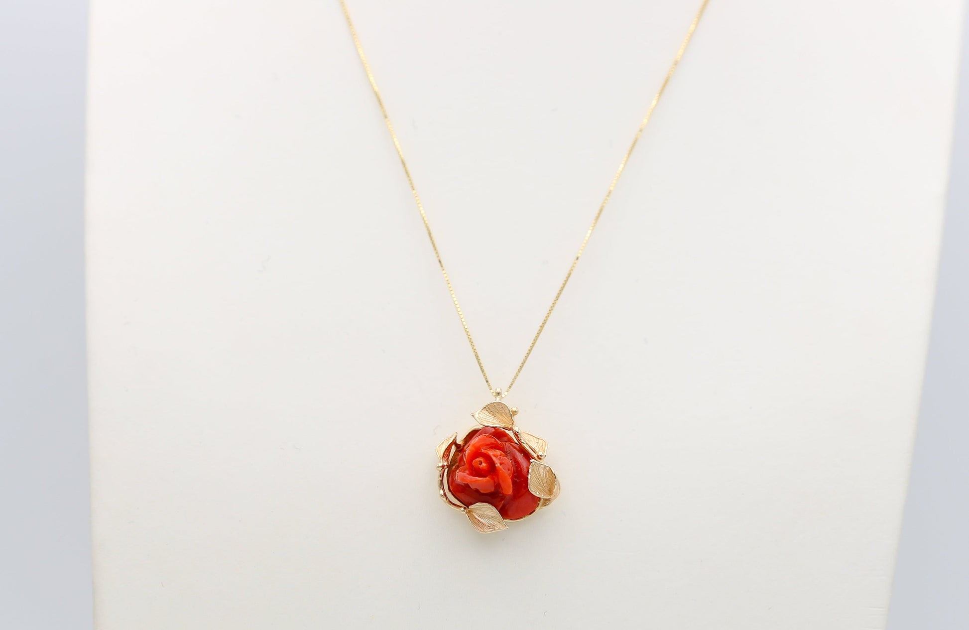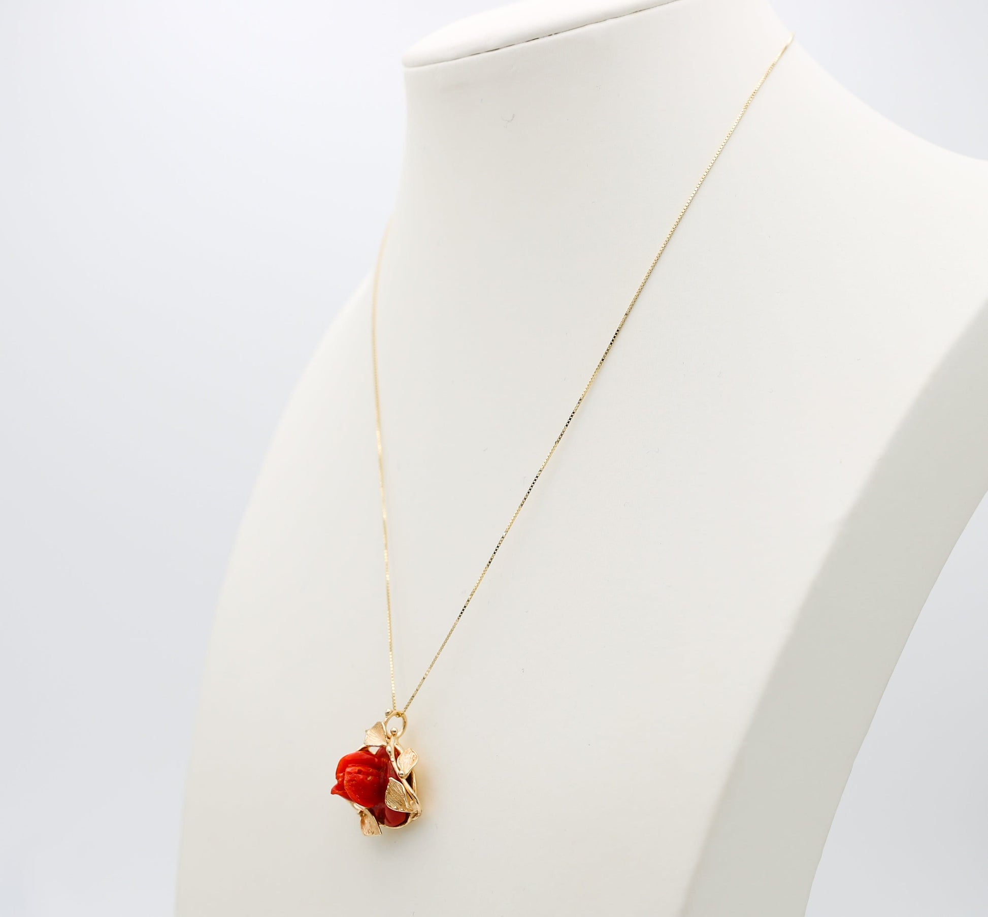 Ciondolo in oro giallo 18 kt con rosa di corallo rosso mediterraneo incisa a mano e incastonata su una splendida montatura a fiore in oro satinato per fare risaltare il notevole effetto tridimensionale dell'incisione.