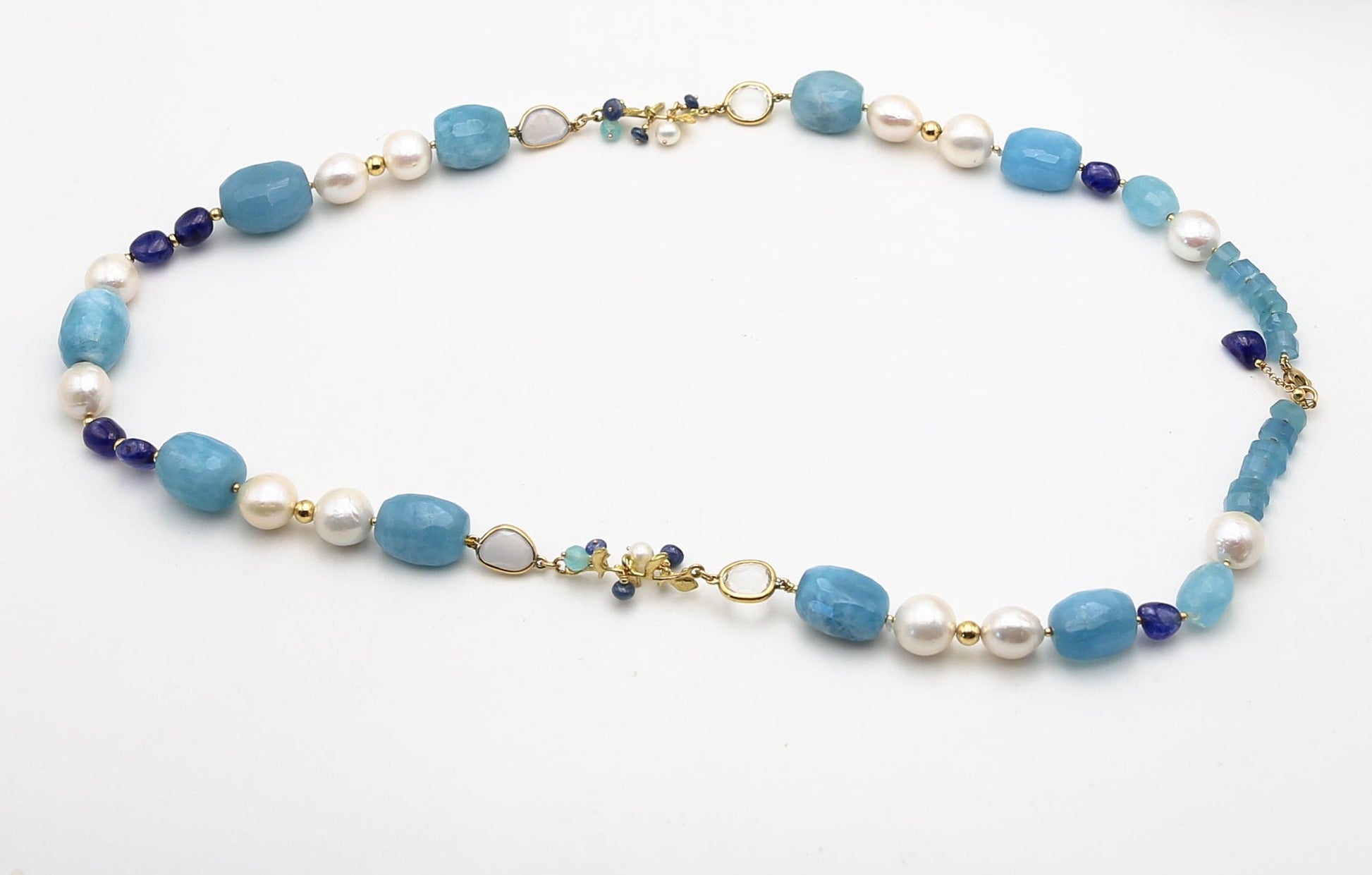 Collana in oro giallo 18 kt con design floreale, realizzato con tecnica a cera persa ed impreziosita da acquamarine a sasso, perle freshwater, zaffiri e calcedoni per un equilibrio perfetto di eleganza e colore.