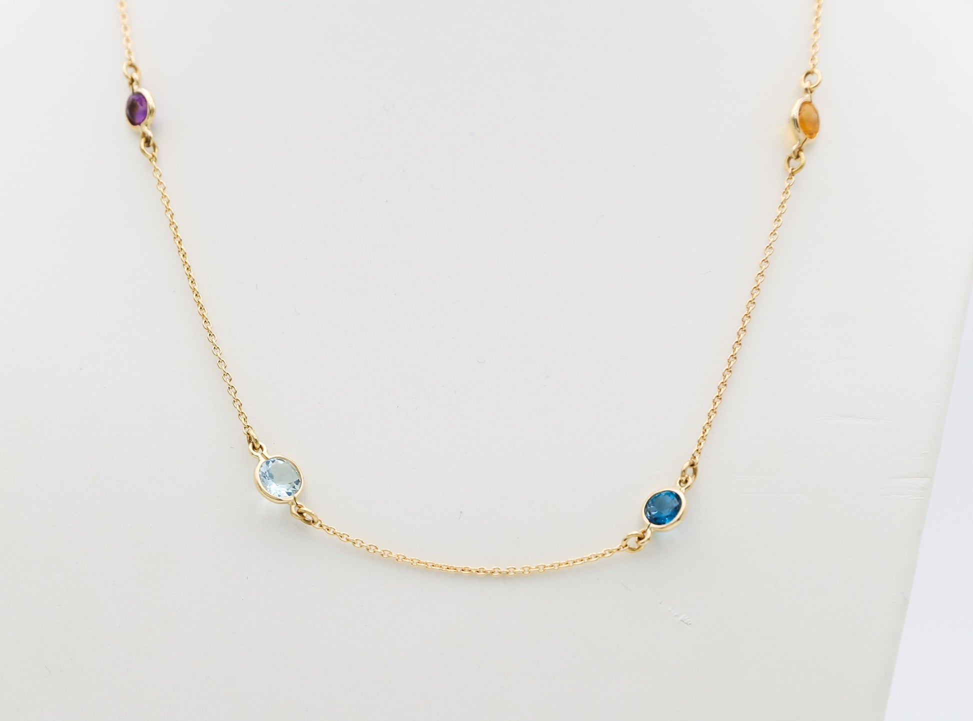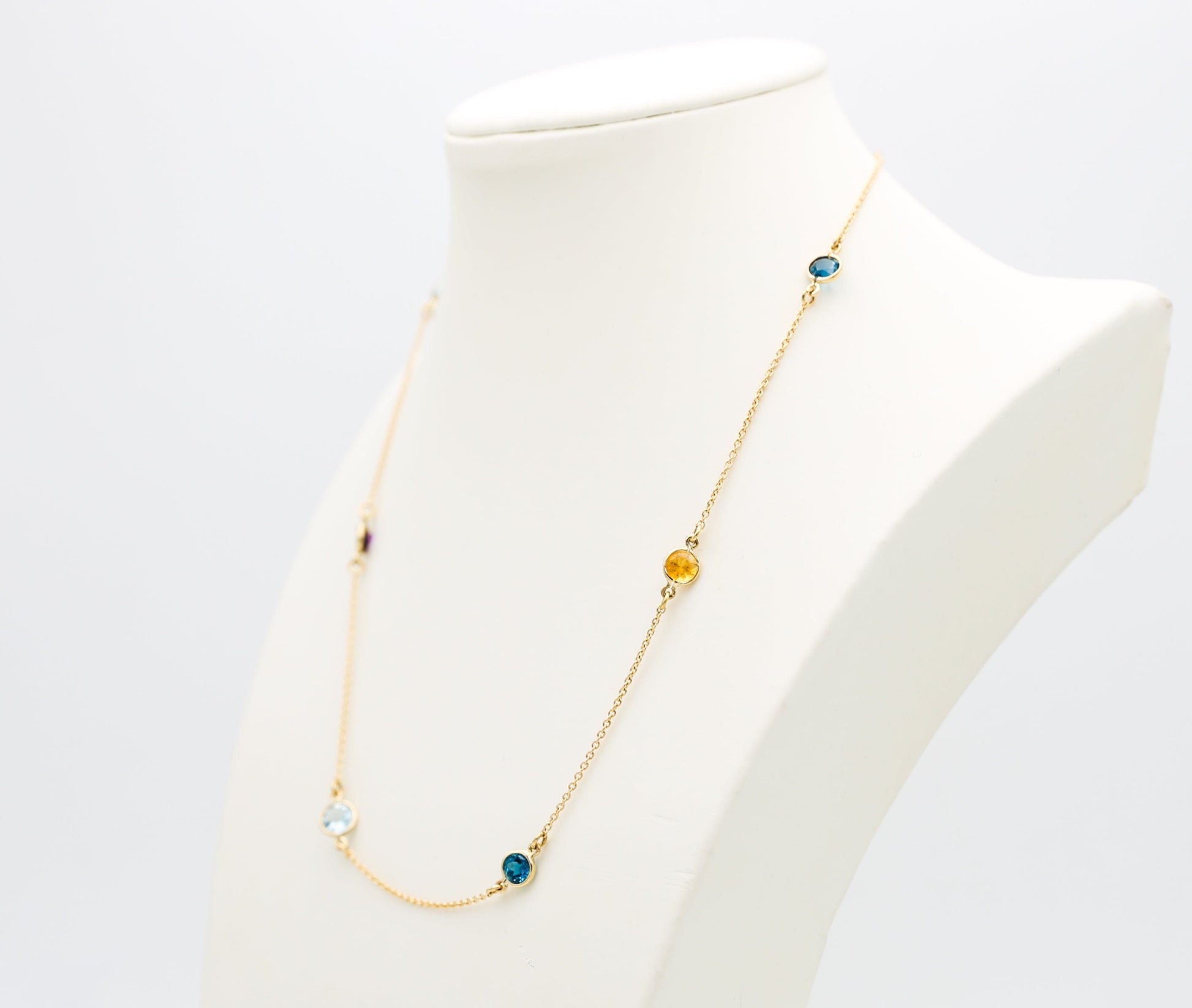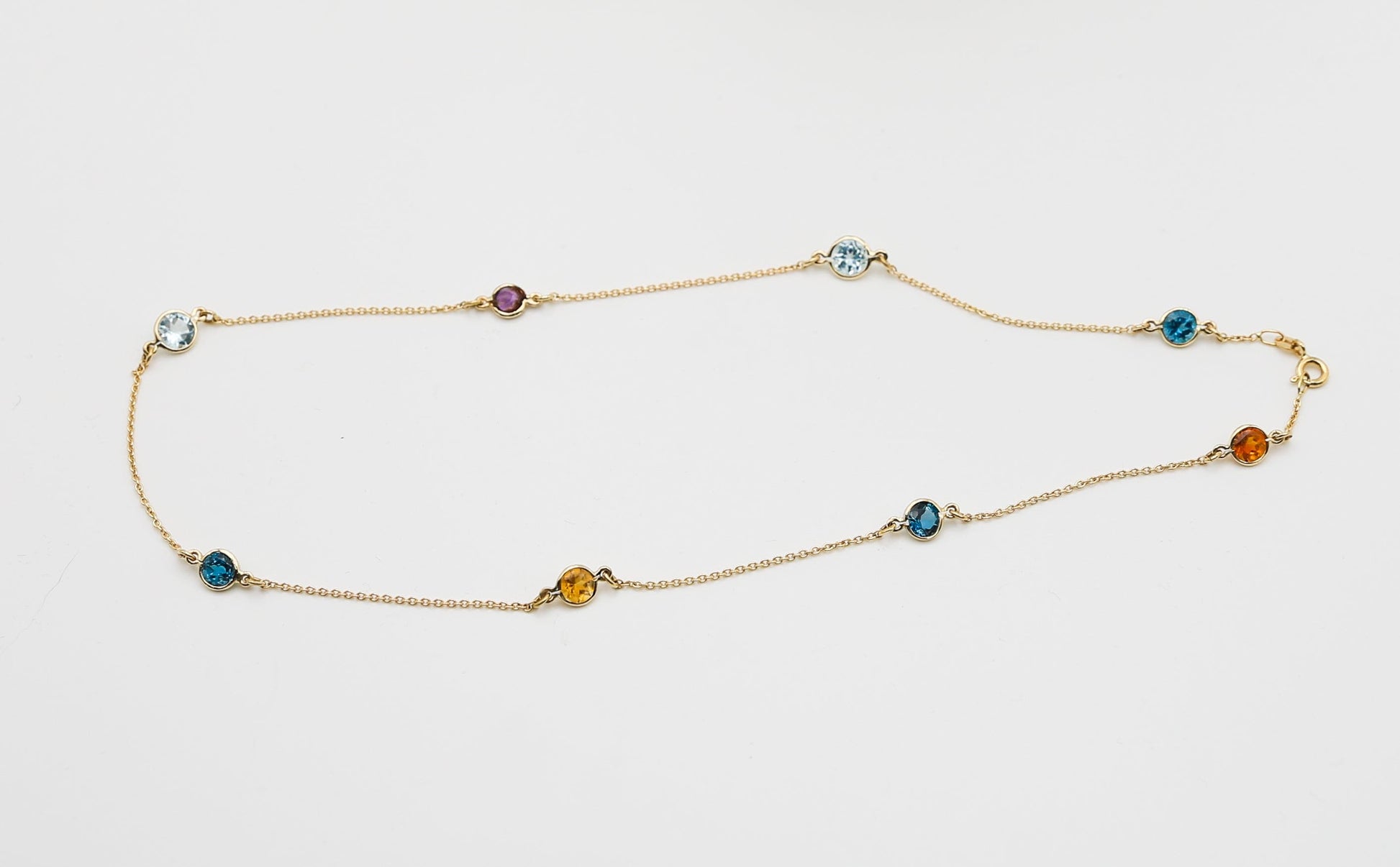 Girocollo in oro giallo 18 kt con castoni che racchiudono tre topazi, due acquamarine, due citrini e un’ametista.