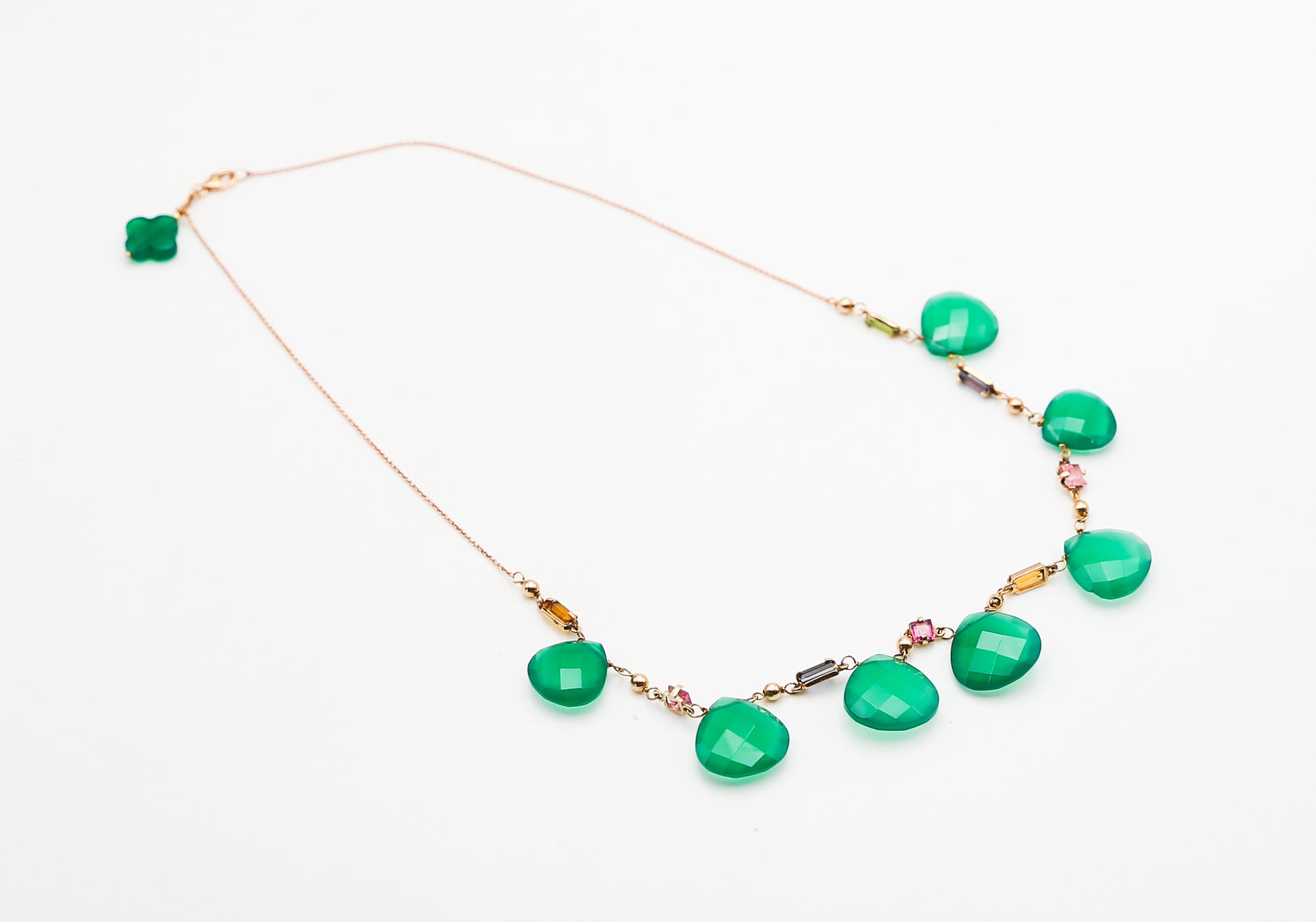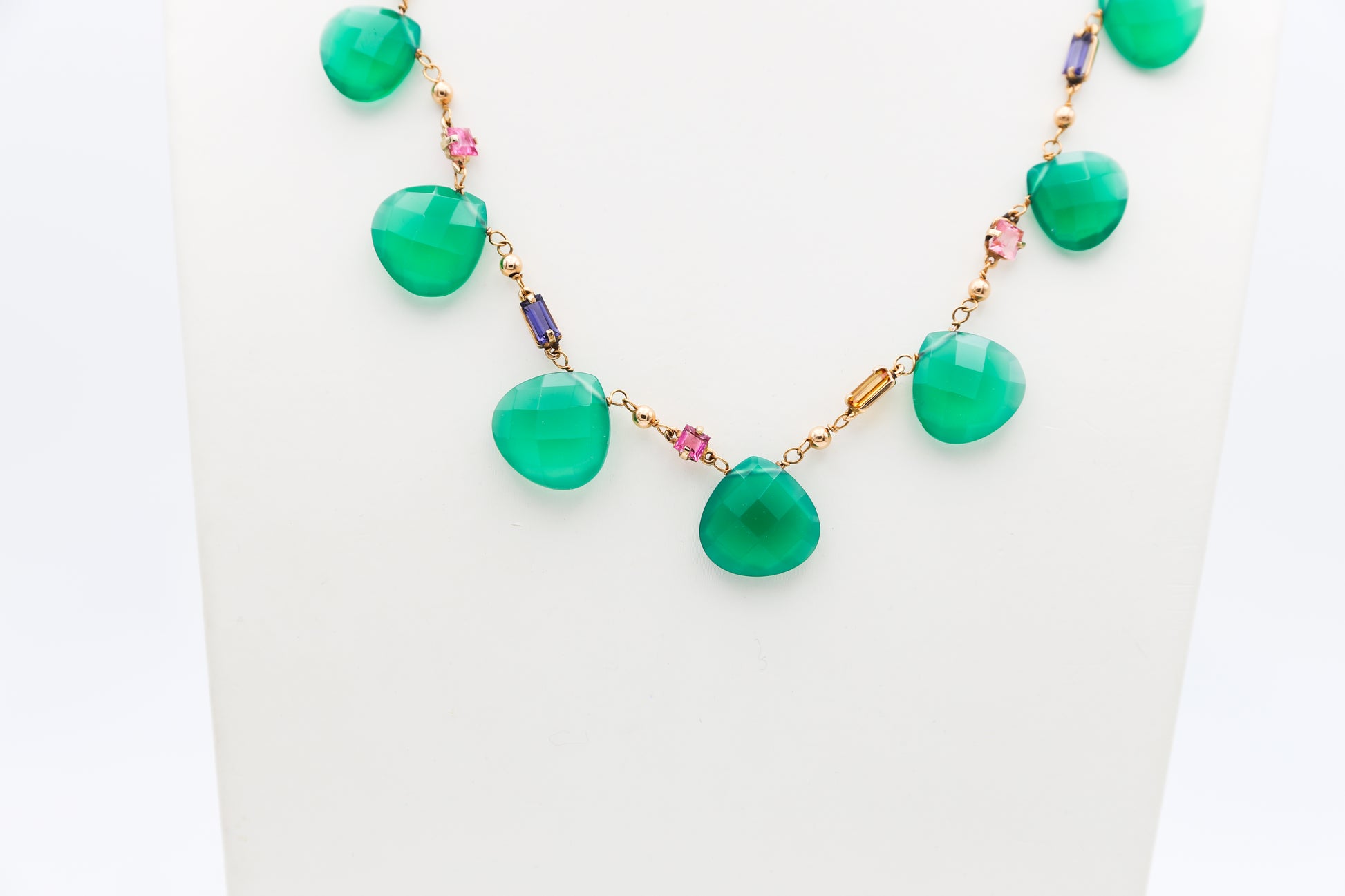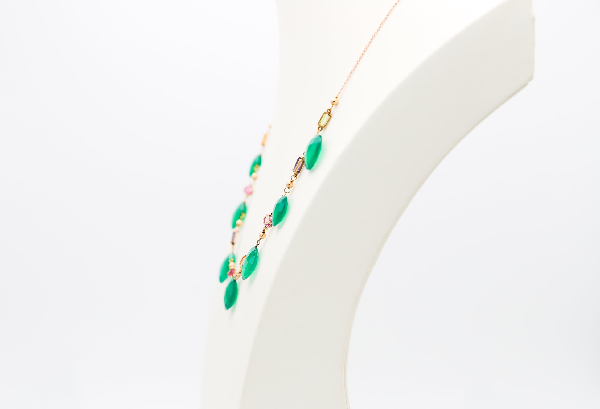 Collana in oro rosa 18 kt, elegante e raffinata con sette gocce di giada alternate da tormaline, citrini, ioliti e peridoti.