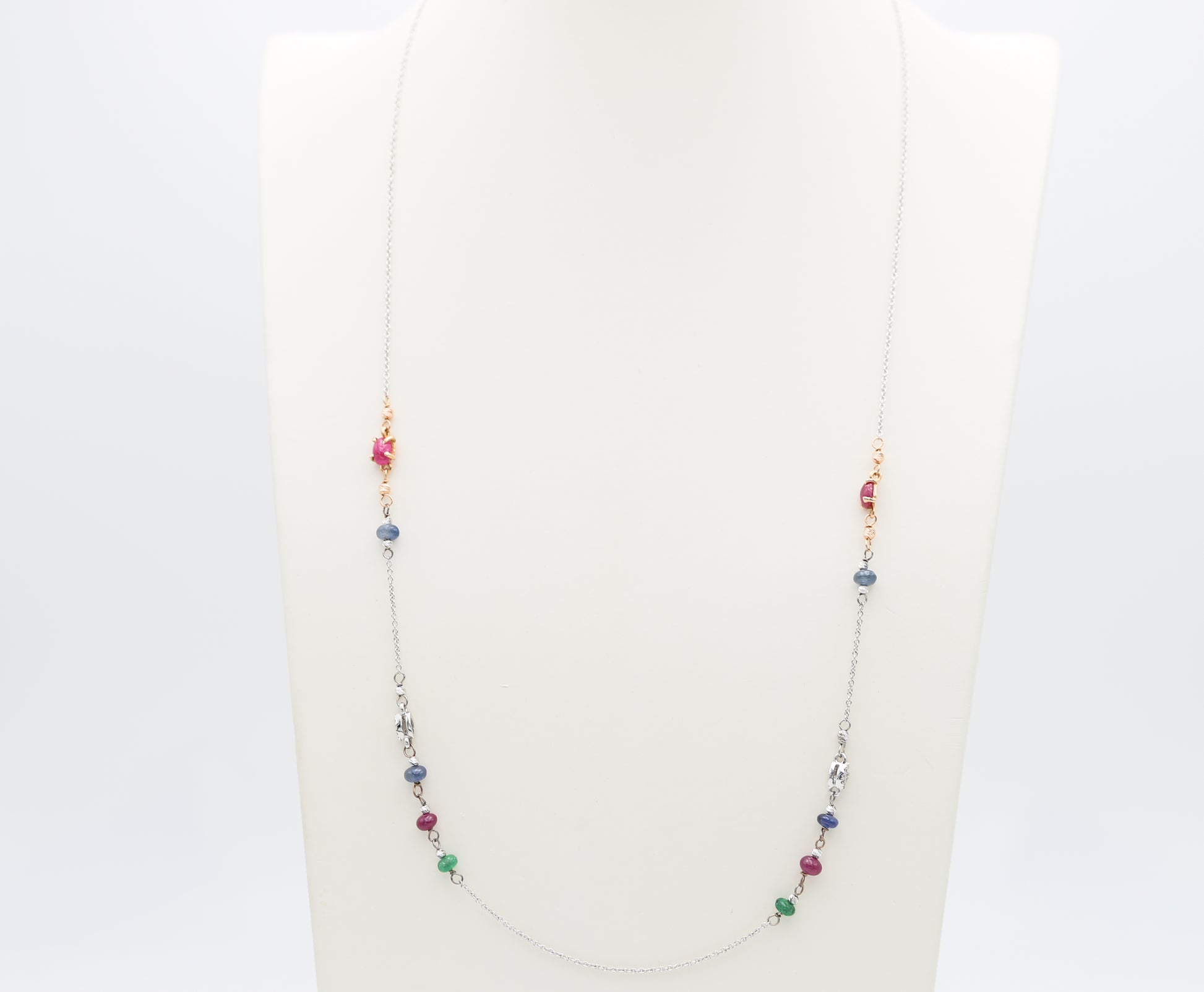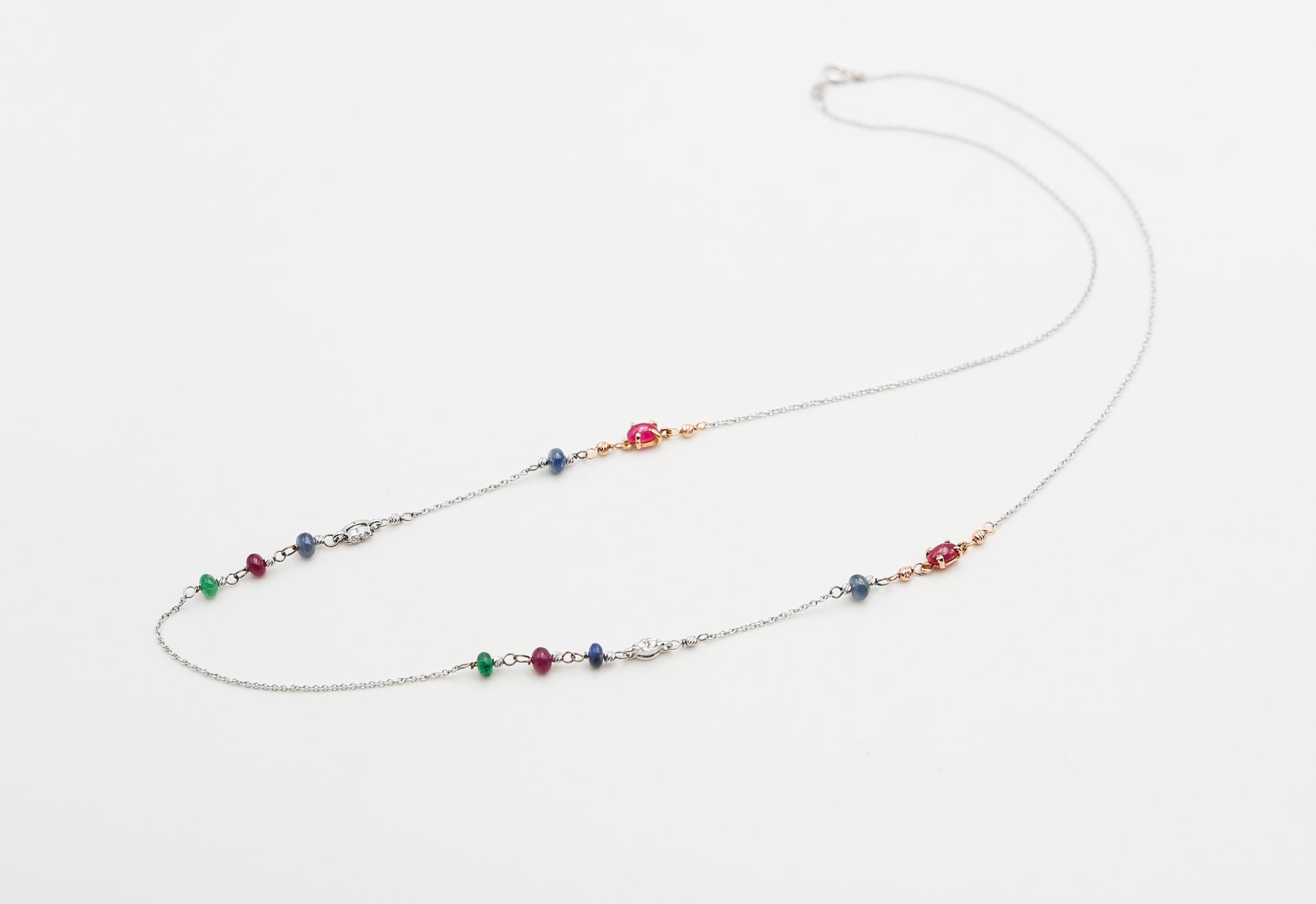 Collana in oro bianco 18 kt con rubini, zaffiri e smeraldi.