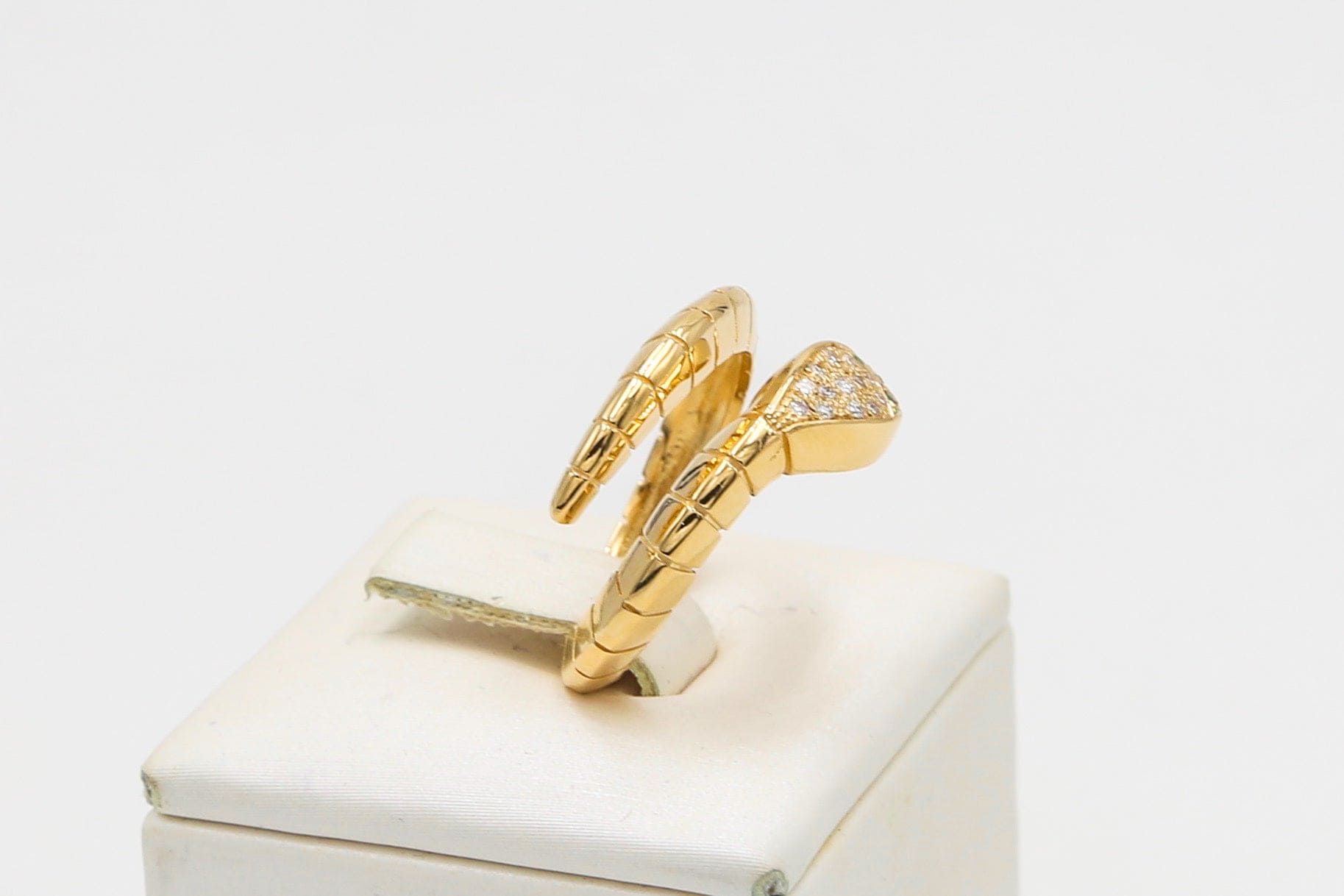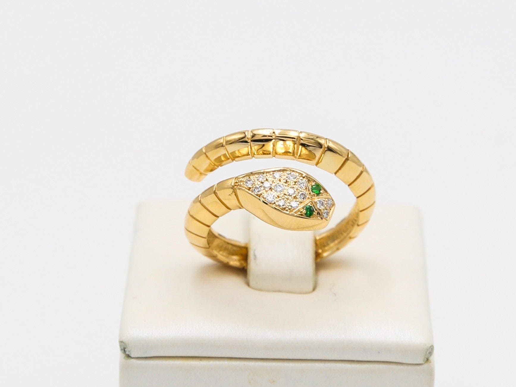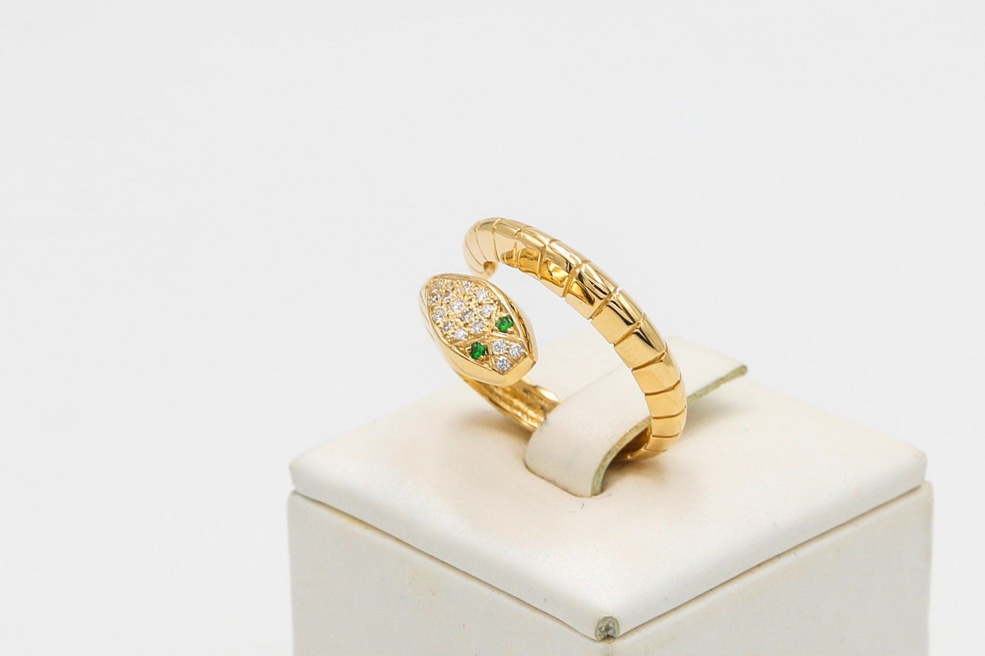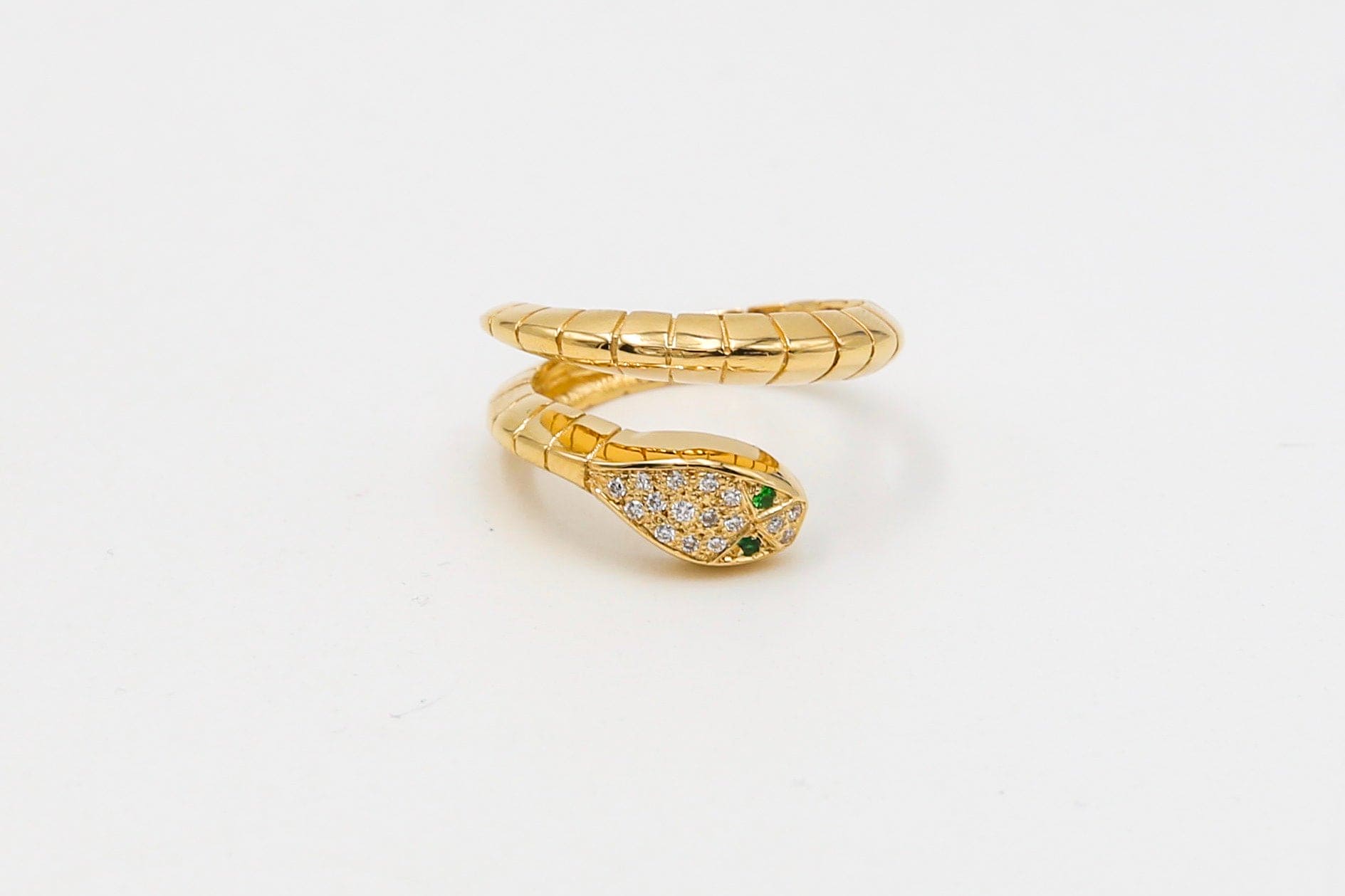 Anello a forma di serpente realizzato in oro giallo 18 carati con diamanti naturali taglio brillante e tsavoriti incastonati sulla testa