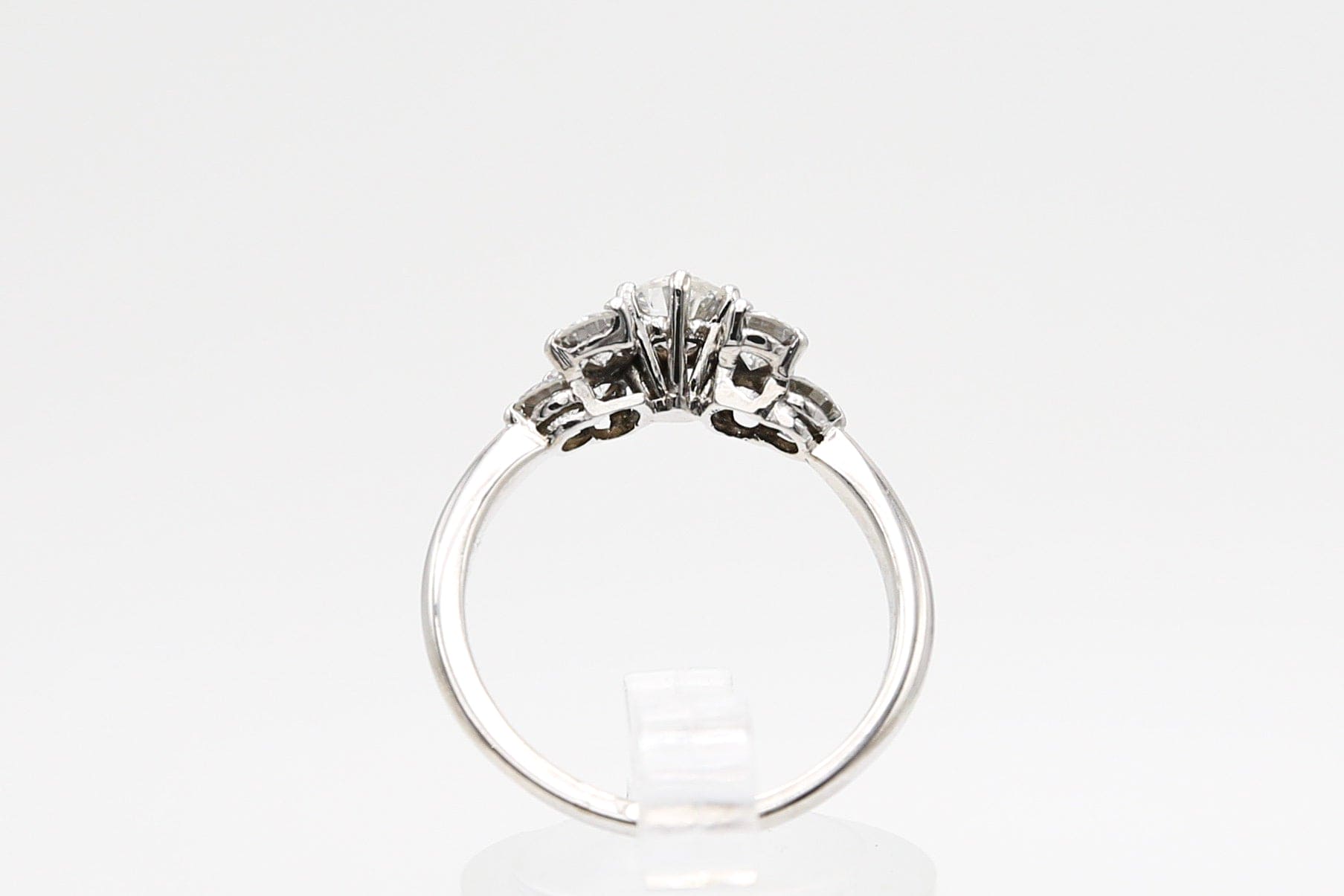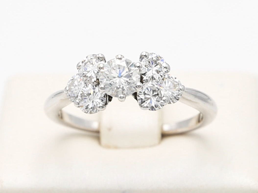 Prezioso anello in oro bianco 18kt con diamante centrale e 6 diamanti laterali posti a triangolo a forma di fiore.