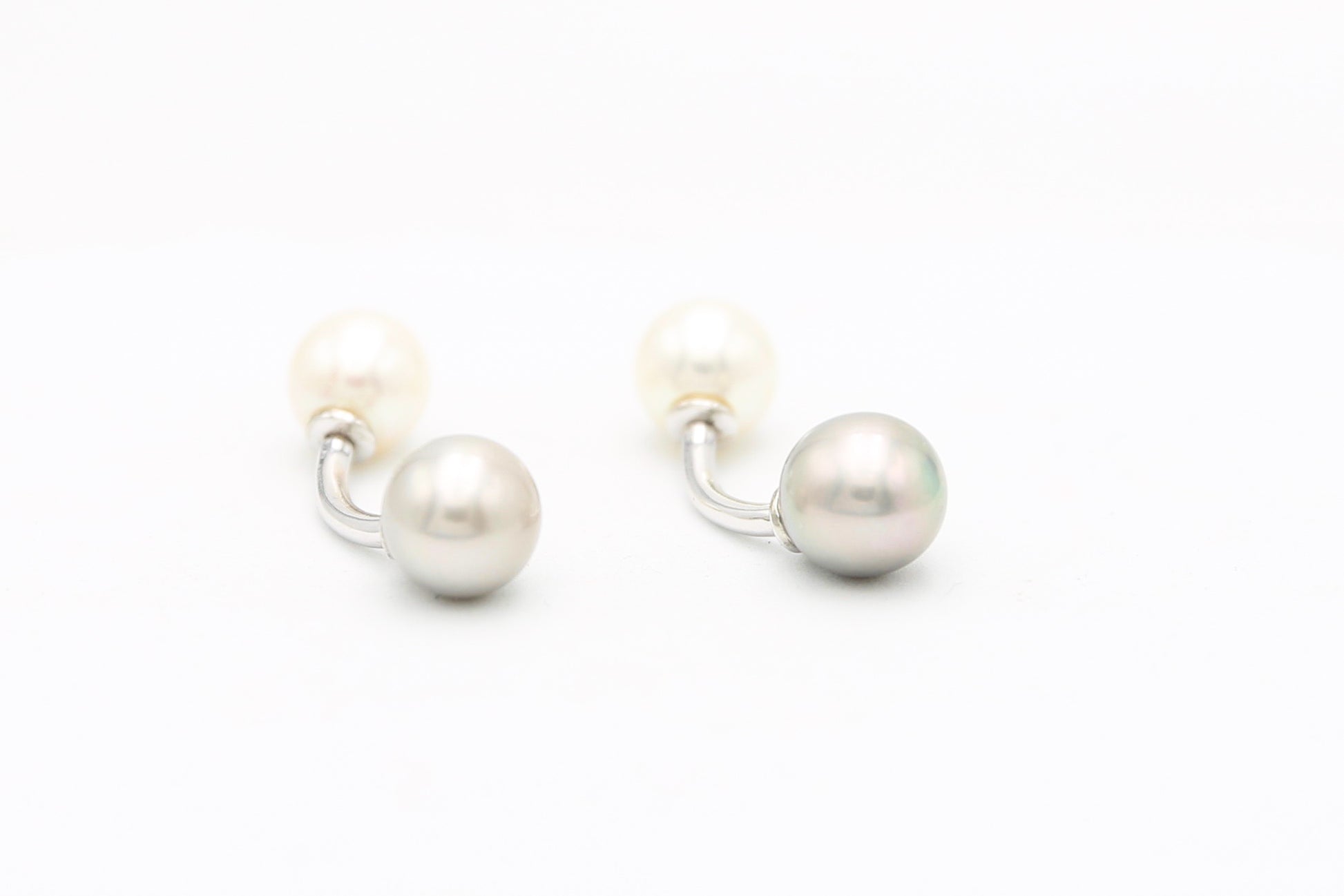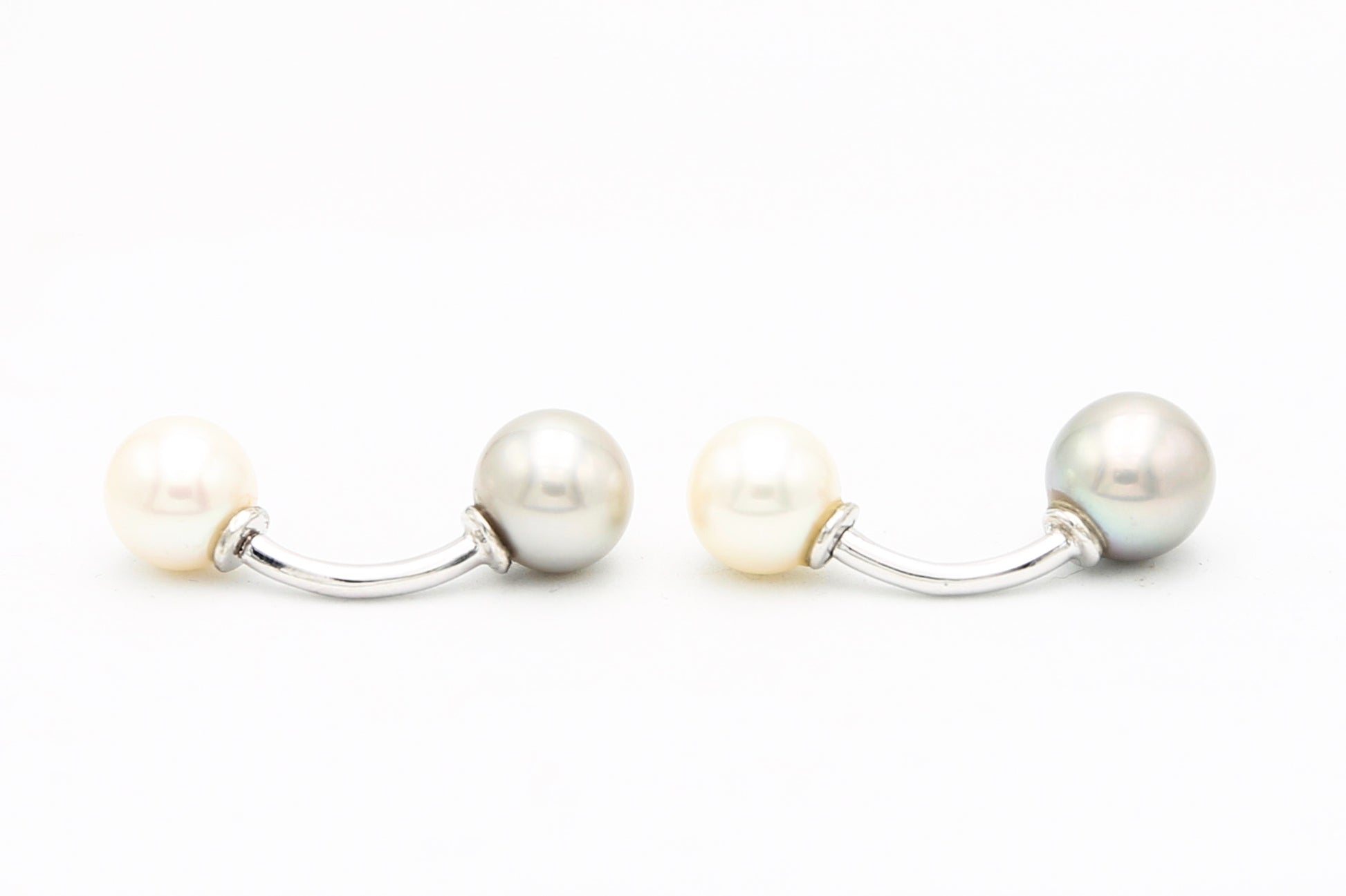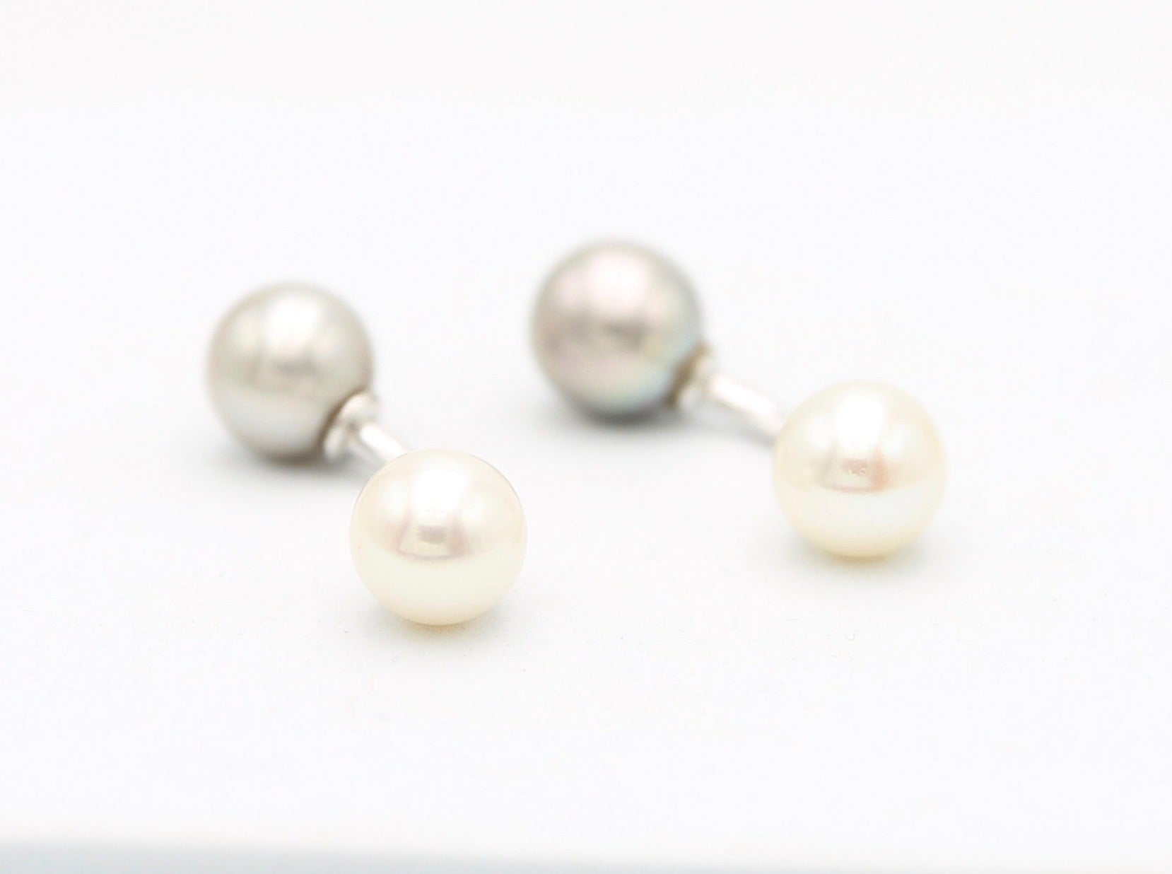 Coppia di gemelli unisex realizzati in oro bianco 18 carati con due perle da 9,0 millimetri di coltura freshwater di colore grigio e bianco con ottima lucentezza e uniformità.
