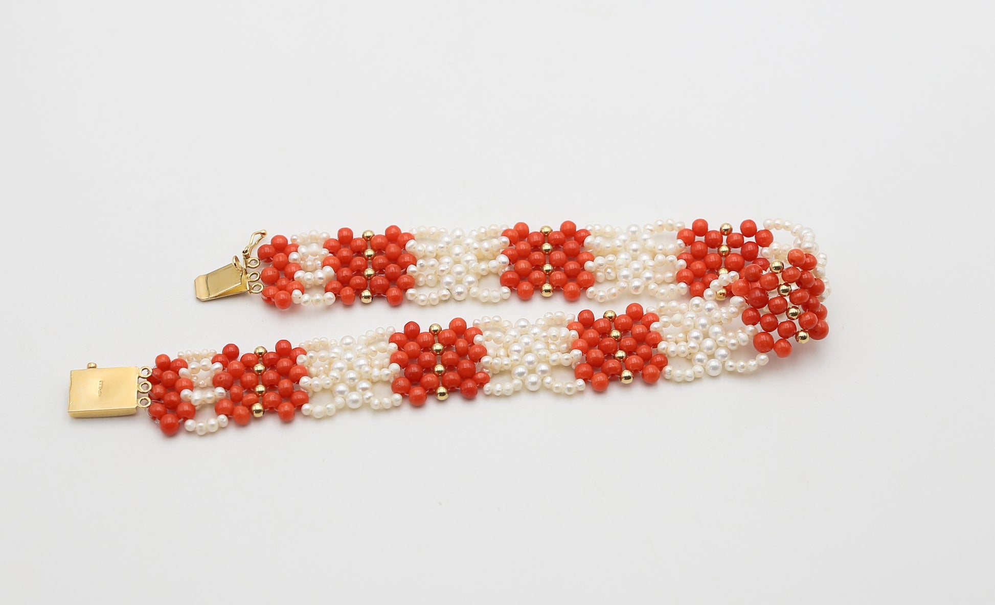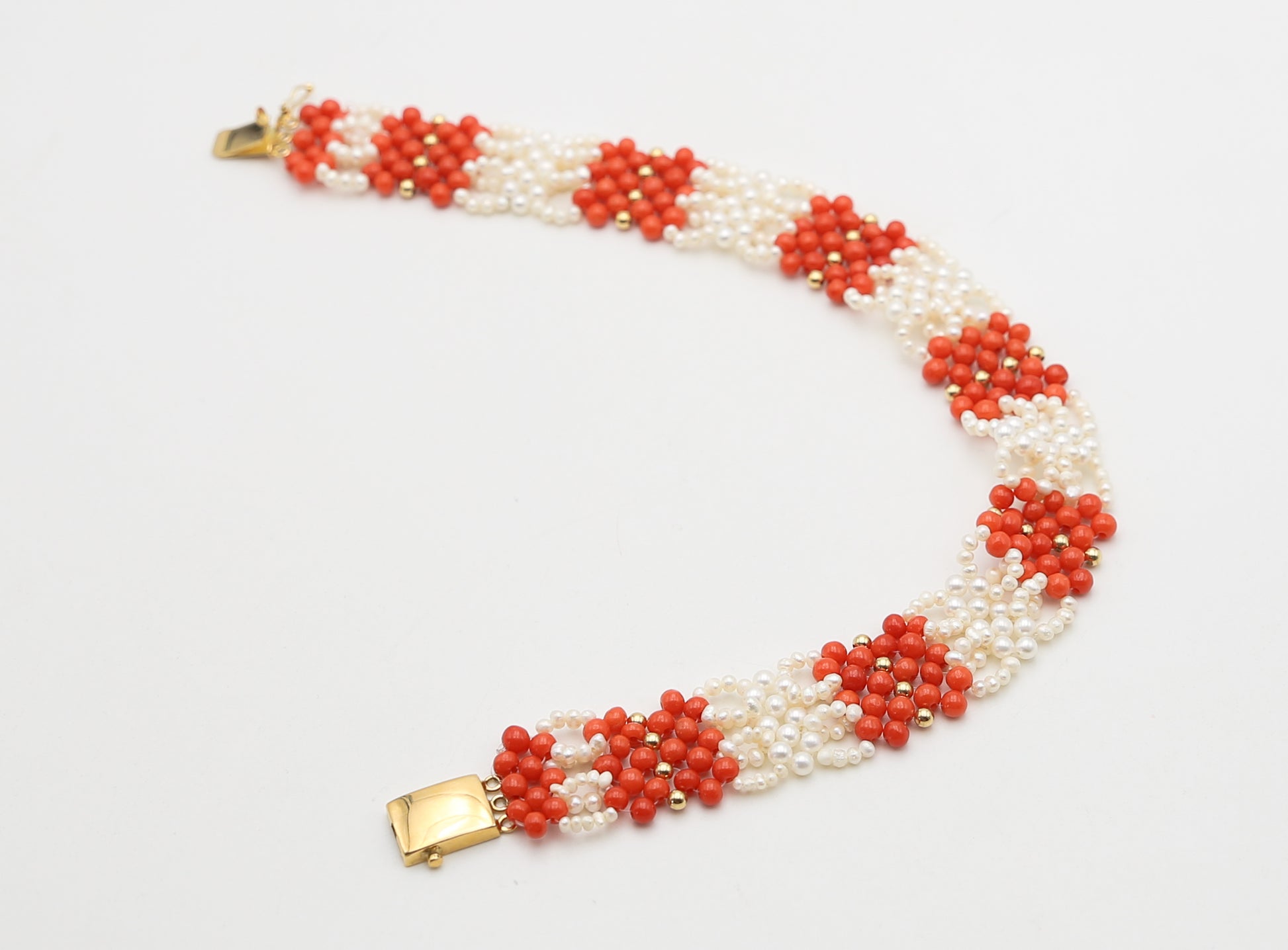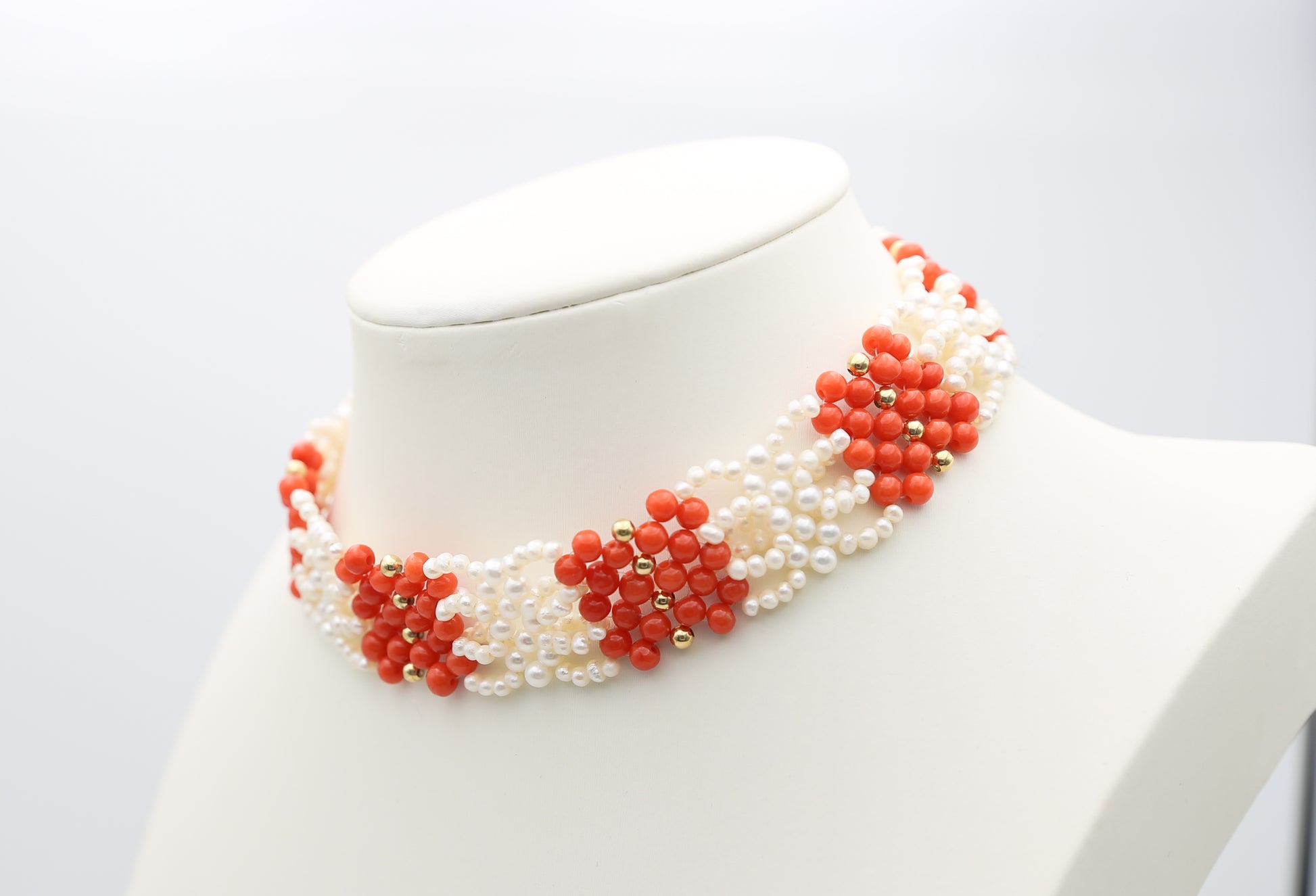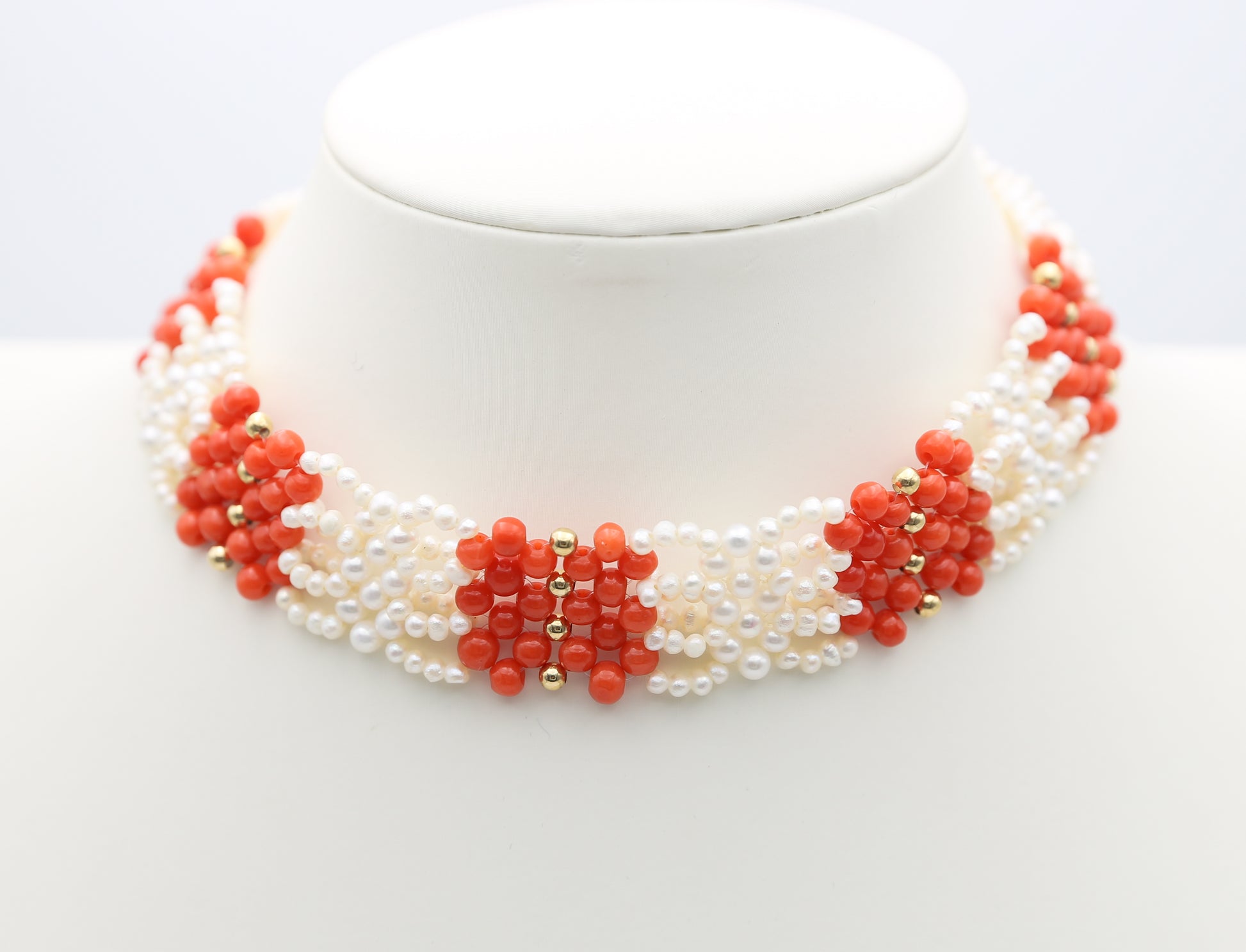 Choker con perline coltivate corallo rosso del mediterraneo montato con sfere e chiusura in oro giallo 18 kt.