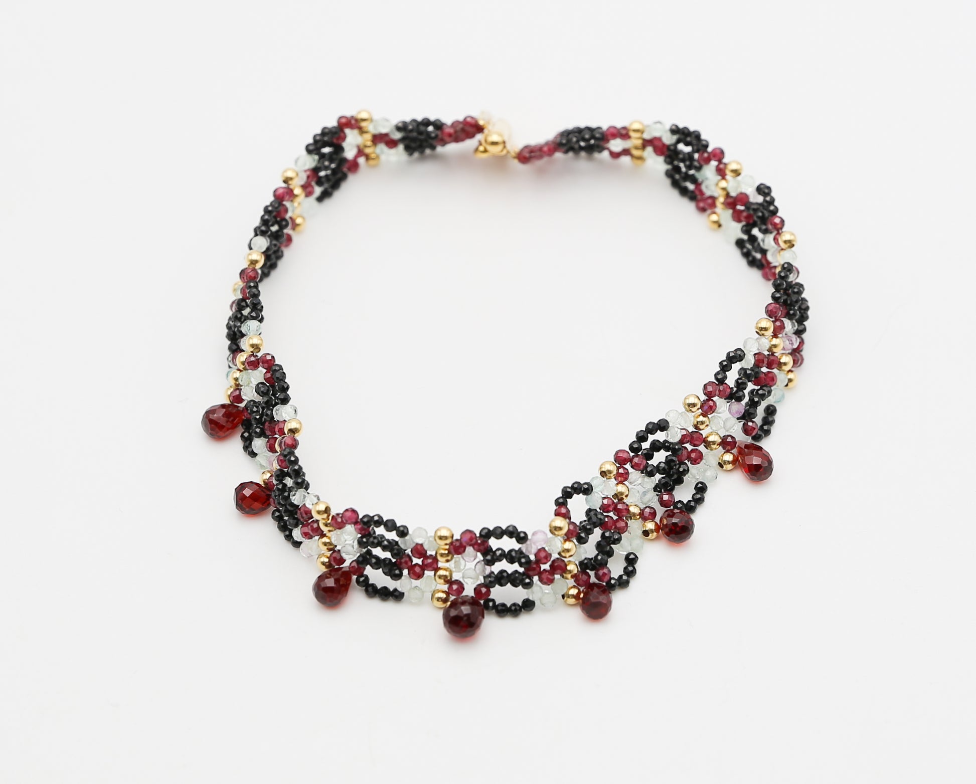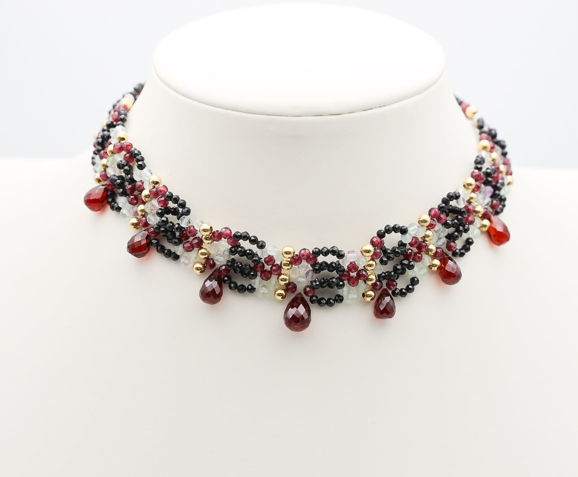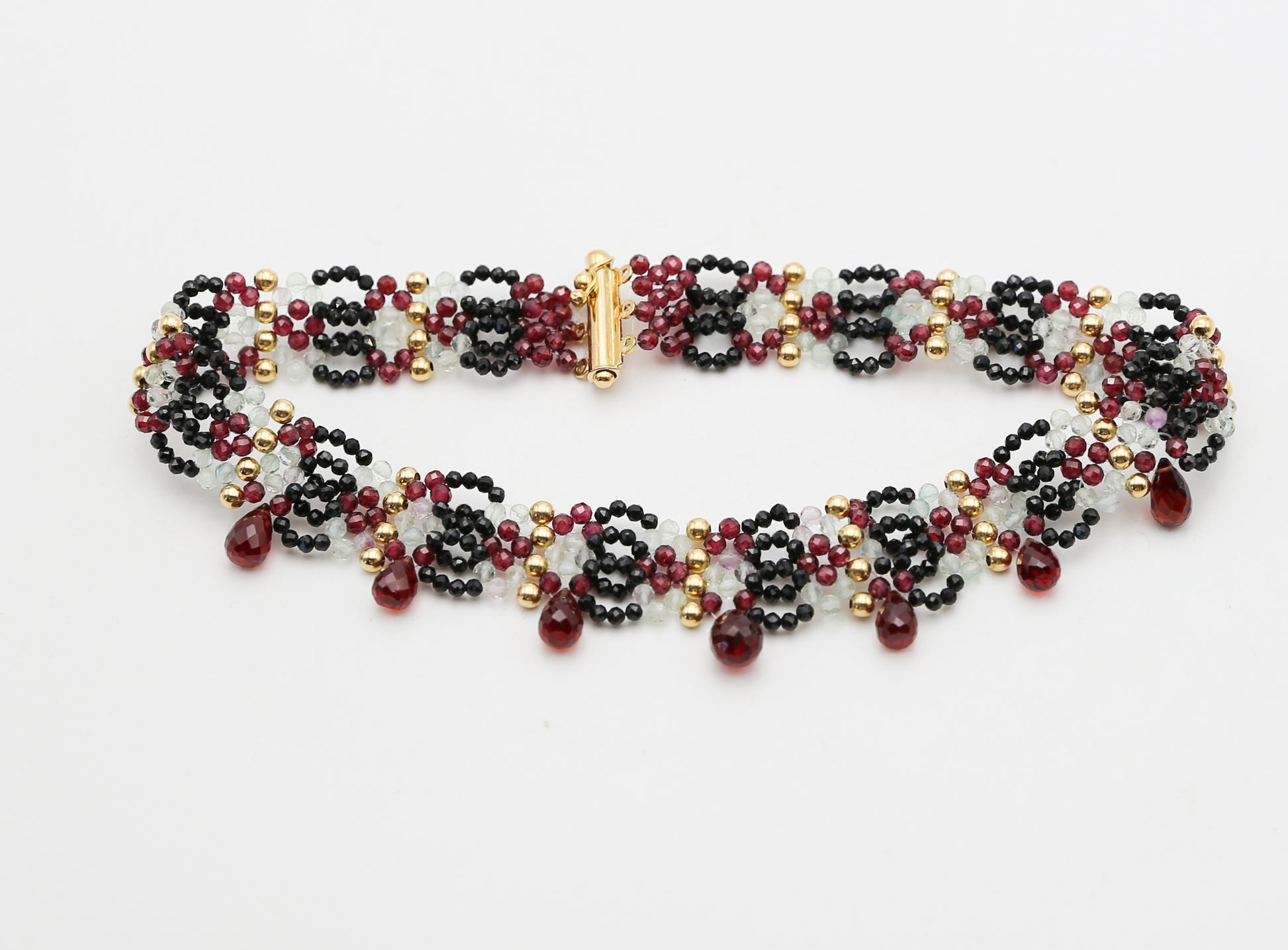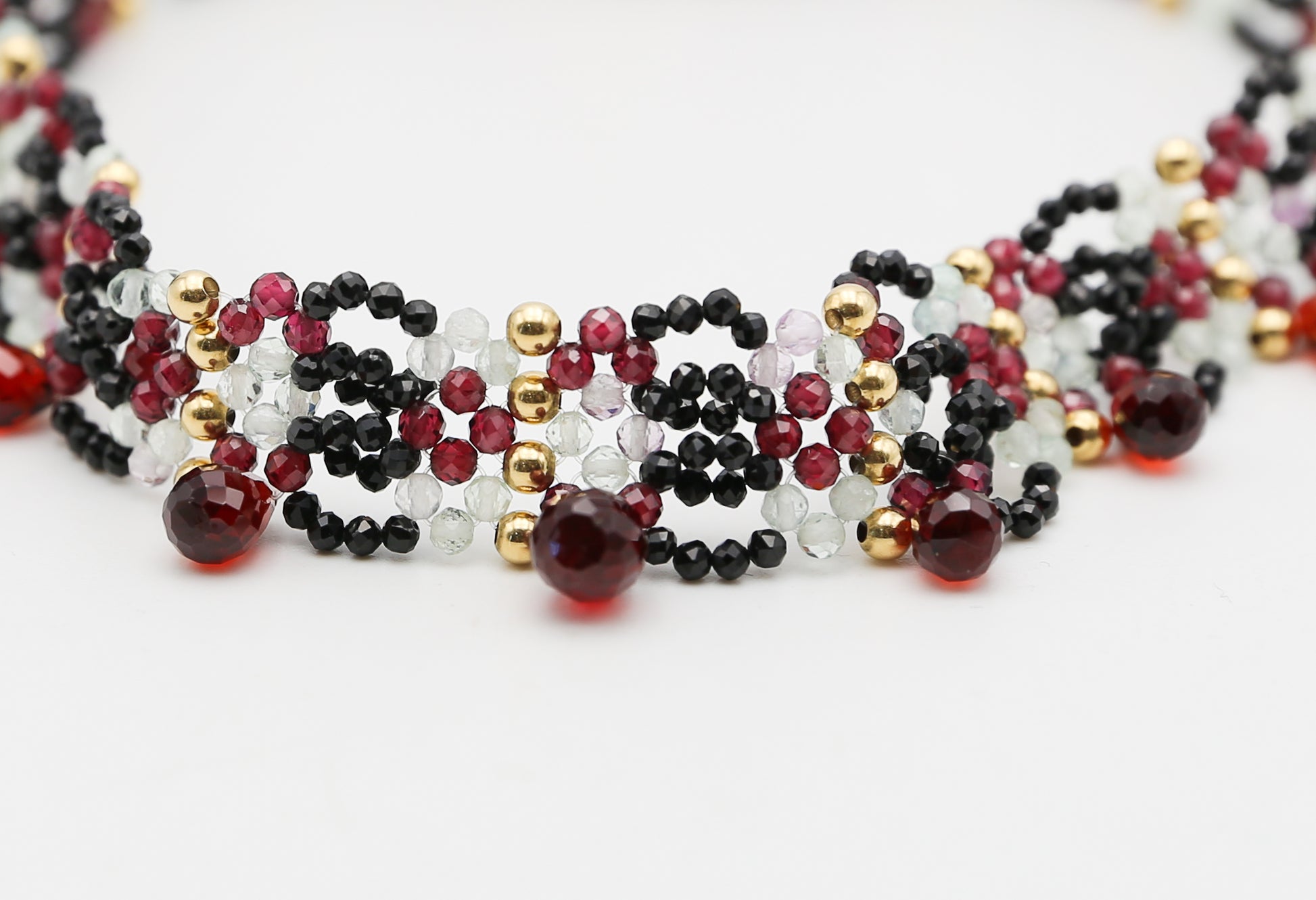Collana choker in oro giallo 18 kt con sfere d'oro e gocce di granato pendenti intersecata con granati e onici. Presenta una chiusura in oro con sistema di sicurezza. Perfetta per un tocco di eleganza raffinata.