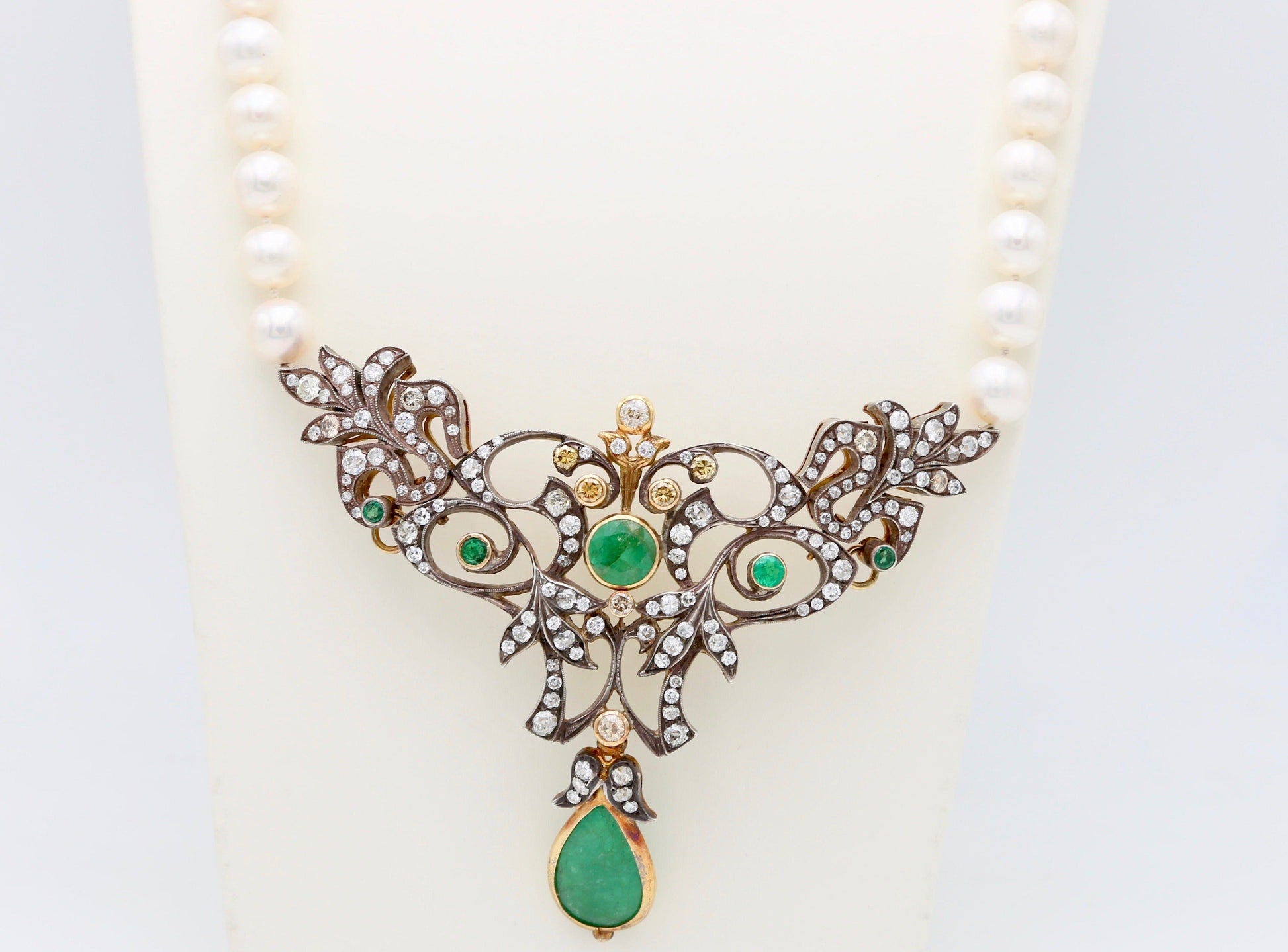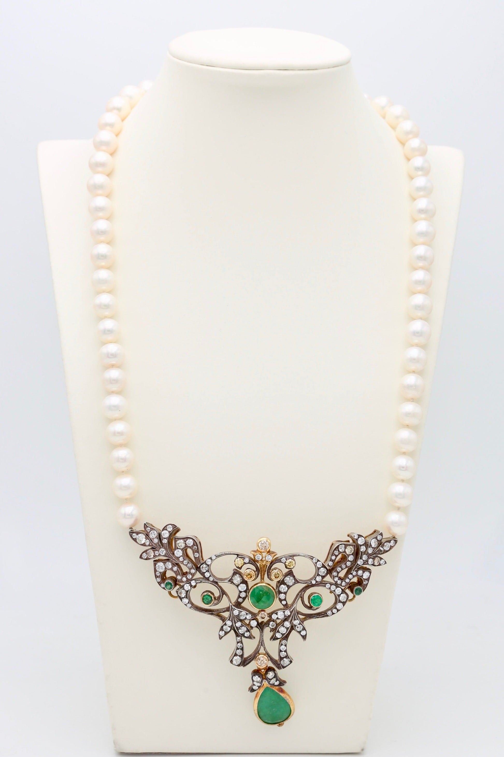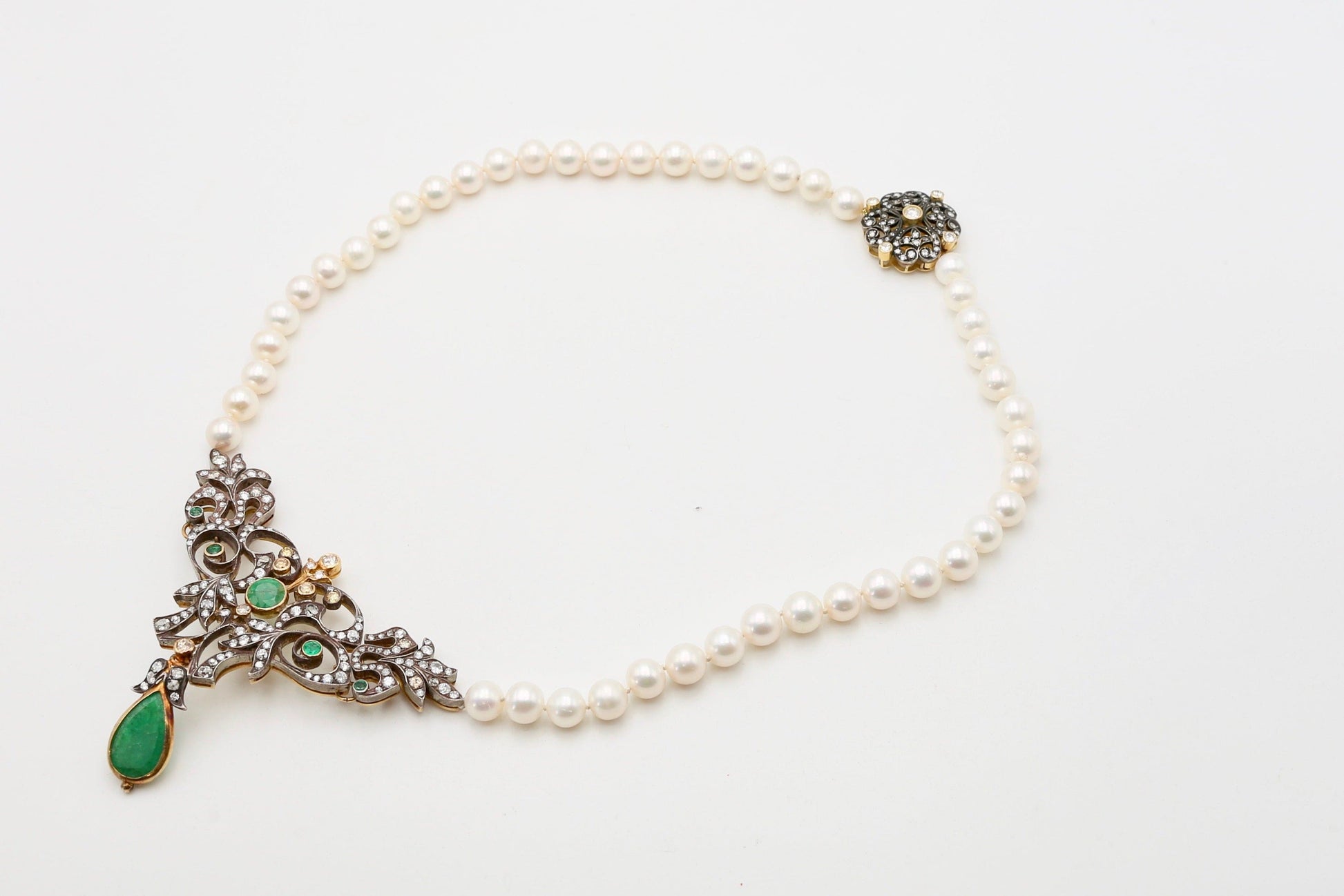 Meravigliosa collana in stile liberty realizzata in oro 18kt e argento 800 con una splendida goccia centrale di smeraldo naturale e una grande quantità di diamanti naturali taglio rosa.