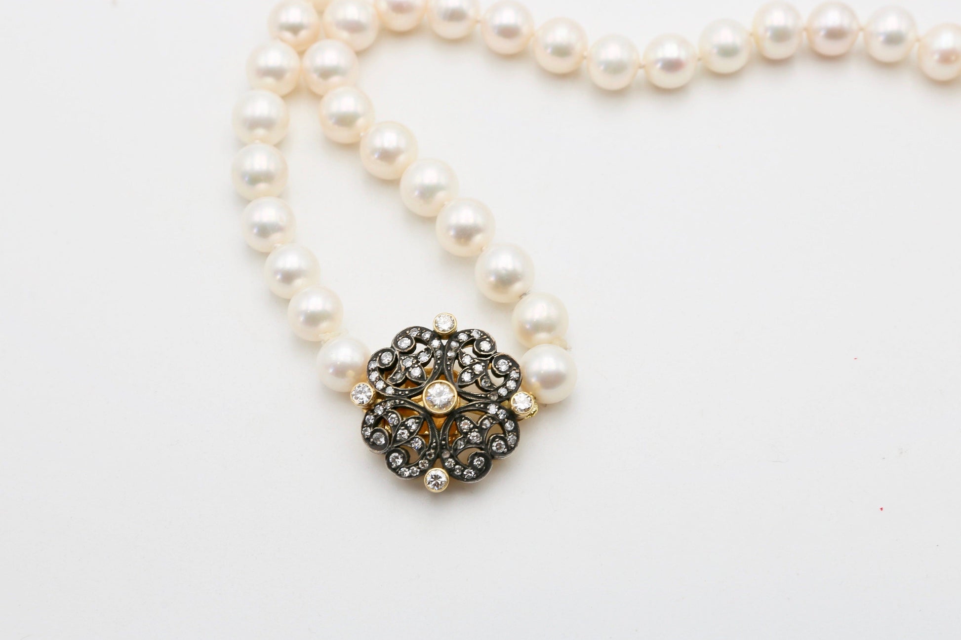 Il gioiello è composto da una deliziosa collana di perle "freesh water"" con una chiusura sempre in stile liberty perfettamente realizzata con importanti diamanti taglio brillante.