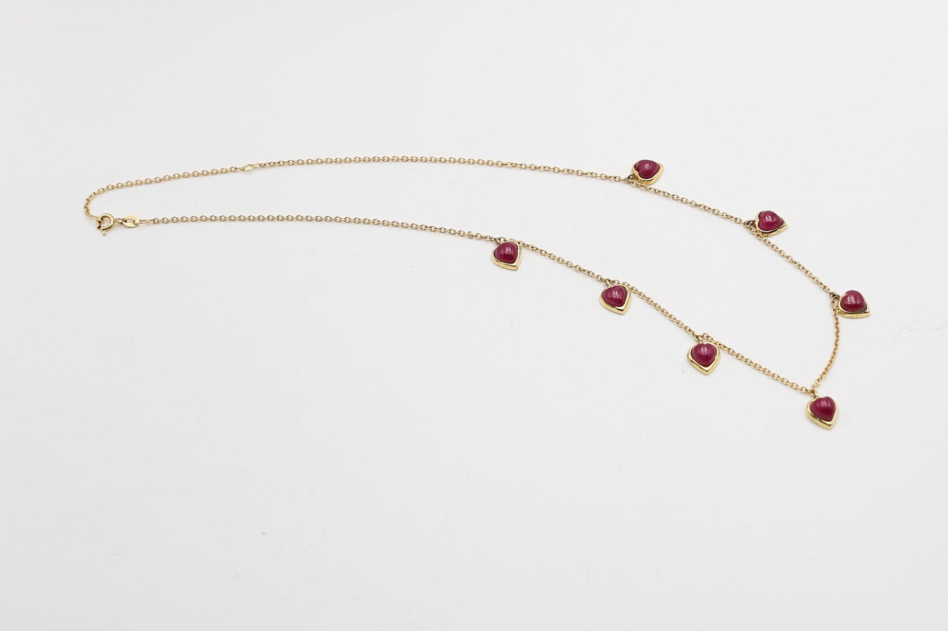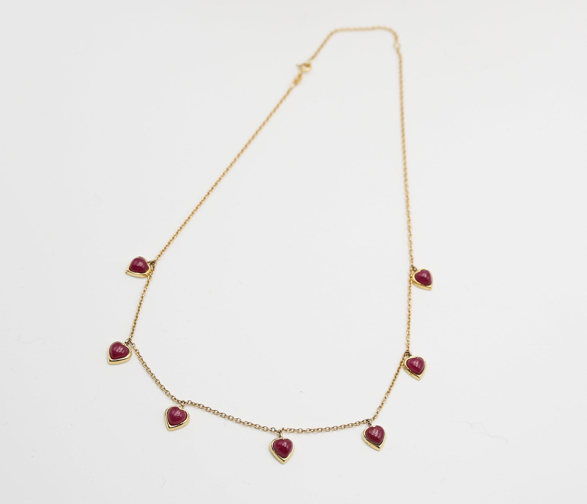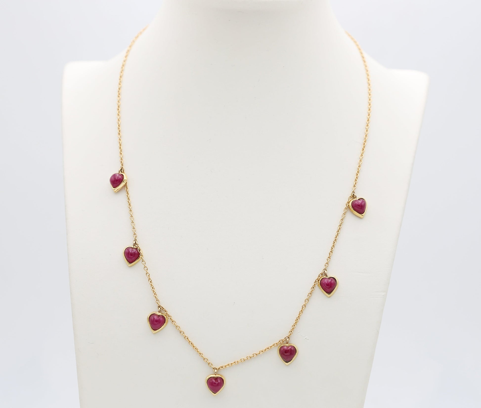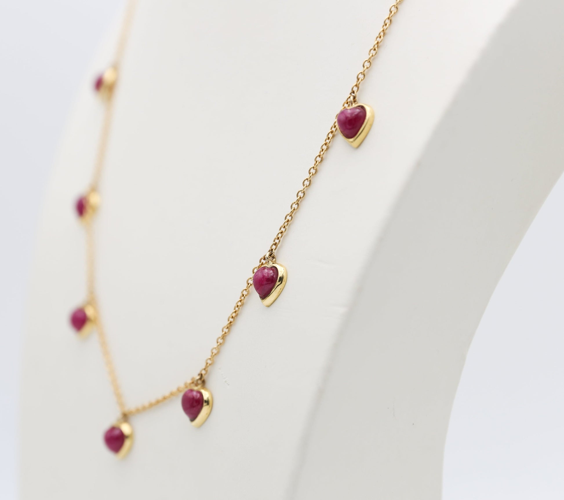 Collana in oro giallo 18 kt con maglia rollò, arricchita da sette pendenti a forma di cuore in rubino.