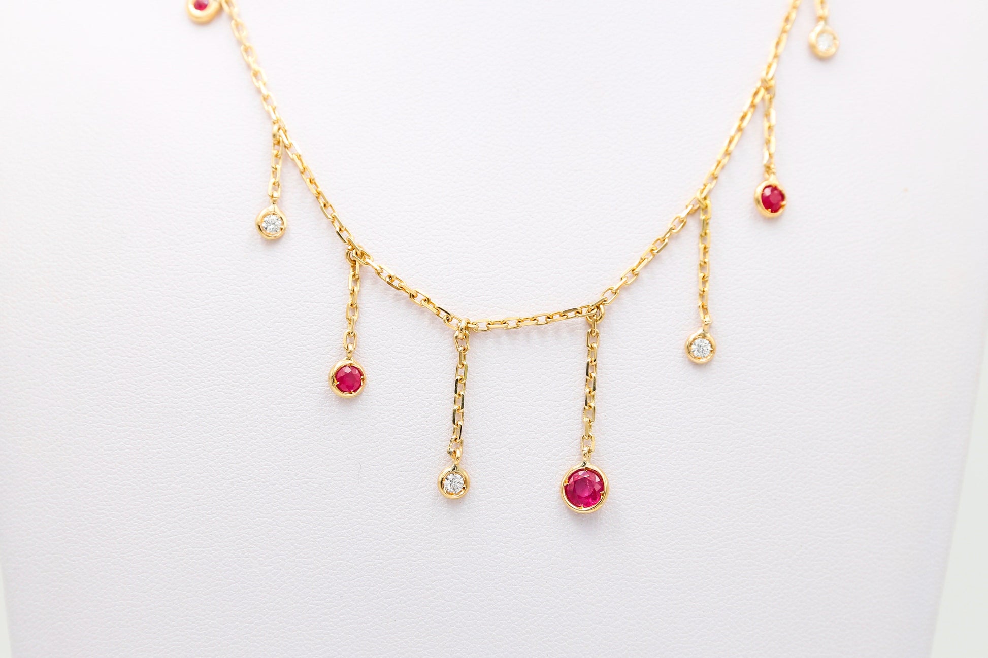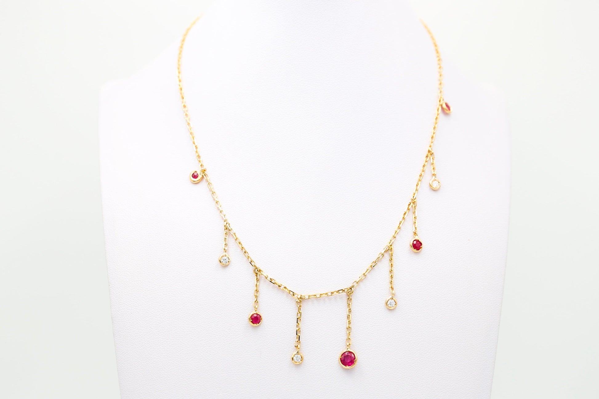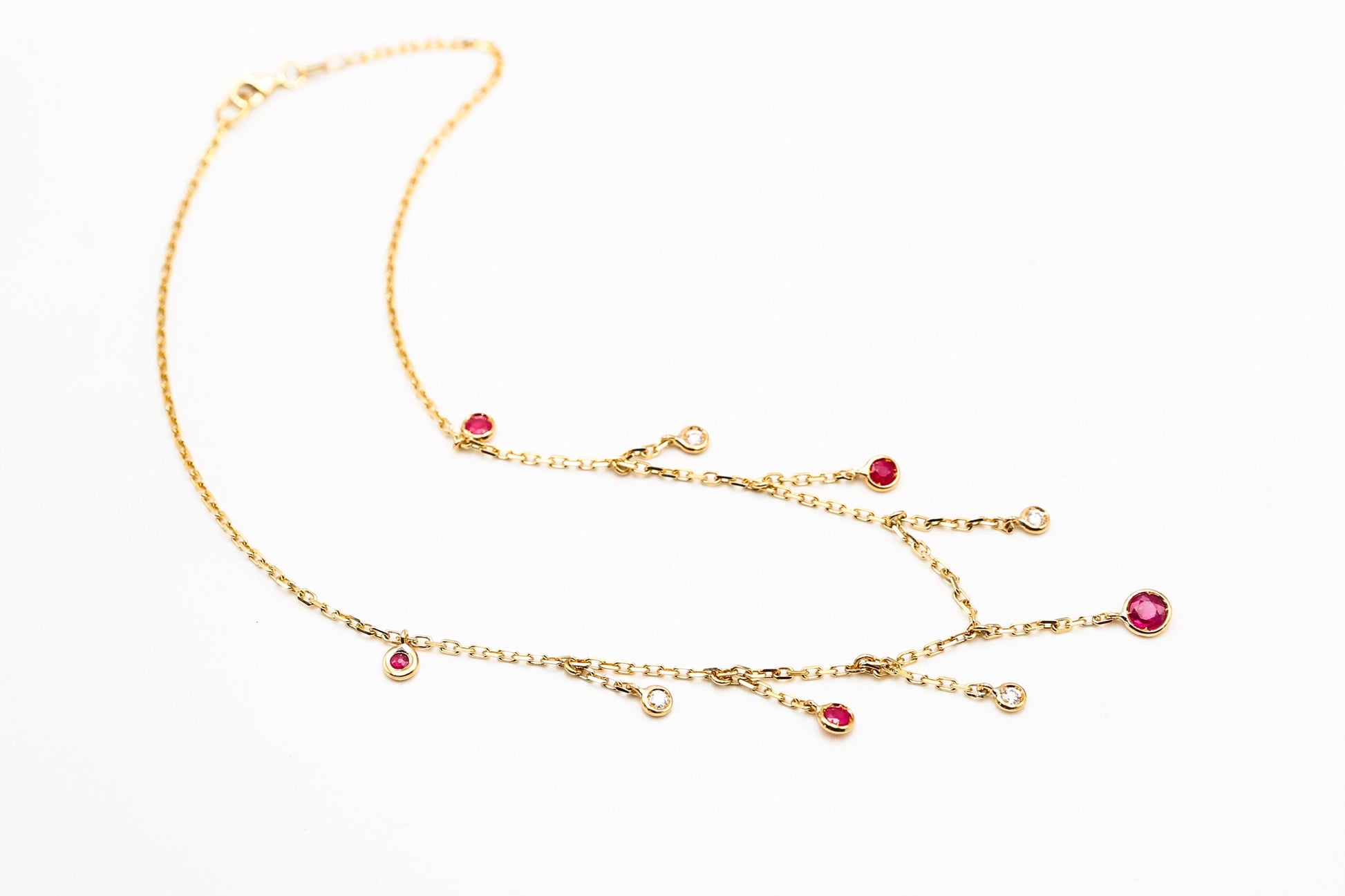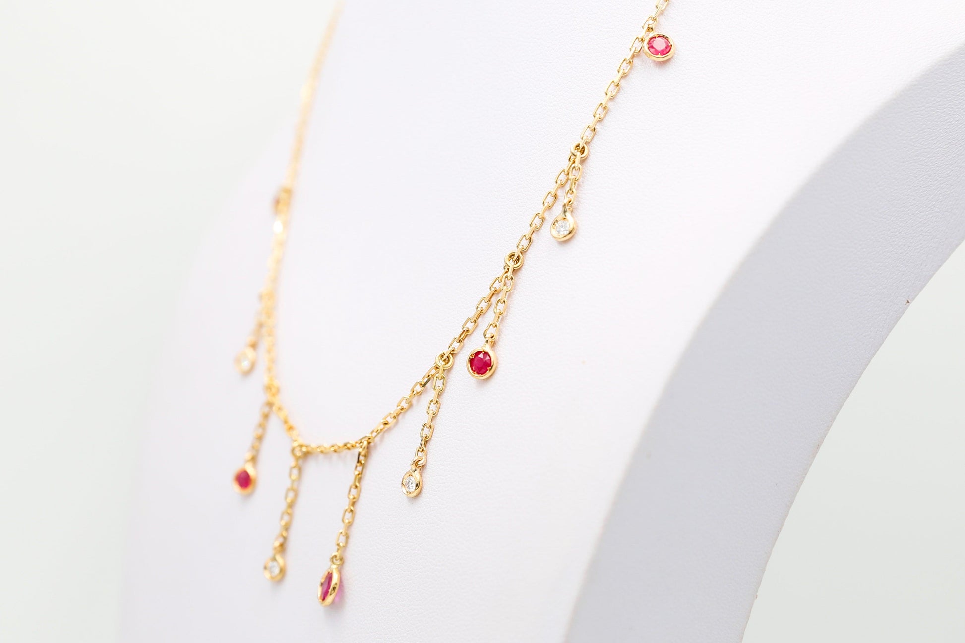 Collana in oro giallo a 18kt maglia rollò rettangolare con 9 pendenti di pietre tra diamanti e rubini alternati che daranno luce al vostro look rendendolo unico.
